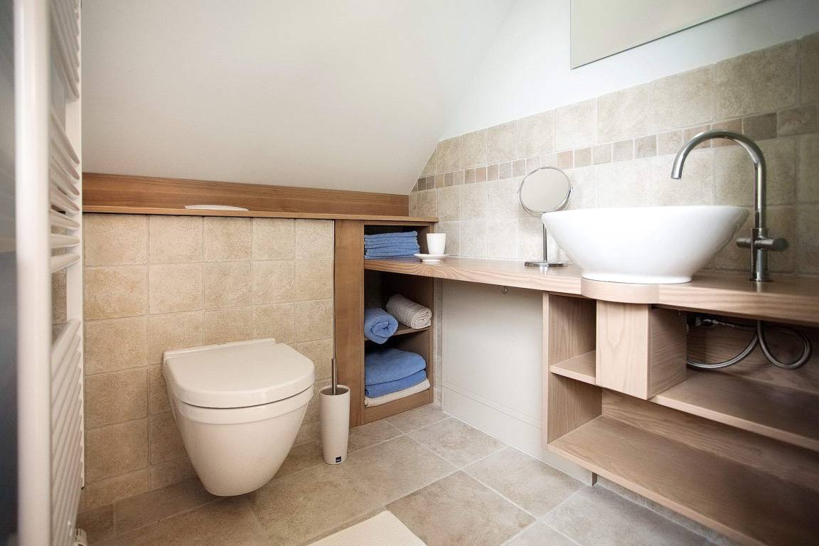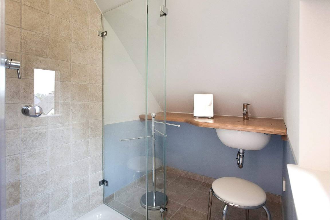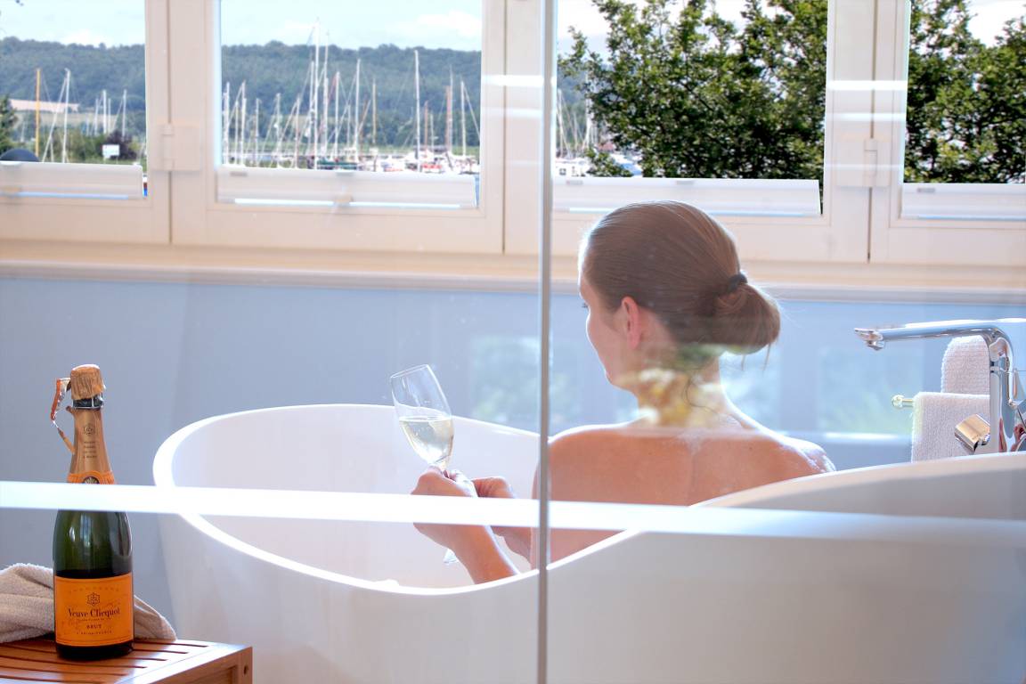 Das geflieste Bad ist durch eine Glasfront vom Schlafzimmer getrennt und verfügt über eine optisch extrem ansprechende, freistehende, englische Badewanne mit einem atemberaubenden Blick über die Lankener Bek in den Yachthafen von Seedorf mit den wundervollen Segelbooten. So kann man herrlich entspannen - unabhängig vom Wechsel der Jahreszeiten.