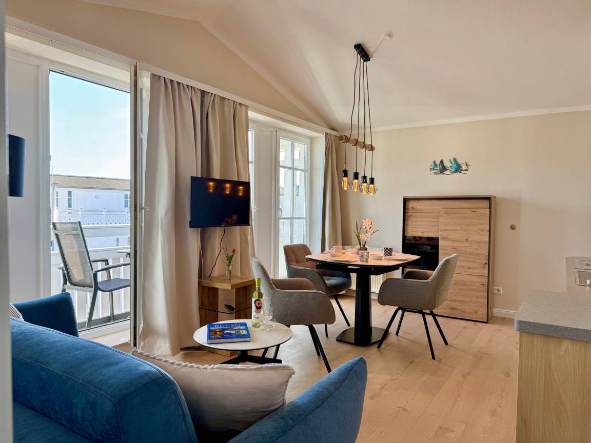 Die Ferienwohnung verfügt über kostenfreies WLAN und die Erstausstattung an Bettwäsche ist inklusive. Das Schlafzimmer verfügt über ein Doppelbett, im Wohnzimmer befindet sich zusätzlich eine Doppelschlafcouch. Darüber hinaus verfügt die Ferienwohnung über ein Bad mit Dusche/WC und Föhn. Die voll ausgestattete, offene Küche mit Mikrowelle, Kaffeemaschine und Toaster lässt keine Wünsche offen. Ein Fernseher inkl. 3 Sky-Sender rundet die Einrichtung ab. Nach einem erlebnisreichen Urlaubstag können Sie auf dem Balkon in Südostlage Platz nehmen. Der Ausblick und die Sitzgruppe sorgen hier für ein wunderbares Urlaubsgefühl. Im Nichtraucher-Apartment ist kein Haustier gestattet.