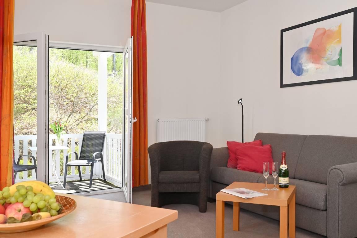 Ein Doppelbett, eine Doppelschlafcouch, ein Balkon, Küchenzeile mit Mikrowelle, Backofen und Tiefkühlfach, Bad (Dusche, WC), Fahrstuhl in das 2. Obergeschoss, kostenlose Sauna-Nutzung, Kinderbett und Kinderstuhl auf Anfrage kostenlos stellbar, kostenlose W-LAN-Nutzung, Münzwaschmaschine und Trockner, Parkplatz (entgeltlich, bitte im Voraus telefonisch buchen), Rauchen im gesamten Haus nicht erlaubt (aber auf dem Balkon möglich).