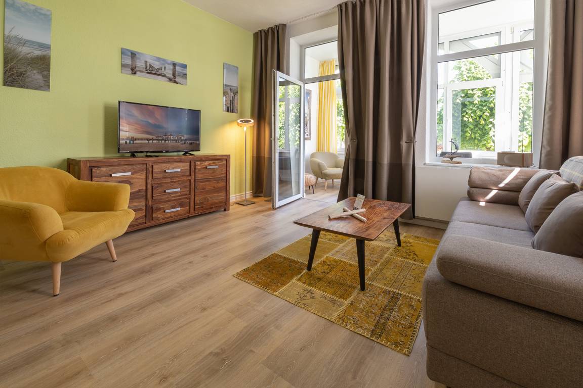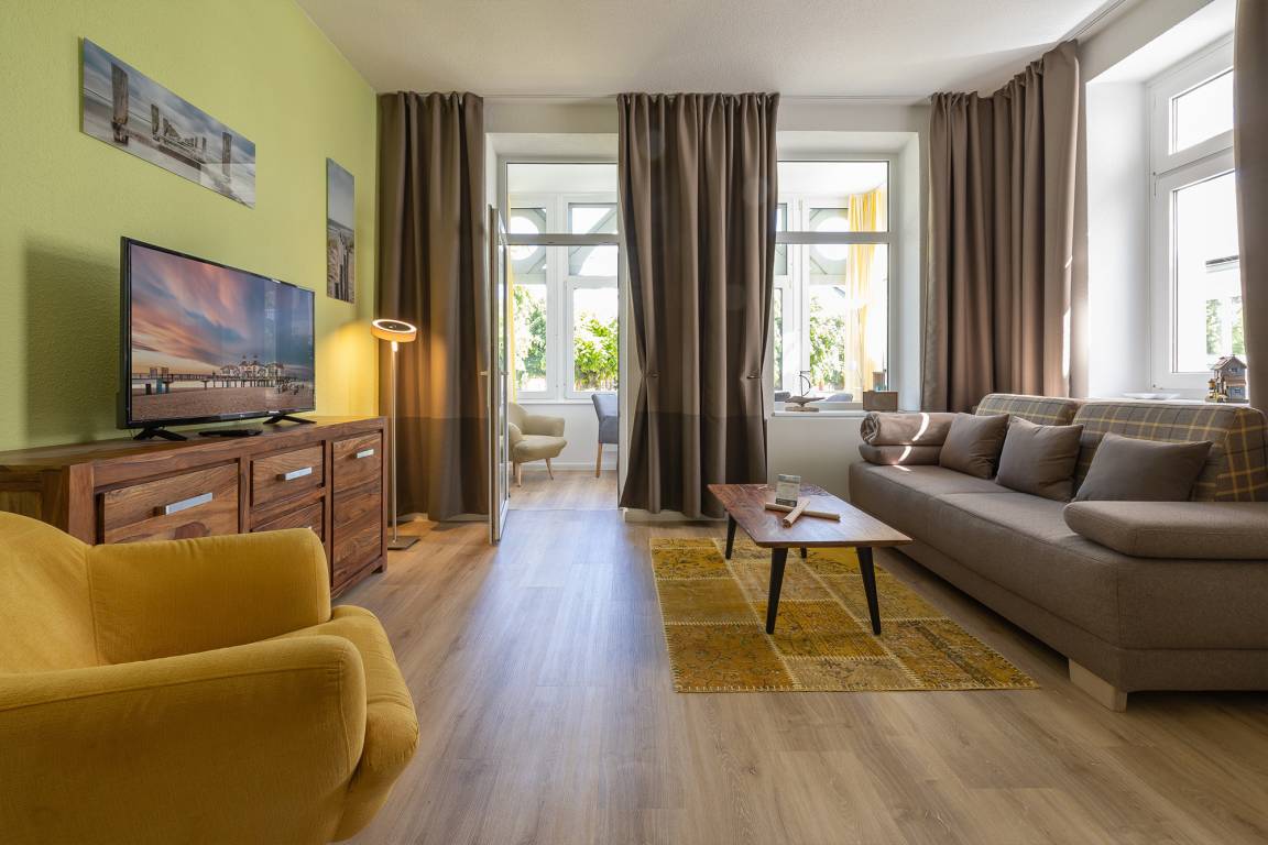 Der Wintergarten besticht durch seinen Blick auf die Wilhelmstraße, hier kann man bei einem Gläschen Wein seine Gedanken schweifen lassen oder einfach nur im wohnungseigenen W-LAN surfen.