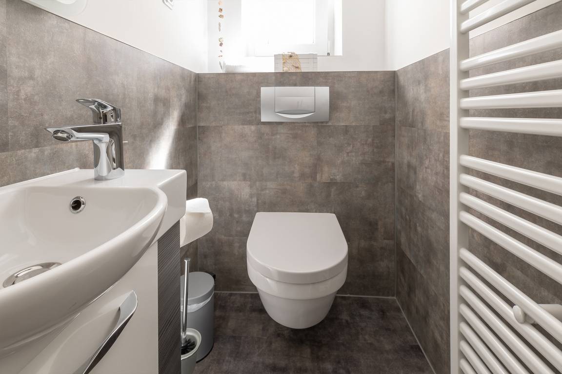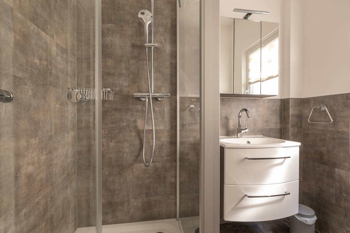 Für einen angenehmen Komfort im Badezimmer sorgen eine Dusche, Waschtisch und Haartrockner, sowie einem separaten WC mit Handwaschbecken.