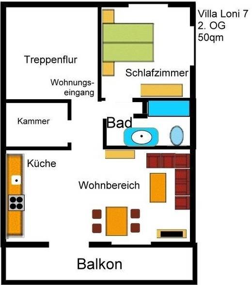 Die Ferienwohnung 7 (bis 2Erwachsenen und 1 Kind) ist im 2.OG der historischen Bädervilla „Villa Loni", bestehend aus 2 Räumen mit ca. 50 qm Wohnfläche und einem schönen Balkon in Bäderarchitektur zur Morgensonne.