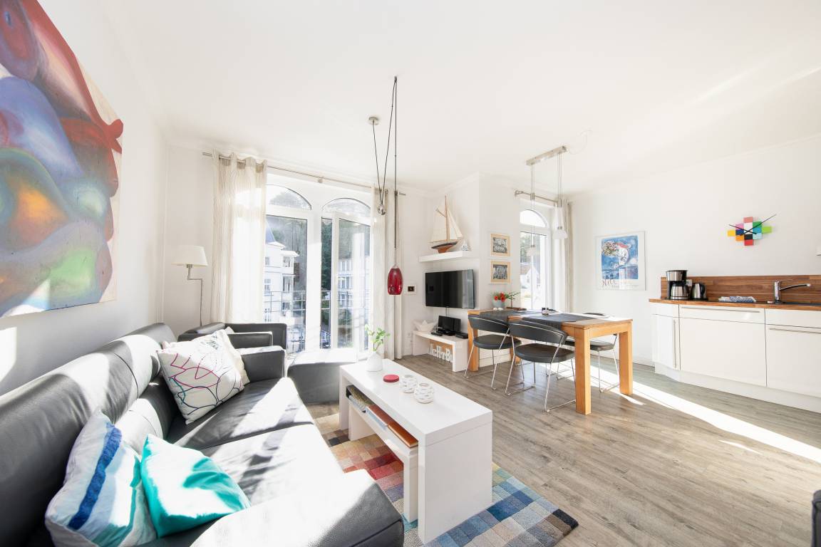 Unsere anspruchsvoll und komfortabel ausgestattete ca. 70qm große Nichtraucherwohnung befindet sich in der 3. Etage, ein Aufzug bringt Sie von dem eigenen Tiefgaragenplatz (Höhe 1,90 m)zu Ihrer Wohnung. Zwei im Sommer möblierte Balkone laden zum Relaxen und Sonnenbaden ein. Genießen Sie von dem Süd-Ost Balkon den Blick auf die prachtvollen Villen der Wilhelmstraße bis hin zur Ostsee. Die Villa Lena befindet sich direkt in der Wilhelmstraße inmitten prachtvoller Hotel- und Pensionsbauten mit ihren reich verzierten Balkonen und Veranden. Der Zugang zum Badestrand und zur Seebrücke mit Tauchgondel sind nur ca. 200m entfernt. Nette Restaurants, Cafes und Geschäfte laden zum Genießen und Bummeln ein. Für Naturliebhaber ergeben sich vielfältige Rad- und Wandermöglichkeiten.