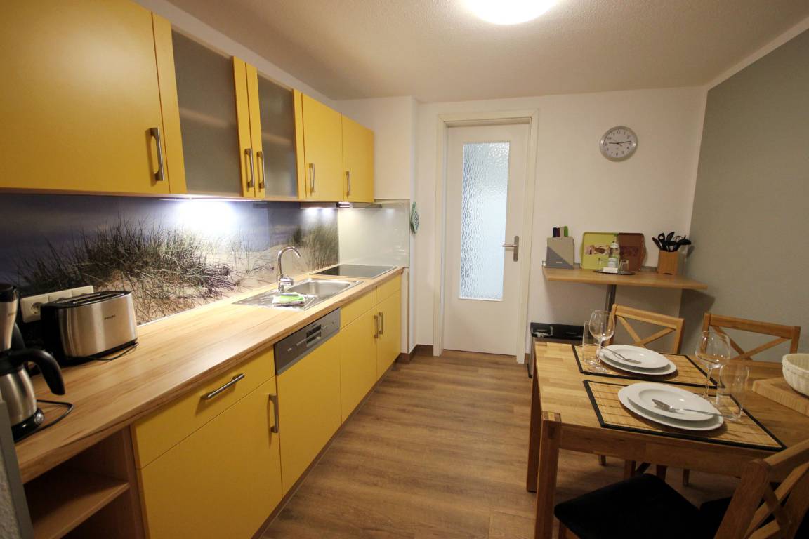 Ihre 2-Raum Nichtraucherwohnung 64RB2 befindet sich im Erdgeschoss des Hauses. Sie besitzt eine Größe von ca. 45 qm und ist für max. 4 Personen belegbar sowie komplett eingerichtet. Das Appartement teilt sich auf in einen gemütlichen Wohnbereich mit bequemer Sitzecke, separate Küche, ein Schlafzimmer und ein Tageslichtbad. Neben dem schönen Wohnraum mit Flachbildfernseher, WLAN und Radio mit CD-Player ist der Schlafraum mit einem weiteren Flachbild-TV, einem Doppelbett, Kleiderschrank und Verdunklungsmöglichkeit ausgestattet. Das komfortable Schrankbett im Wohnbereich bietet Schlafmöglichkeit für die 3. und 4. Person. Die Küche mit Essplatz für 4 Personen ist komplett mit 4-Platten-Herd, Dunstabzugshaube, Kühlschrank, Geschirrspüler, Kaffeemaschine, Wasserkocher, Toaster und weiteren diversen Küchenhelfern eingerichtet. Im Badezimmer erwartet Sie eine Dusche, WC, fest installierter Fön und ein Waschbecken. Als weiteres Highlight steht Ihnen im gemeinschaftlichen Gartenbereich eine extra Grillecke zum Verweilen sowie ein Spielturm mit Rutsche und Schaukeln zur Verfügung. Ein wohnungseigener PKW – Stellplatz sowie Unterstellmöglichkeiten für Ihre Fahrräder sind direkt am Haus vorhanden. Eine hauseigene Waschmaschine steht Ihnen gegen Gebühr zur Verfügung.