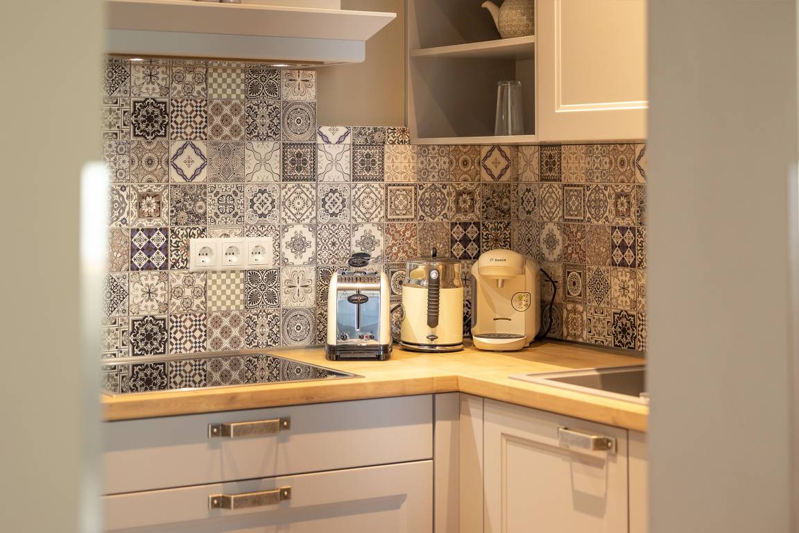 Die separate Küche ist mit einem Cerankochfeld, Backofen und Spülmaschine ausgestattet. Dazu kommen eine Kaffeepad Maschine der Marke Tassimo, Kühlschrank mit Gefrierfach, Wasserkocher, Toaster und eine Vielzahl an Küchenhelfern hinzu. Hier können Sie kleine Köstlichkeiten gerieren und Sie im Wintergarten mit Blick auf die Wilhelmstraße genießen. Ein Hochstuhl für unsere kleinen Gästen, steht Ihnen kostenfrei zur Verfügung.