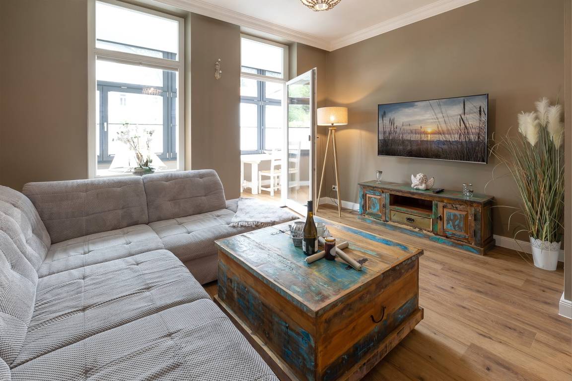 Die Ferienwohnung Spatzennest befindet sich in Hochparterre und bietet Ihnen einen unvergleichbaren Blick auf die Wilhelmstrasse. Es erwartet Sie auf rund 59 qm Wohnfläche eine gemütliche Unterkunft für bis zu vier Personen und einem Kleinkind bis 2 Jahre im Kinder-/Reisebett (in der der Ferienwohnung vorhanden). Die Einrichtung im Wohnzimmer überzeugt durch extravagante Möbel der Firma »Riverboat«. Zum Verweilen lädt die gemütliche Wohnlandschaft, die sich bei Bedarf in ein 160x200 cm großes Bett verwandeln lässt, ein. Ein großer Flachbild-TV sorgt für Unterhaltung in den Abendstunden.