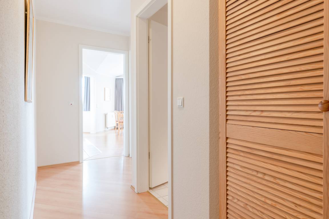 Zur Ausstattung der Ferienwohnung gehören kostenloses WLAN und eine Erstausstattung an Bettwäsche. Das Schlafzimmer verfügt über Verdunklungsvorhänge und ein Doppelbett, im Wohnzimmer steht zusätzlich eine Doppelschlafcouch zur Verfügung. Auch ein Bad mit Dusche und WC sowie eine voll ausgestattete offene Küche mit Mikrowelle, Kaffeemaschine und Toaster sind vorhanden. Ein Fernseher mit 3 Sky-Sendern rundet die Einrichtung ab. Auf dem Balkon in Südostlage können die Gäste den Ausblick und die Sitzgruppe genießen und sich entspannen. Die Wohnung ist Nichtraucher und Haustiere sind nicht erlaubt.