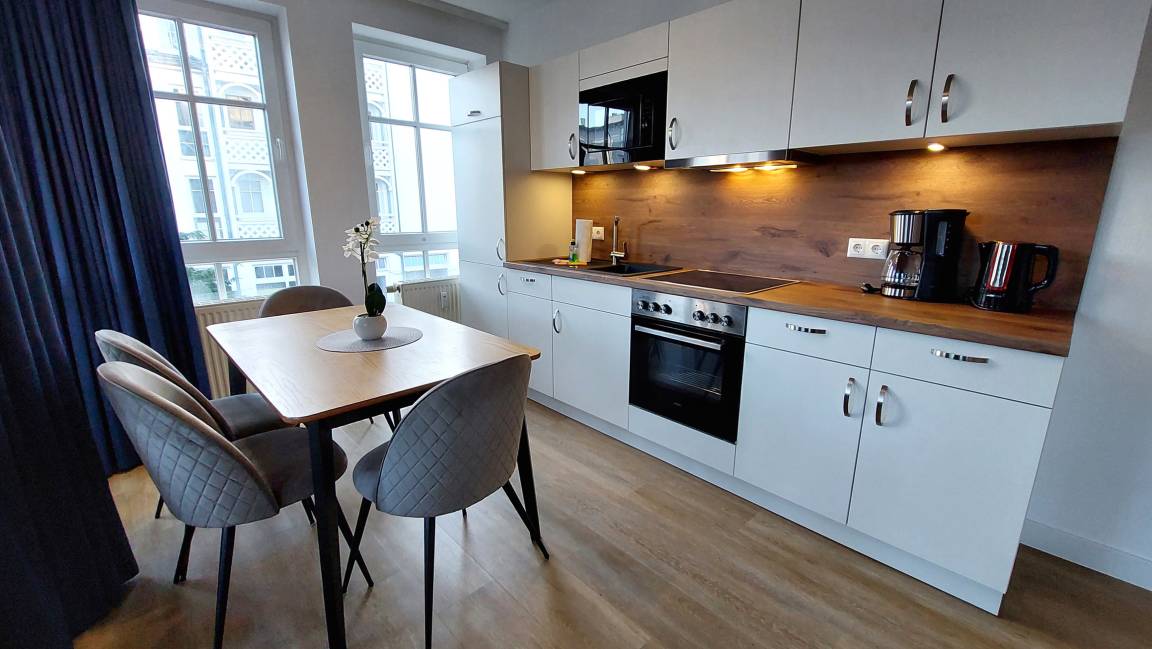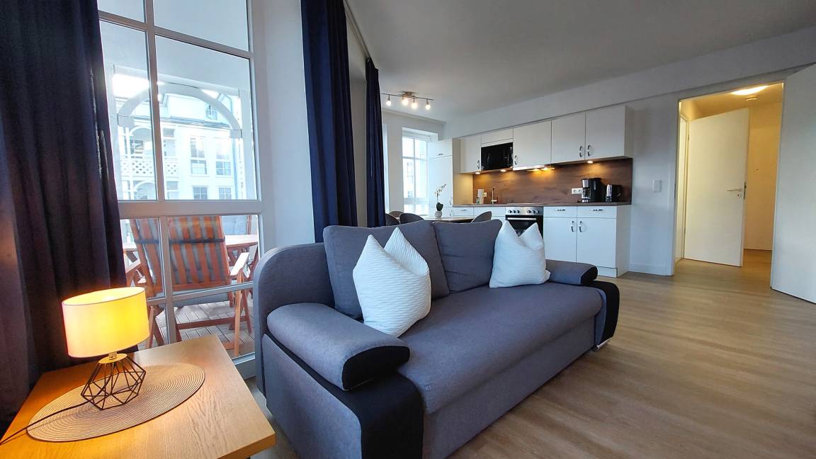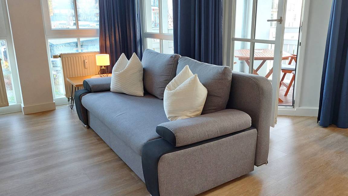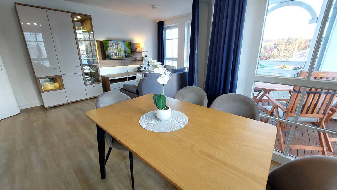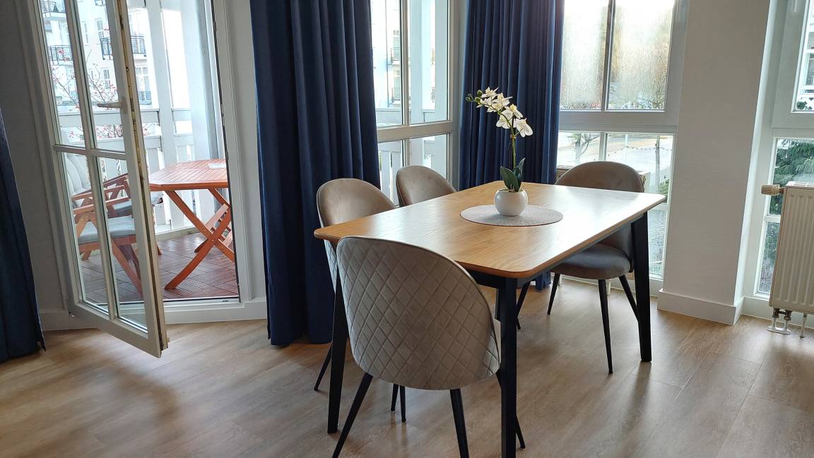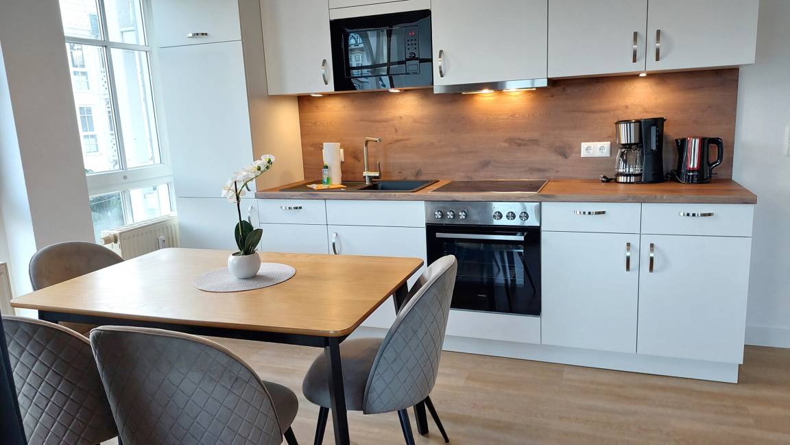 Das Wohn- und Esszimmer ist das Zentrum der Wohnung und verfügt über eine ausklappbare Sofalandschaft, die zum Entspannen einlädt. Für Unterhaltung bei jeder Wetterlage sorgen ein Smart-TV mit Blu-ray-Player, ein Radio mit CD-Player und eine kostenfreie WLAN-Verbindung. Der Essbereich bietet Platz für 4 Personen und es gibt Zugang zum möblierten und überdachten Eckbalkon in Richtung Nordosten. Die moderne Einbauküche ist komplett ausgestattet mit unter anderem einem Geschirrspüler, einem Kühlschrank, einer Mikrowelle, einem Cerankochfeld, einem Toaster, einer Kaffeemaschine und einem Wasserkocher.