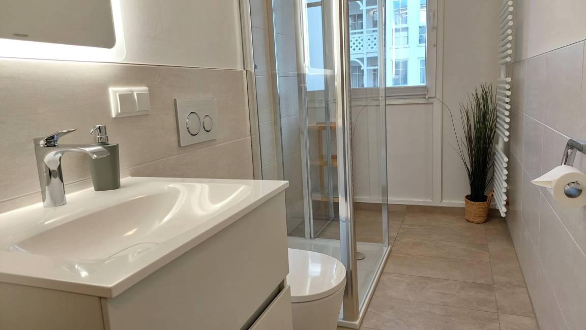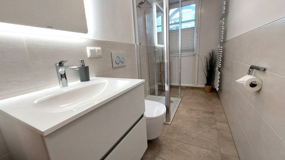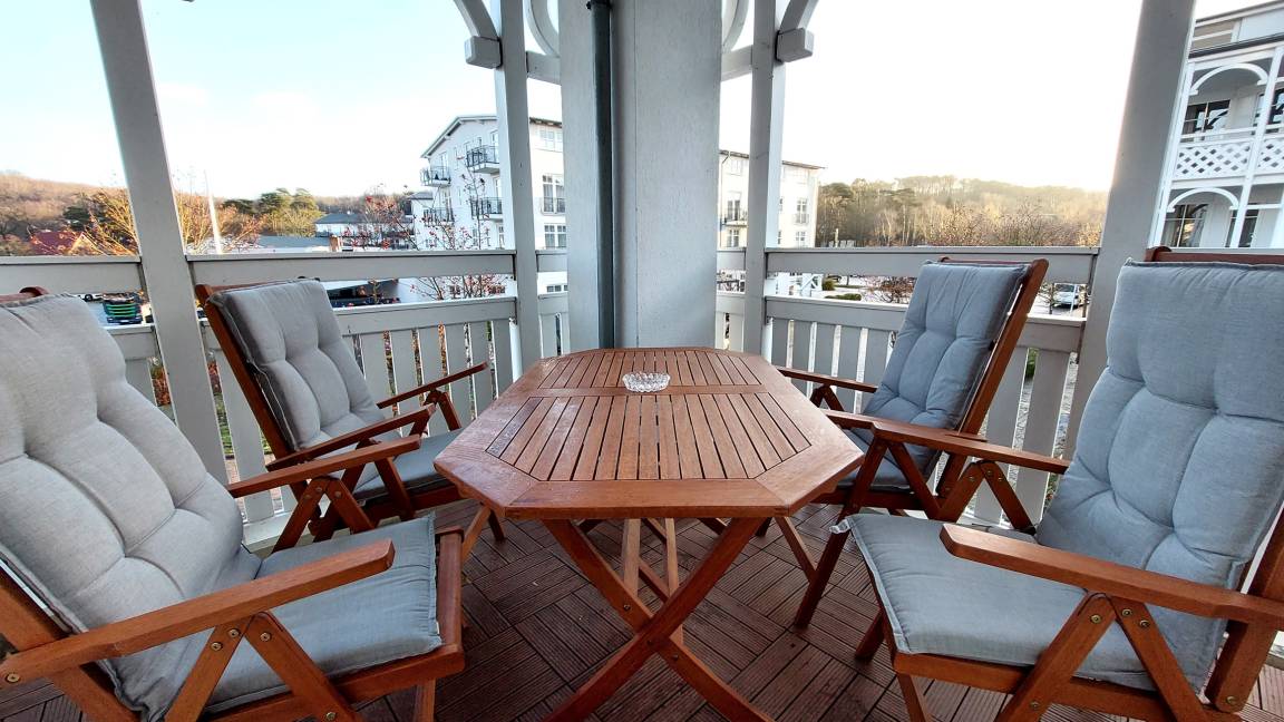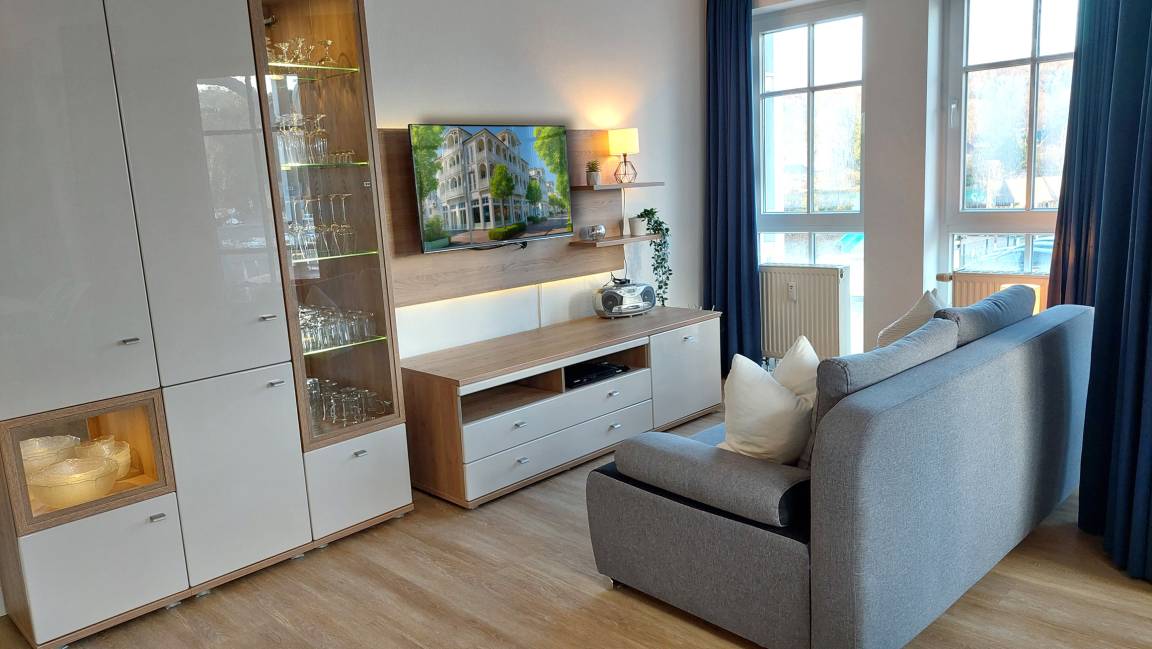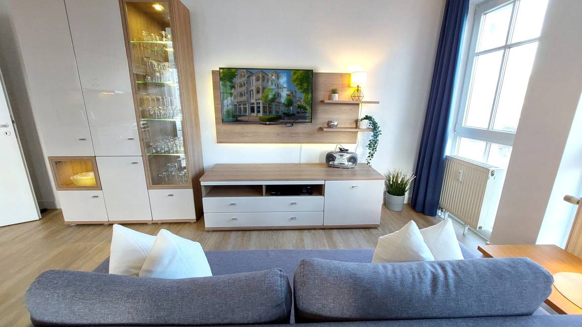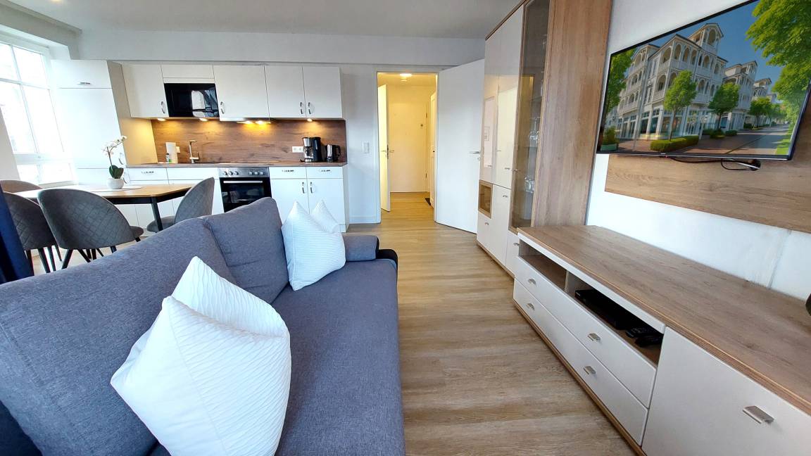 Das Wohn- und Esszimmer ist das Zentrum der Wohnung und verfügt über eine ausklappbare Sofalandschaft, die zum Entspannen einlädt. Für Unterhaltung bei jeder Wetterlage sorgen ein Smart-TV mit Blu-ray-Player, ein Radio mit CD-Player und eine kostenfreie WLAN-Verbindung. Der Essbereich bietet Platz für 4 Personen und es gibt Zugang zum möblierten und überdachten Eckbalkon in Richtung Nordosten. Die moderne Einbauküche ist komplett ausgestattet mit unter anderem einem Geschirrspüler, einem Kühlschrank, einer Mikrowelle, einem Cerankochfeld, einem Toaster, einer Kaffeemaschine und einem Wasserkocher.