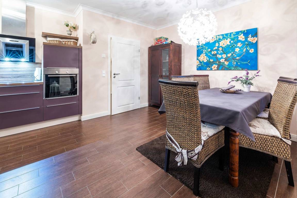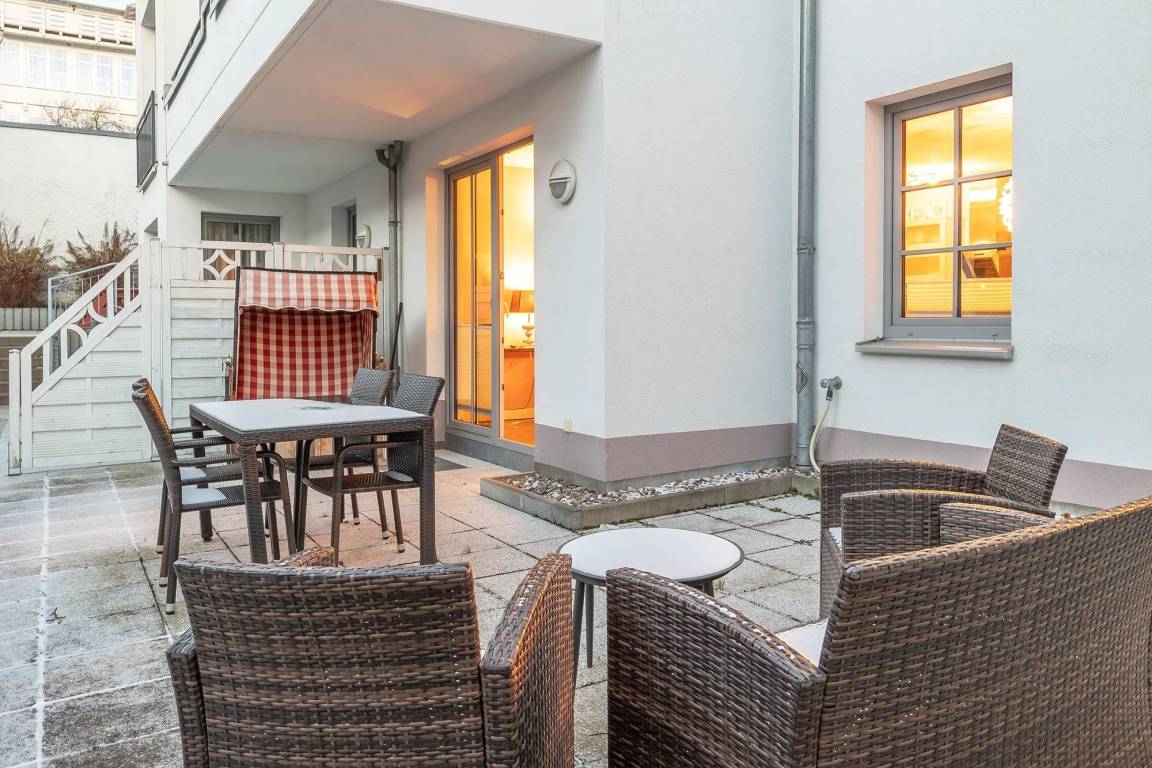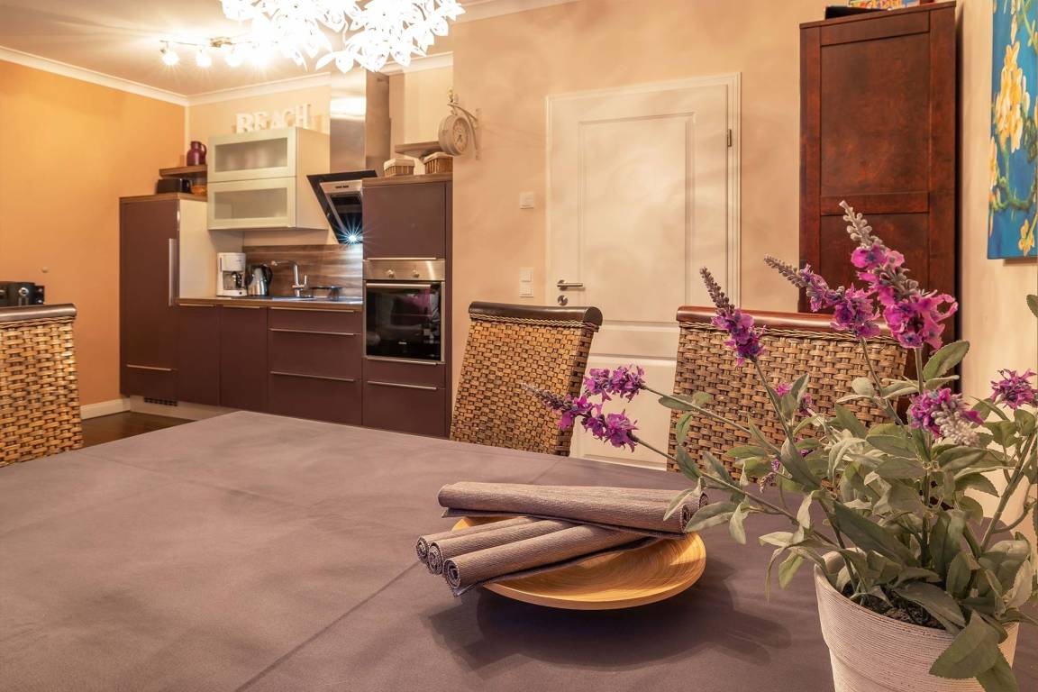 Die integrierte Küchenzeile lässt keine Wünsche offen, vom integrierten Cerankochfeld, Backofen, sowie einer Spülmaschine und diversem Kleininventar, können Sie hier Ihren Kochkünsten freien Lauf lassen. Kreieren Sie kleine Köstlichkeiten und genießen Sie diese bei einem Glas Wein in Ihrem Strandkorb auf der möblierten Terrasse.