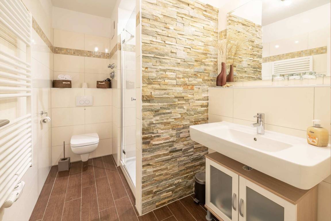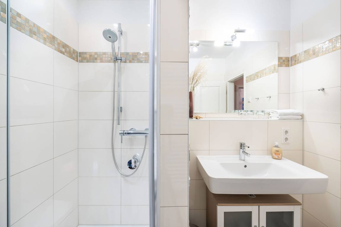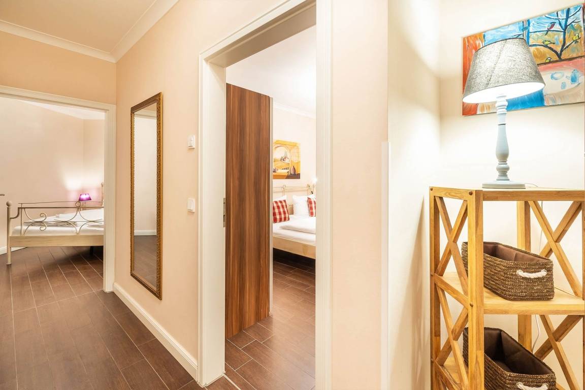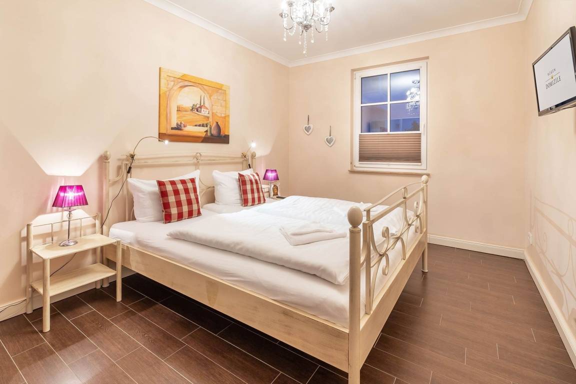 Als Ruckzugsort erwartet Sie in den beiden Schlafzimmern jeweils ein stilvolles Metallbett (180x200 cm) und ein großer geräumiger Kleiderschrank. Die Ferienwohnung verfügt über ein modernes Duschbad.