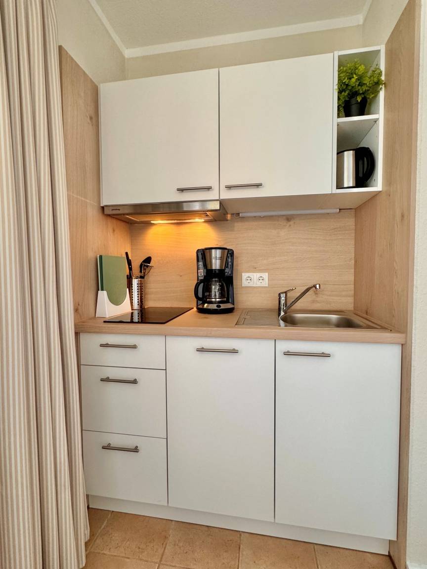 Die Ausstattung umfasst unter anderem einen Flachbild-TV mit Sky-Sendern, eine Kaffeemaschine (Filter), eine Mikrowelle sowie eine Küche mit Pantry/Mini. Zusätzlich ist die Bettwäsche bereits inklusive. Auch Ihr vierbeiniger Begleiter ist in dieser Unterkunft herzlich willkommen.