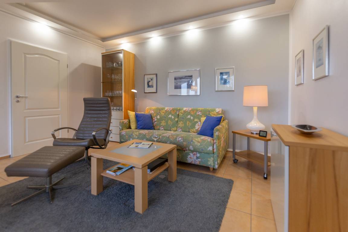 Im hellen Wohnbereich begrüßt sie die bequeme Couchgarnitur, welche ebenso für eine Aufbettung für eine weitere Person genutzt werden kann. Der Flachbild-TV, die große Glasfront und die indirekte, warme Beleuchtung runden das gemütliche Ambiente ab. Ein kleiner Essbereich und die offene Küche schließen sich türlos an den Wohnbereich an.