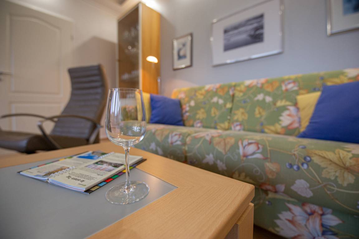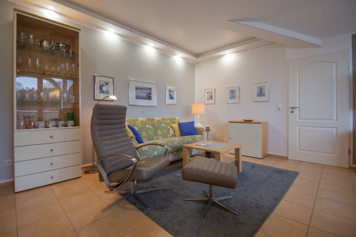 Von hier aus erreichen Sie auch den großen, überdachten Balkon. Komfortable Gartenmöbel mit entsprechenden Auflagen und ein eigener Strandkorb stehen Ihnen beispielsweise für ein sonniges Frühstück zur Verfügung.