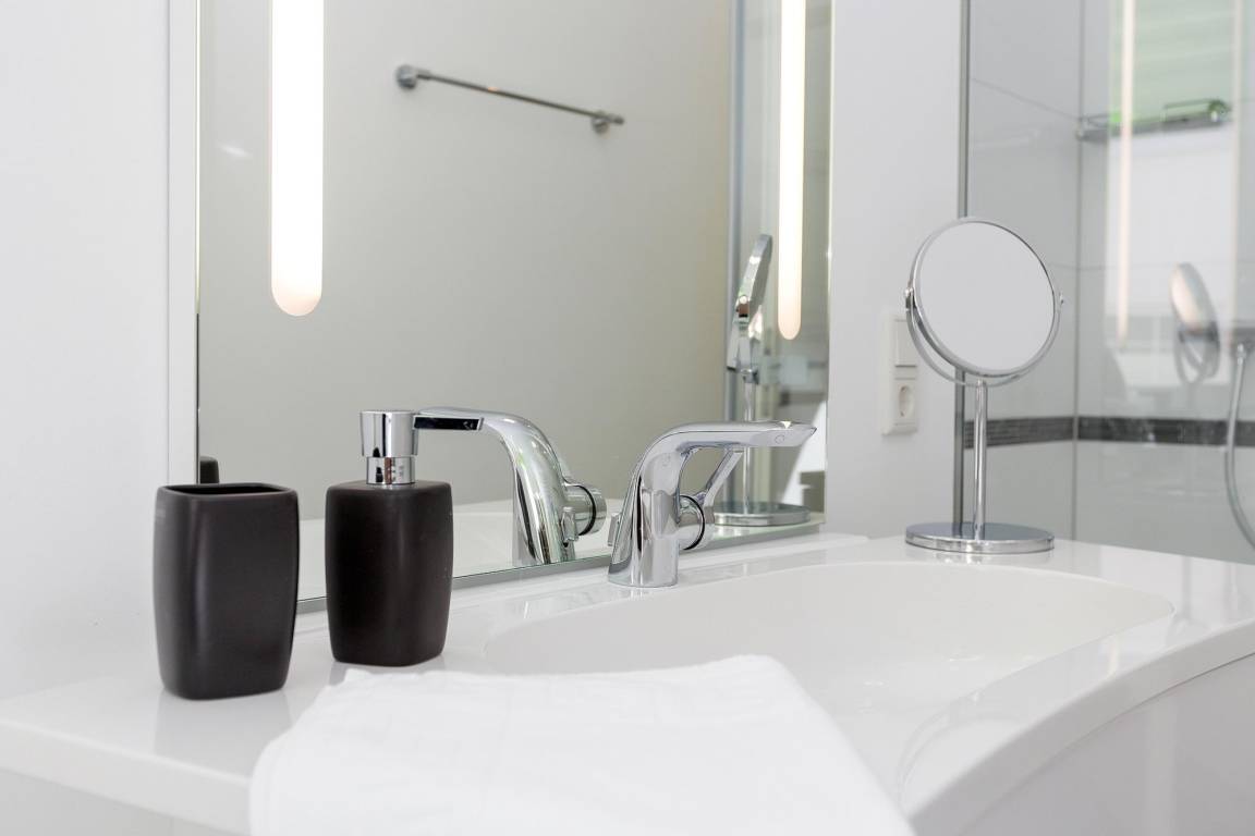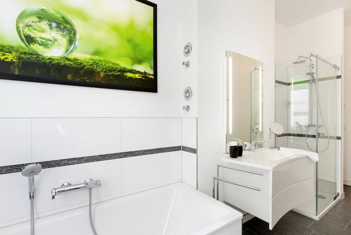 Im Schlafzimmer empfängt Sie ein wunderbar bequemes Doppelbett, in dem es sich ganz vorzüglich entspannen und träumen lässt. Und auch das Badezimmer ist bemerkenswert: Eine große bodentiefe Dusche, eine Badewanne, ein gut beleuchteter Waschtisch, WC und Bidet sorgen in dem edel gefliesten Raum mit Tageslicht für Wohlbehagen.