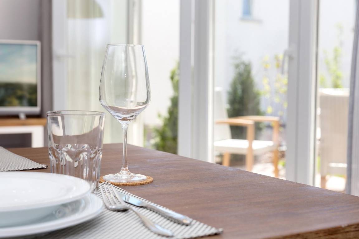 Auf der ruhigen Hofseite zur Abendsonne hin gelegen, bildet der geräumige Wohn- und Kochbereich den Mittelpunkt Ihrer Ferienwohnung. Die elegante Küchenzeile ist mit einem Ceranherd inkl. Backofen, Geschirrspüler, Kühlschrank, Kaffeemaschine, Toaster und Wasserkocher bestens ausgestattet. Auf der Terrasse vor dem Wohnzimmer kann man bei schönem Wetter wunderbar entspannen und bei einem edlen Tröpfchen Wein den Tag ausklingen lassen. Ein großformatiger LED-TV, eine Musikanlage, eine kleine literarische Auswahl und natürlich auch kostenfreies W-LAN sorgen für Unterhaltung und Abwechslung.