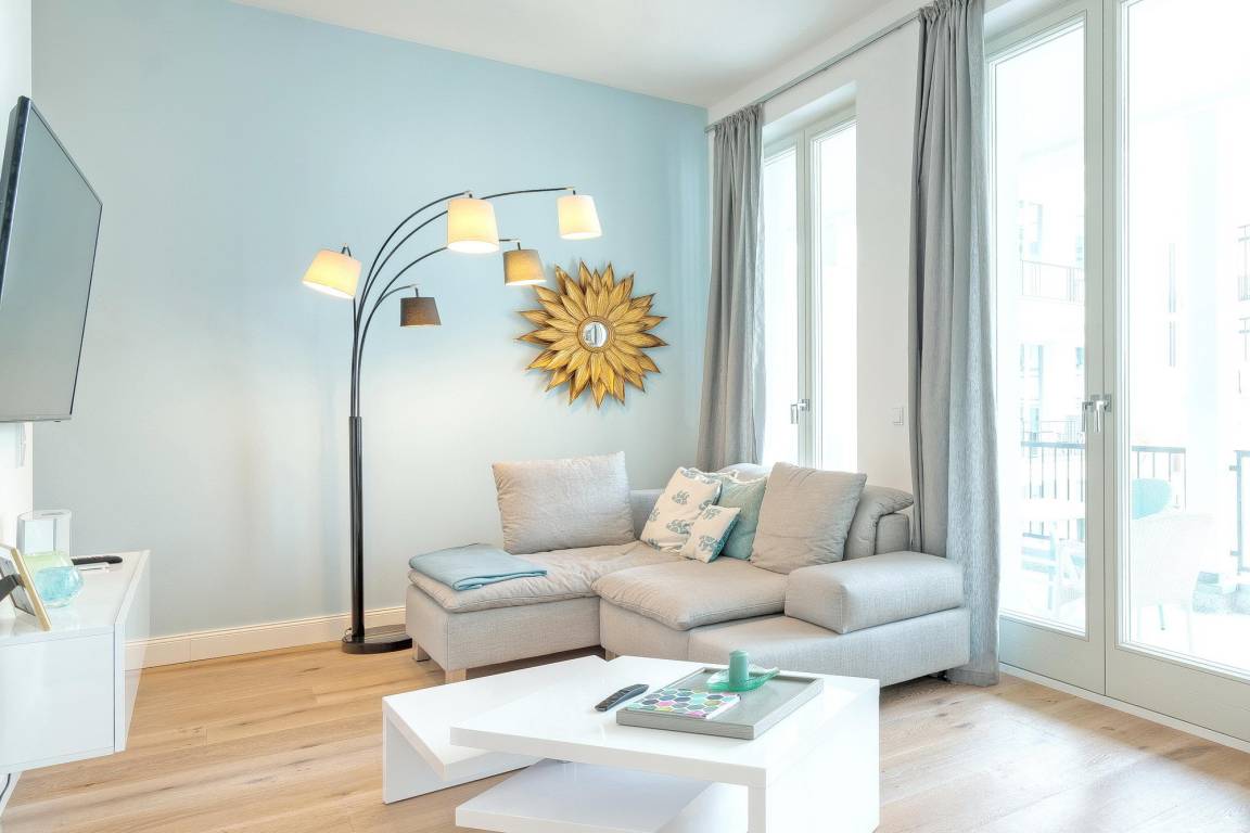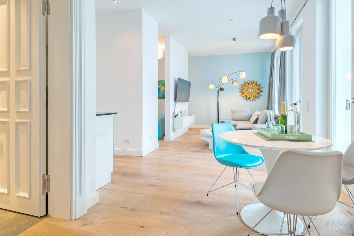 Die Ferienwohnung ist wie das gesamte Haus sehr hochwertig eingerichtet. Das Wohnzimmer ist mit einem Schlafsofa auf dem eine 3. Person schlafen kann, großem Flatscreen, Bluetooth-Tower von Bose und kostenfreiem WLAN einer offenen Küche die mit hochwertigen Markenprodukten ausgestattet ist. Das Schlafzimmer überzeugt mit einem gemütlichen Boxspringbett (180 x 200 cm) und einem Flachbildfernseher.