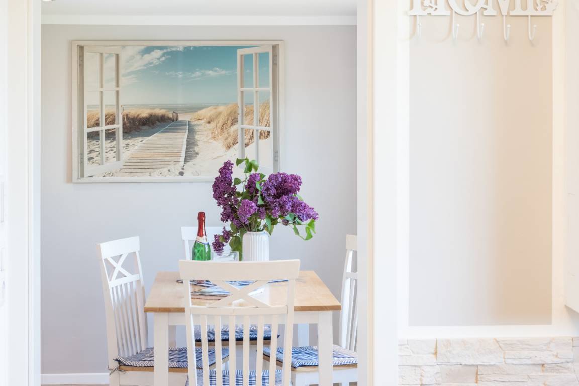 Das Ferienhaus ist geschmackvoll im Landhausstil eingerichtet und verfügt über ein Wohn-/Esszimmer mit Küchenzeile, ein Schlafzimmer mit Boxspringbett und ein Badezimmer mit Dusche.