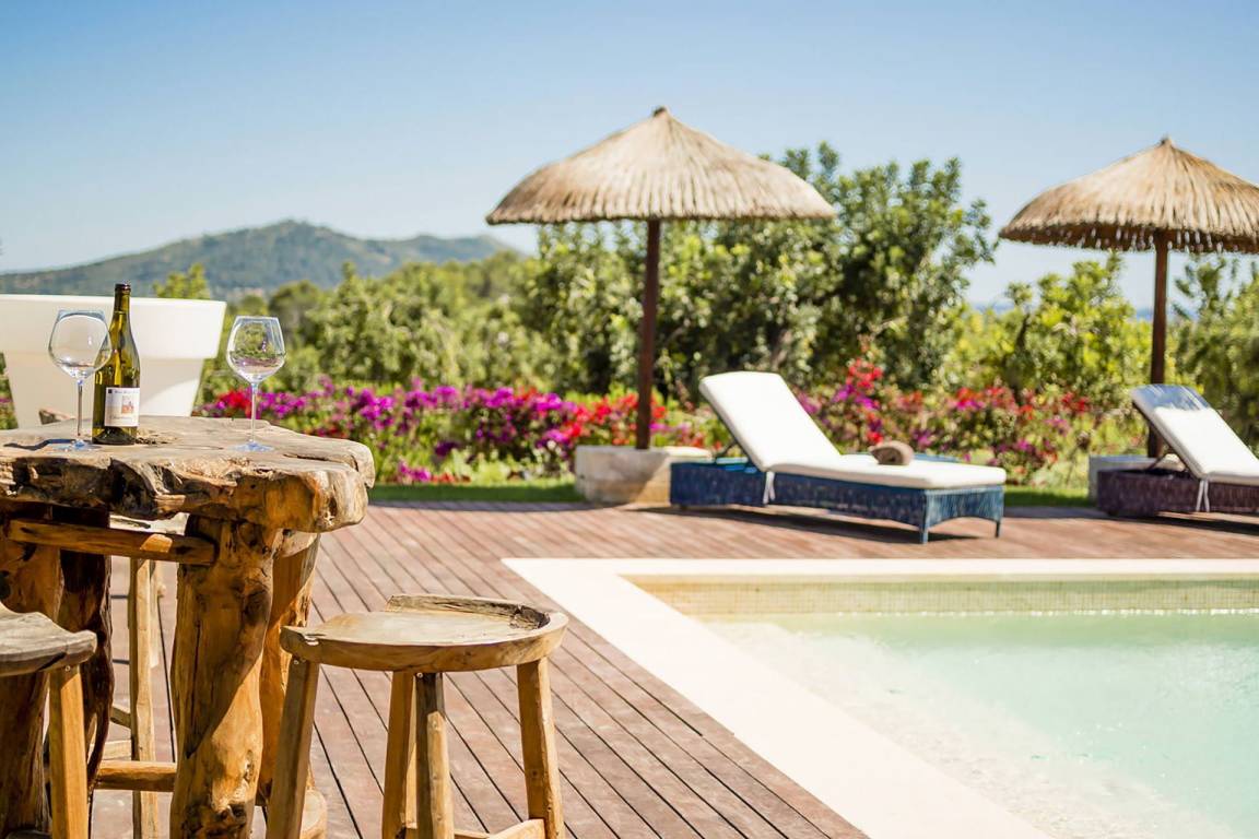 Das Außengelände erstreckt sich über einen großzügigen, von Natur umgebenen Bereich. Ein beheizter Salzwasserschwimmbad mit den Maßen 10,5 x 4,70 Meter und einer Tiefe von 1,60 Meter wird ergänzt durch eine Holzterrasse mit Sonnenliegen, Sonnenschirmen, einem Bali-Bett und einem Chill-out-Bereich. Eine Veranda von 15 x 5 Metern mit Kamin mit offenem Herd bietet den idealen Rahmen für Sommerabendessen. Ein separates kleines Haus mit Grill und Holzofen steht den Gästen zur Verfügung.