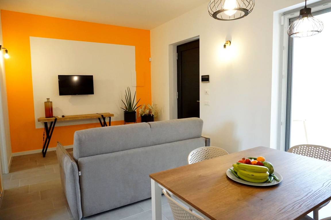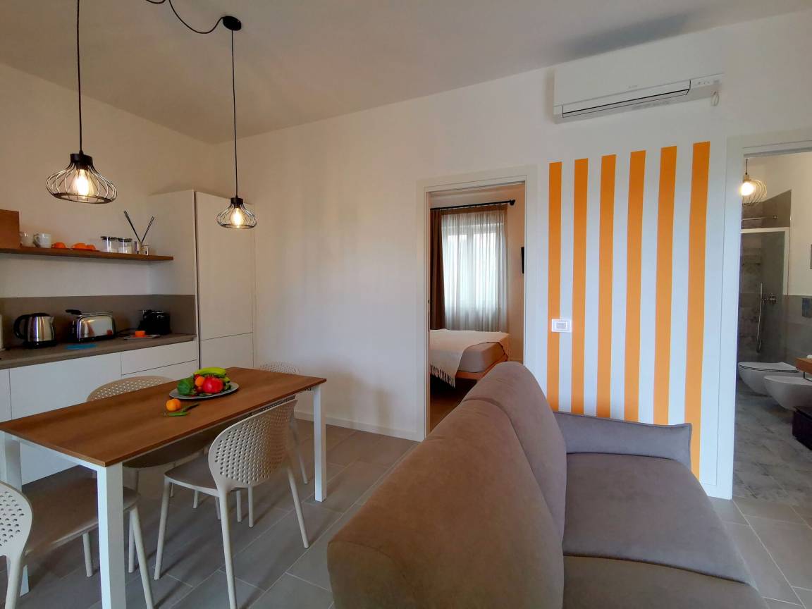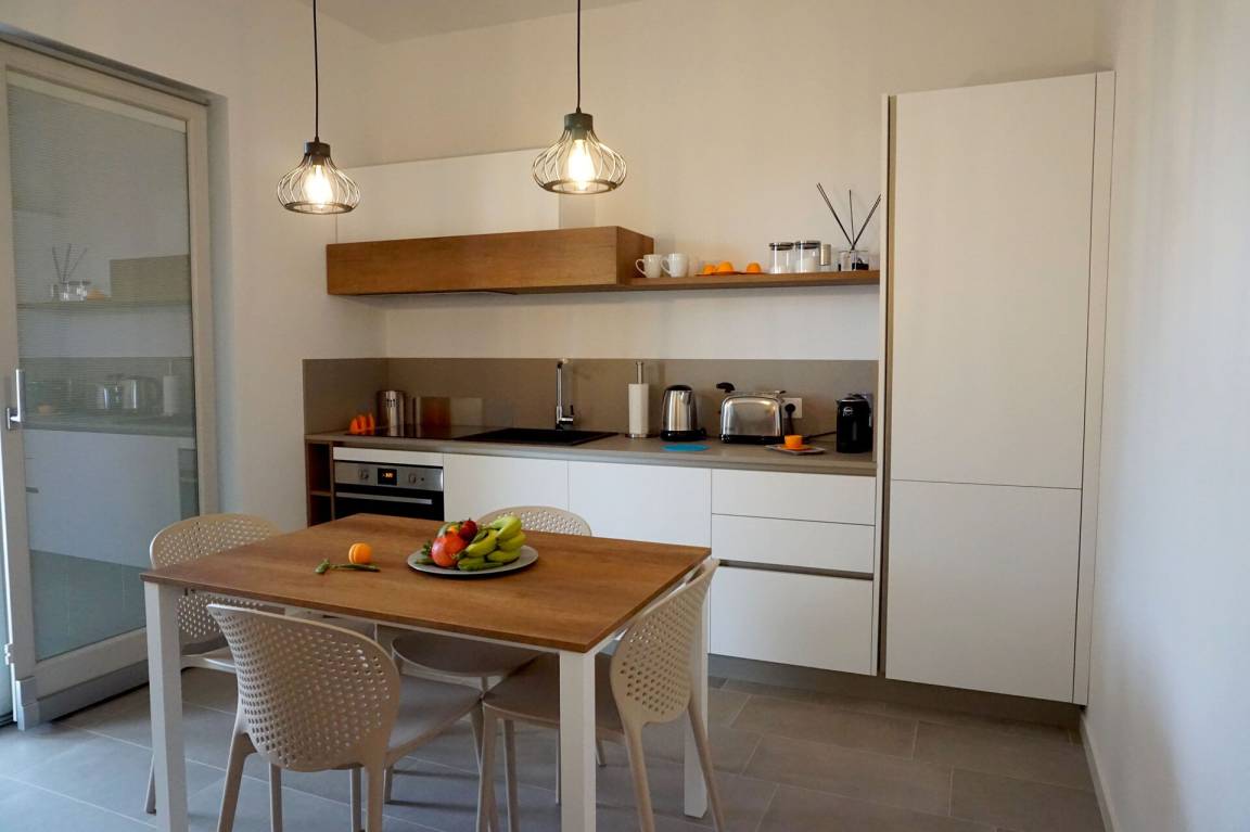 Wohnküche: gut ausgestattete Küche, Esstisch, Spülmaschine, Kühlschrank, Tiefkühler, Herd, Ofen, Toaster, Italienische Kaffeemaschine, Doppel-Schlafsofa, WiFi Internet, Klimaanlage, TV, Ausgang auf die Veranda.