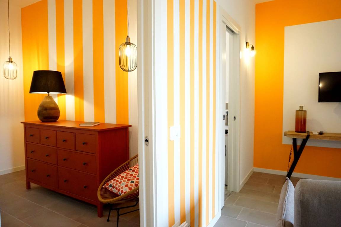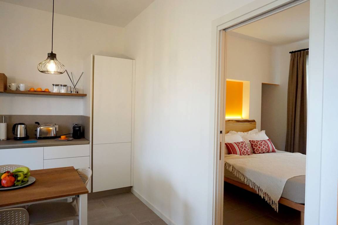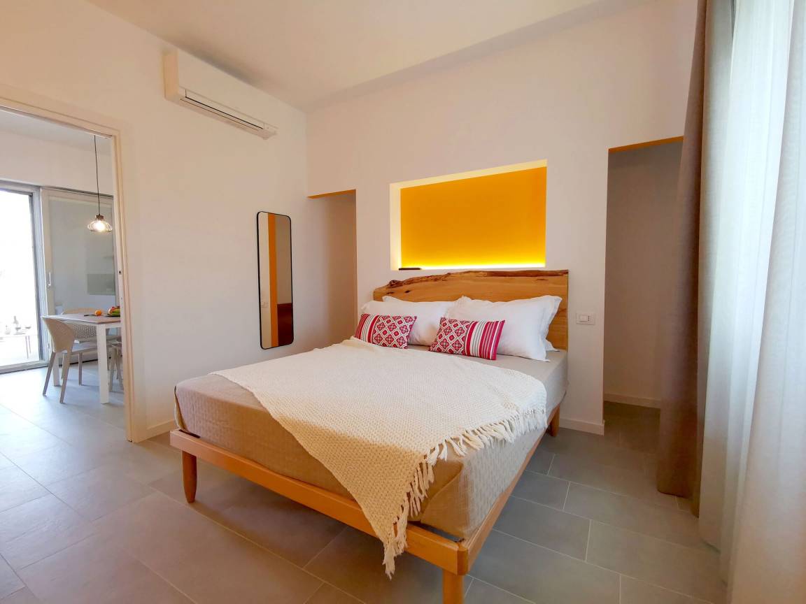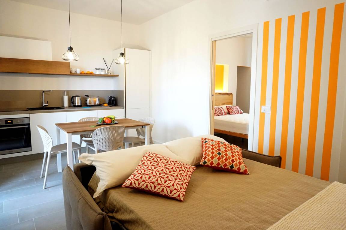 Wohnküche: gut ausgestattete Küche, Esstisch, Spülmaschine, Kühlschrank, Tiefkühler, Herd, Ofen, Toaster, Italienische Kaffeemaschine, Doppel-Schlafsofa, WiFi Internet, Klimaanlage, TV, Ausgang auf die Veranda.