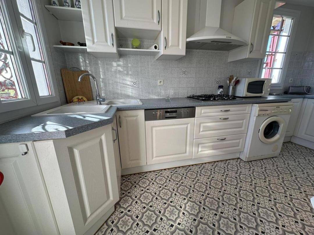 eine ausgestattete Küche (Geschirrspüler, Waschmaschine, 4 Kochplatten, Backofen, Mikrowelle),