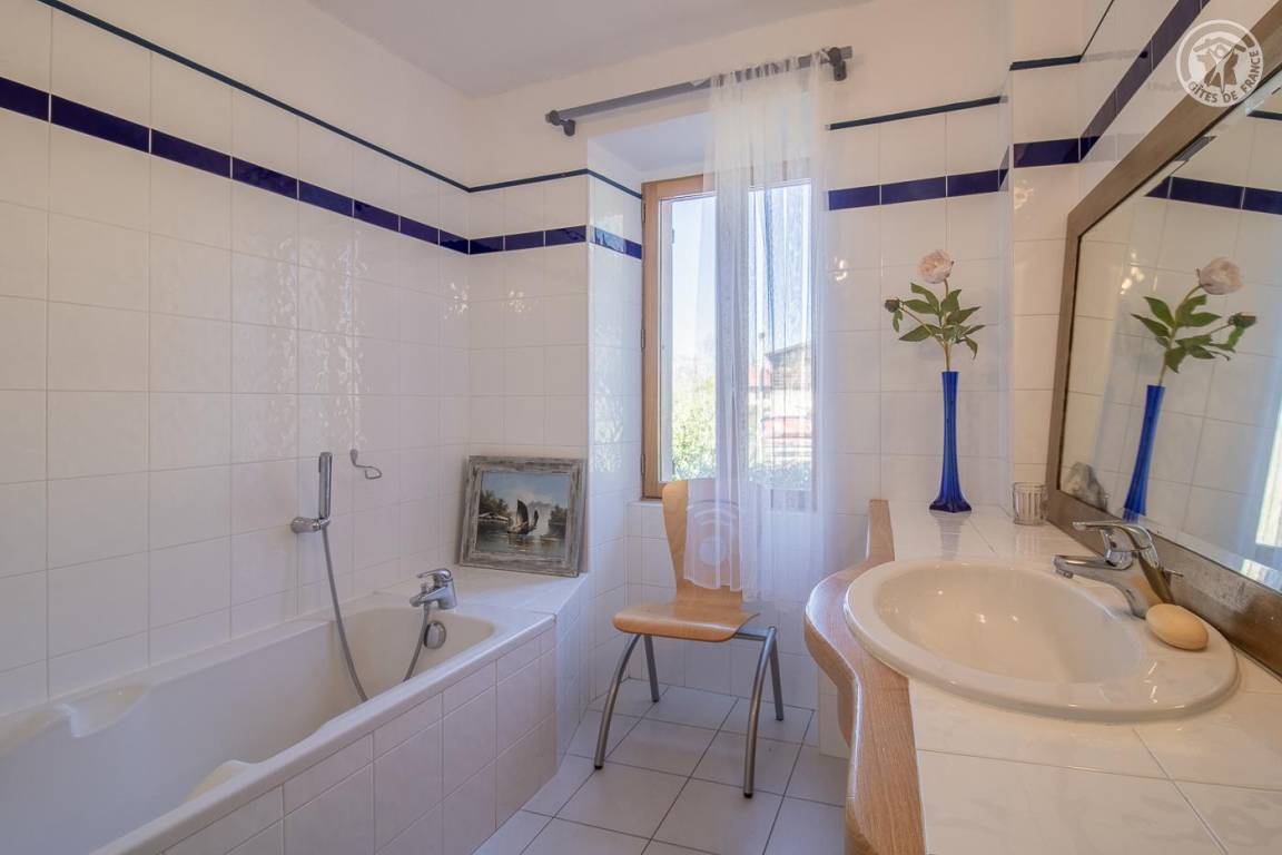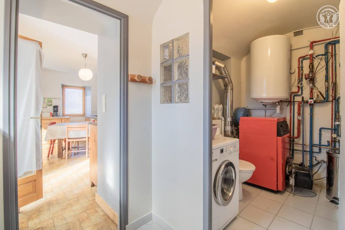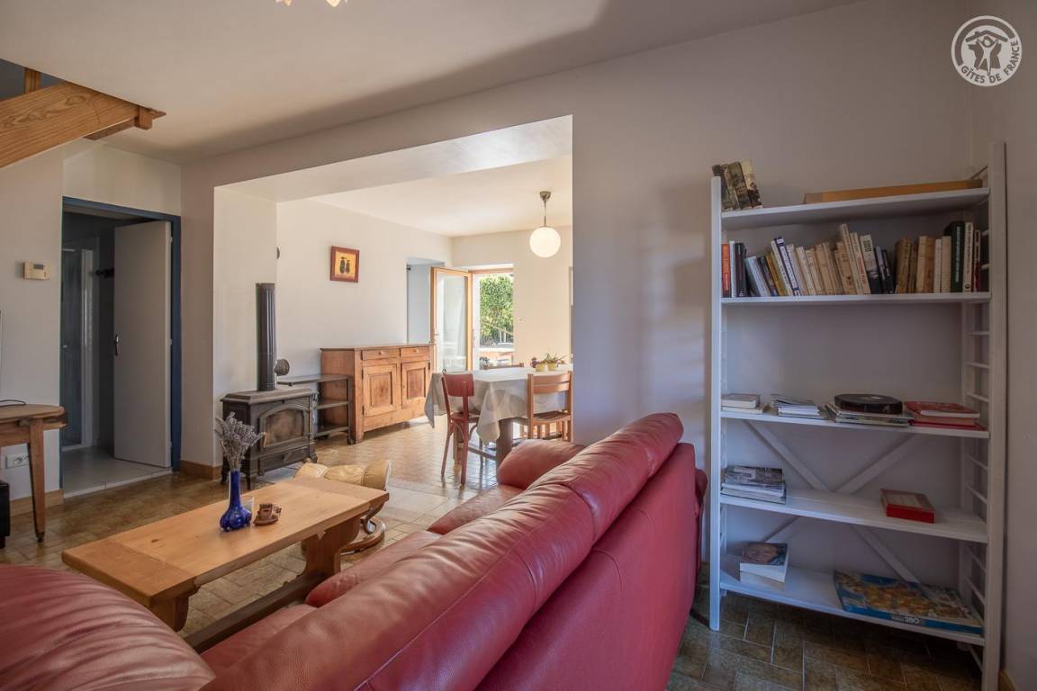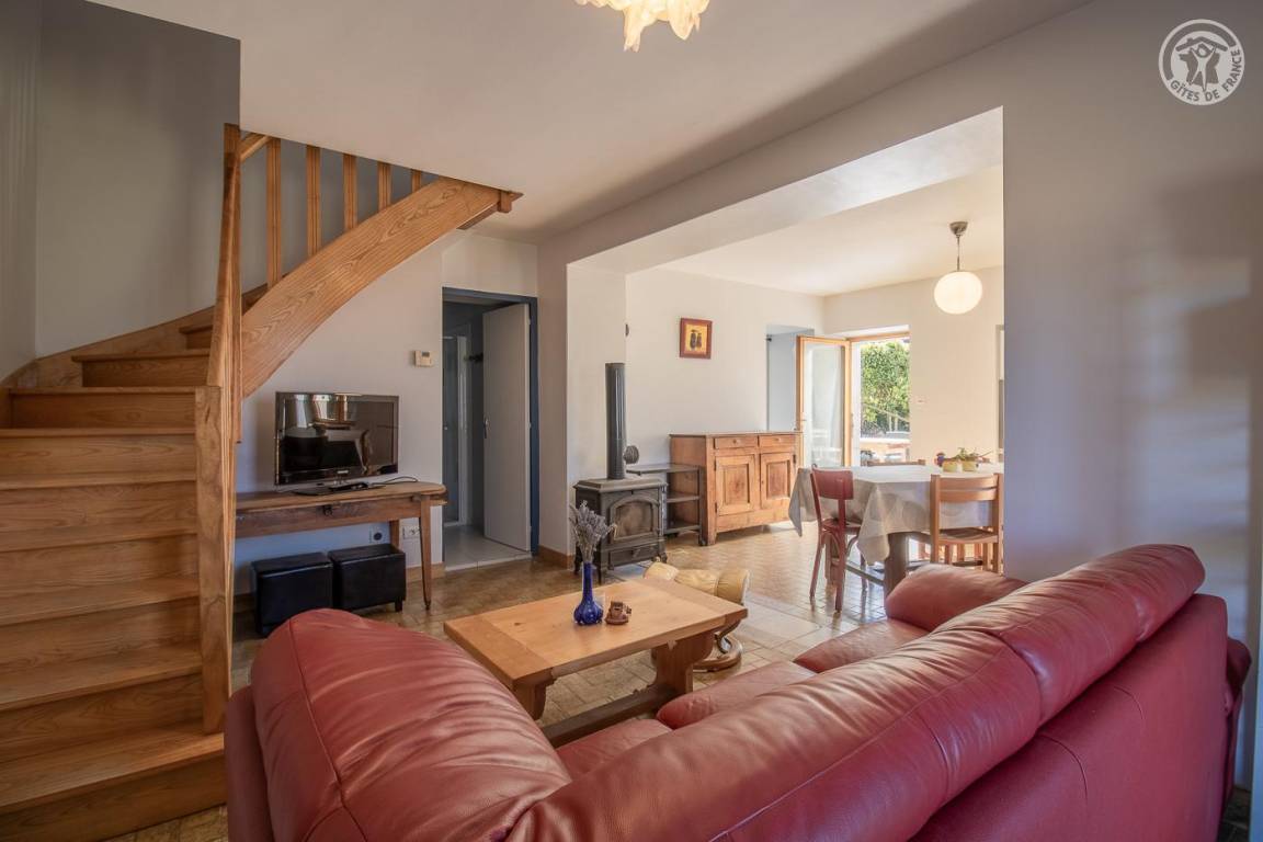 Das Haus grenzt an eine weitere ganzjährige Vermietung hinter dem Haus der Eigentümer. Eingang, Waschküche mit WC, Waschbecken und Waschmaschine. Küche und Esszimmer, Wohnzimmer, Badezimmer (Dusche). Im 1. Stock: 3 Schlafzimmer (2 Einzelbetten 90 x 190 cm / 1 Doppelbett 140 x 190 cm / 1 Doppelbett 160 x 200 cm), Badezimmer (Badewanne) mit WC. Private Terrasse und großer Garten mit Blick auf Le Colombier. Privater Parkplatz (2 Autos).