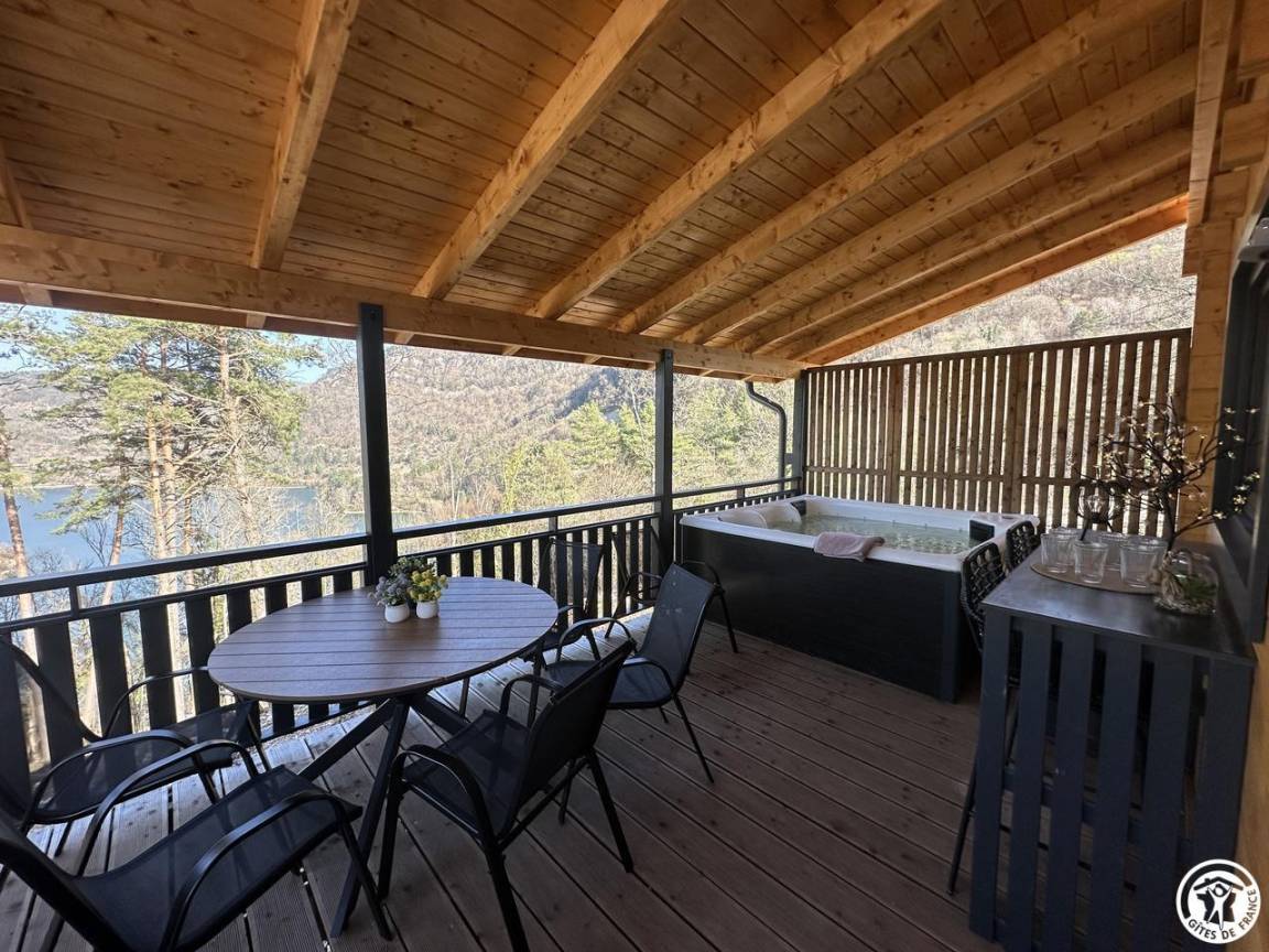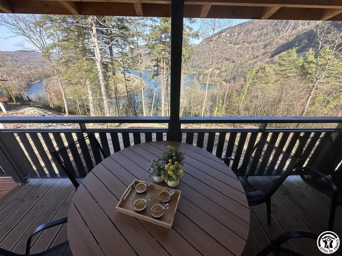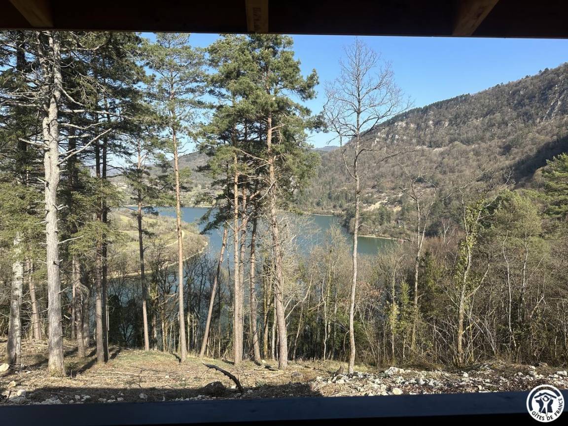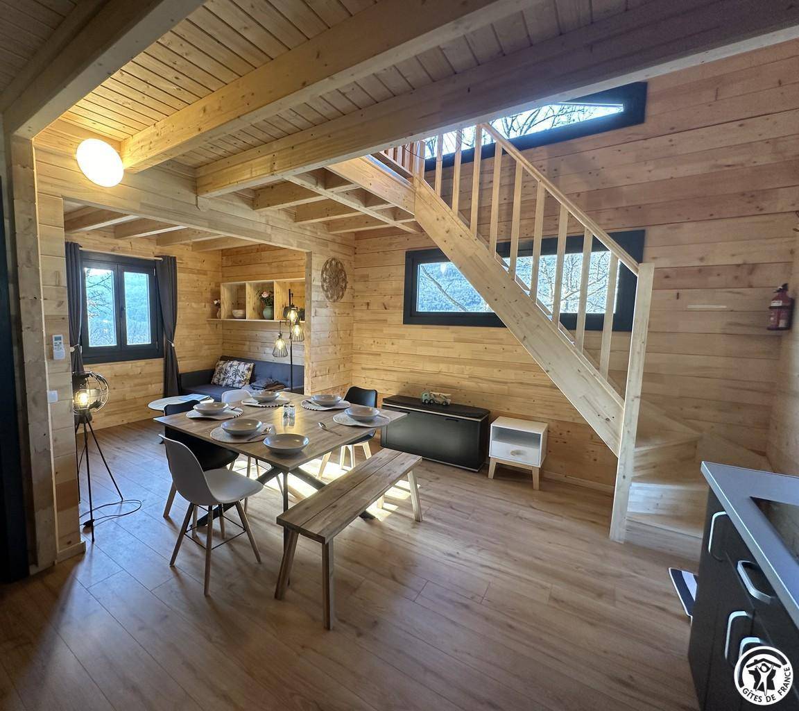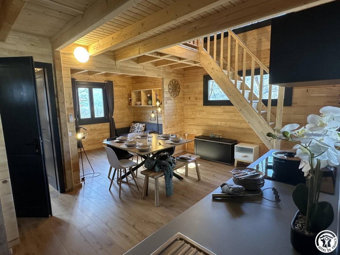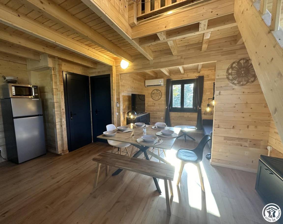 Auf halber Höhe, zentral, zieht diese Lodge die Blicke auf sich, ein 65 m² großes Häuschen auf 2 Ebenen, märchenhaft: Nistkästen, "verdrehte" Fenster, ein ebenerdiger Eingang über einen Gang. Wir öffnen die Tür und das Innere, der Raum, der Komfort, der tiefe Blick auf den Ain, auf eine hölzerne Atmosphäre, machen diese Lodge zu einem einzigartigen Ort. Das 25 m² große Wohnzimmer besteht aus 3 verschiedenen Räumen. Als Verlängerung des Eingangsbereichs endet die Küche mit allem Komfort (2 Cerankochfelder, kleiner Kühlschrank mit Gefrierfach und Mikrowelle) in einer "American Bar", die als Trennung vom Essbereich fungiert. Das Wohnzimmer mit seinen Clubsofas lädt zum Faulenzen ein. Dieser Raum wird durch seine doppelten Erkerfenster auf die 21 m² große Terrasse mit Blick auf die aufgehende Sonne erweitert. Bei schönem Wetter wird die Terrasse bis 14:00 Uhr mit Sonne durchflutet. Es bietet einen der schönsten Panoramablicke auf die Stätte, die sowohl von innen als auch von außen sichtbar