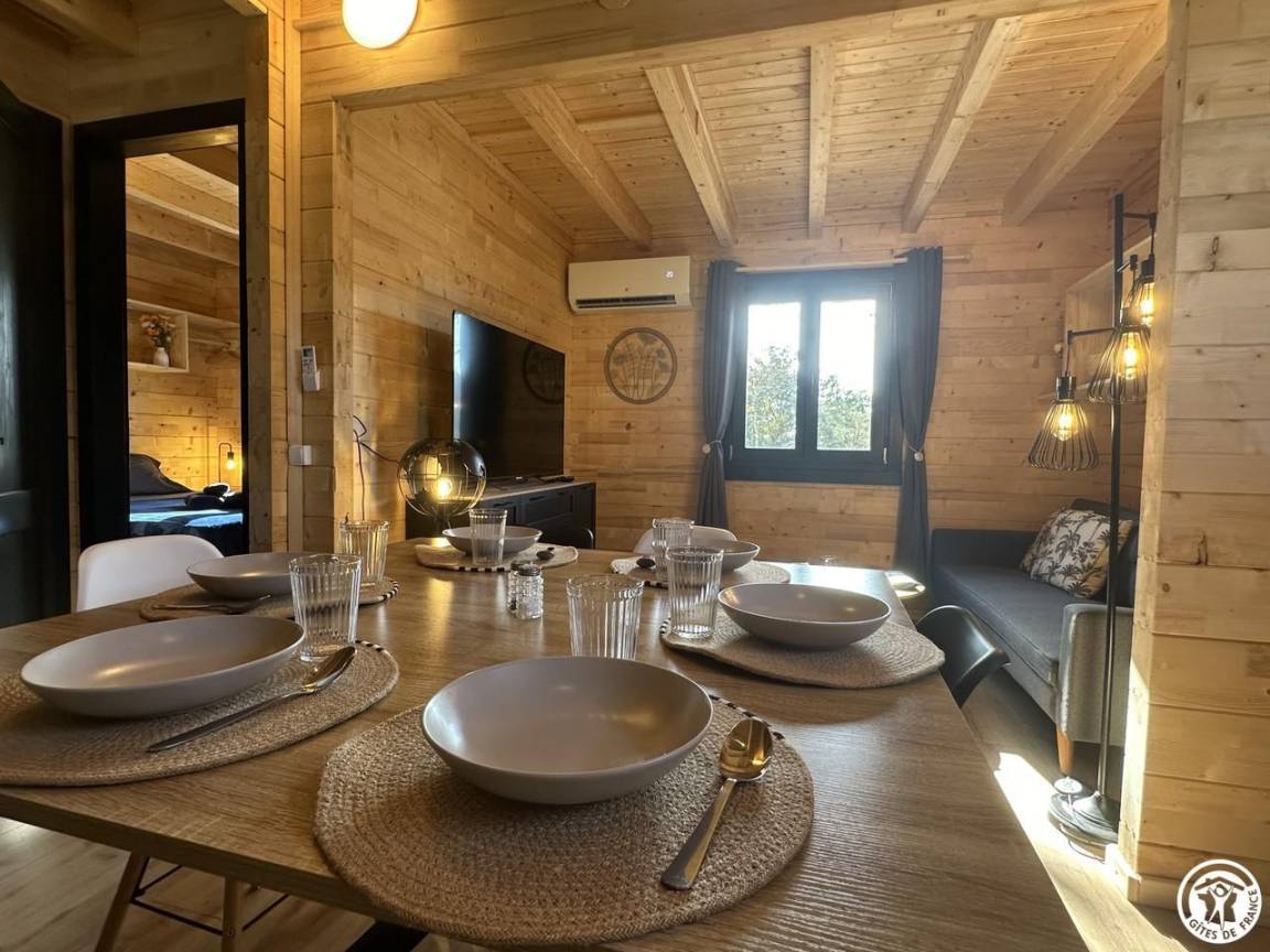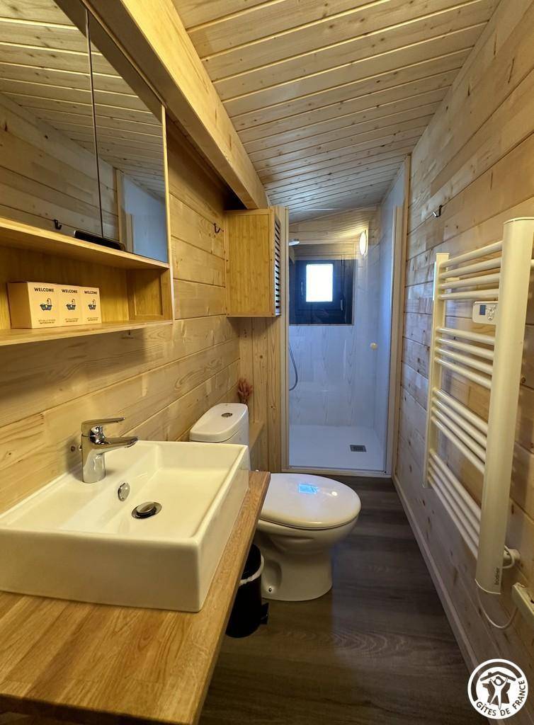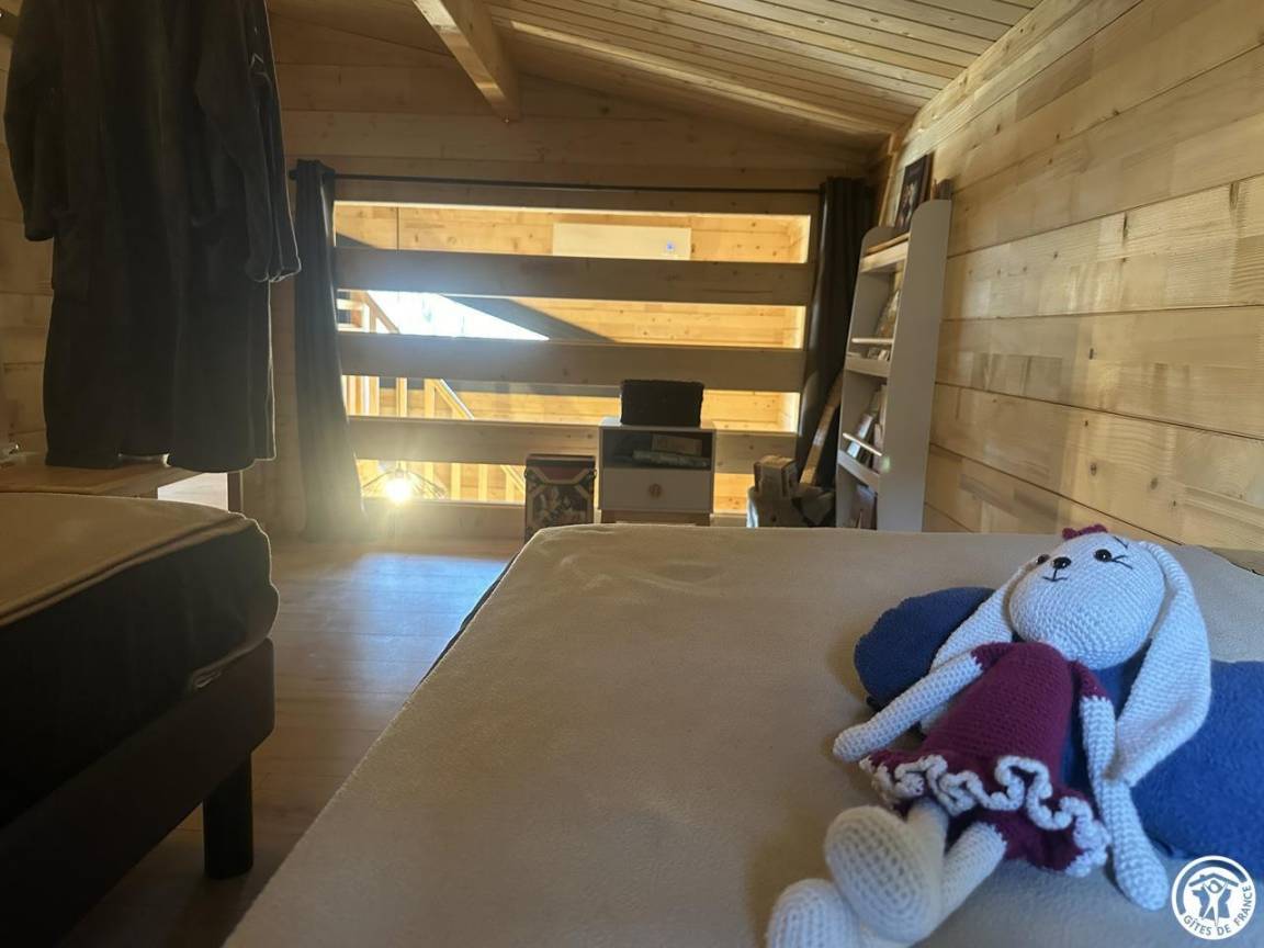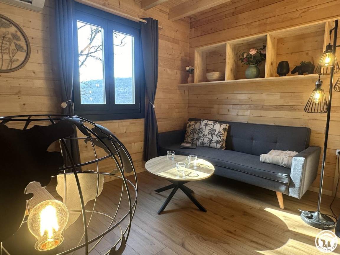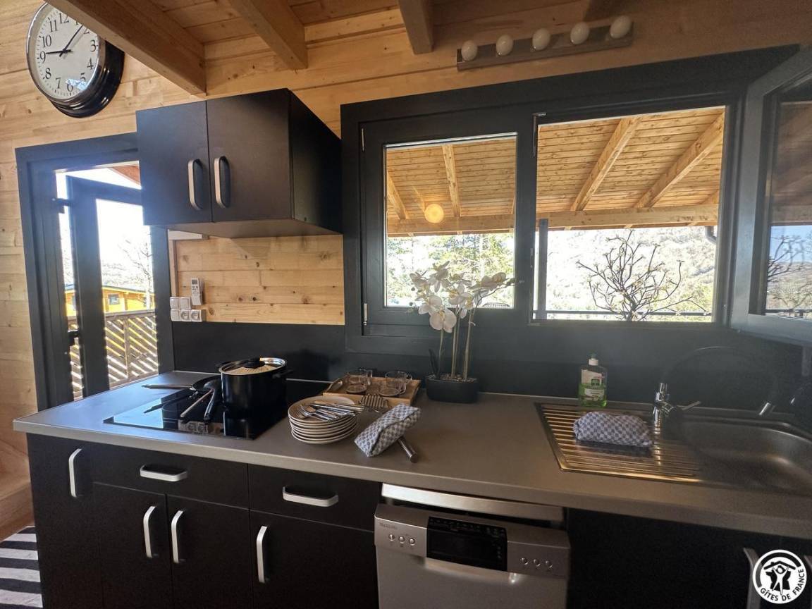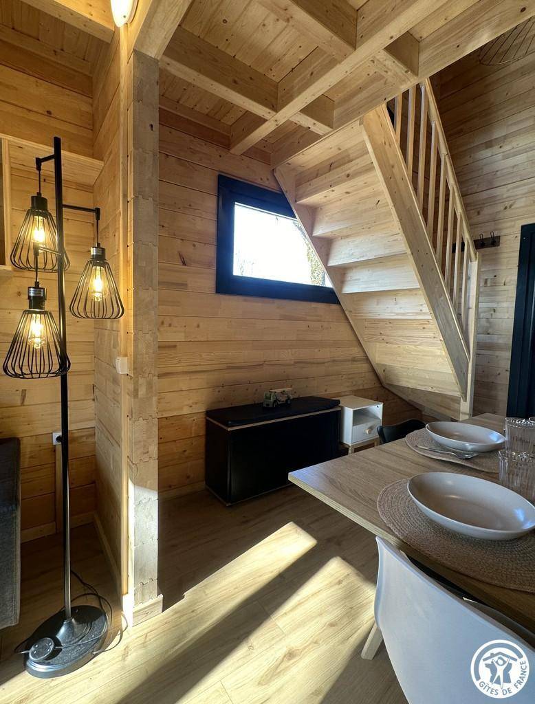 Auf halber Höhe, zentral, zieht diese Lodge die Blicke auf sich, ein 65 m² großes Häuschen auf 2 Ebenen, märchenhaft: Nistkästen, "verdrehte" Fenster, ein ebenerdiger Eingang über einen Gang. Wir öffnen die Tür und das Innere, der Raum, der Komfort, der tiefe Blick auf den Ain, auf eine hölzerne Atmosphäre, machen diese Lodge zu einem einzigartigen Ort. Das 25 m² große Wohnzimmer besteht aus 3 verschiedenen Räumen. Als Verlängerung des Eingangsbereichs endet die Küche mit allem Komfort (2 Cerankochfelder, kleiner Kühlschrank mit Gefrierfach und Mikrowelle) in einer "American Bar", die als Trennung vom Essbereich fungiert. Das Wohnzimmer mit seinen Clubsofas lädt zum Faulenzen ein. Dieser Raum wird durch seine doppelten Erkerfenster auf die 21 m² große Terrasse mit Blick auf die aufgehende Sonne erweitert. Bei schönem Wetter wird die Terrasse bis 14:00 Uhr mit Sonne durchflutet. Es bietet einen der schönsten Panoramablicke auf die Stätte, die sowohl von innen als auch von außen sichtbar