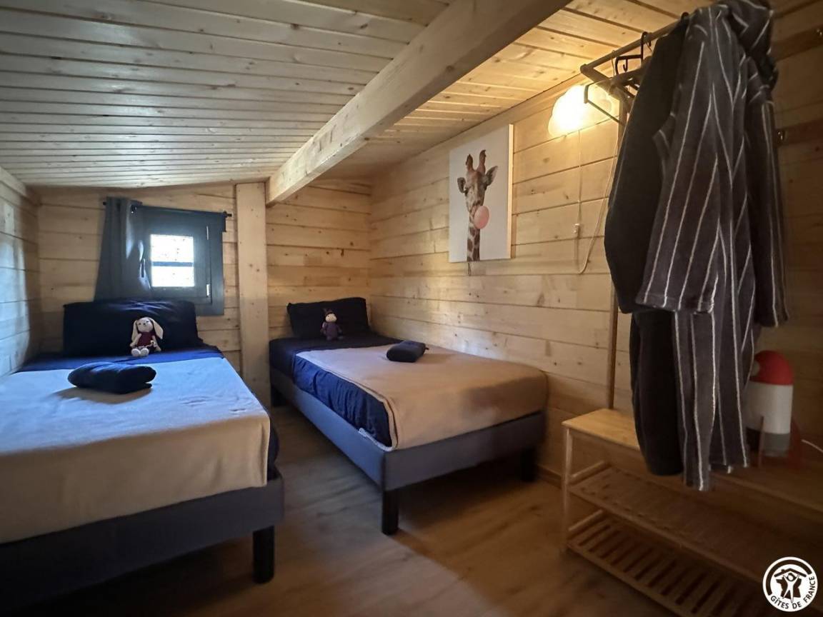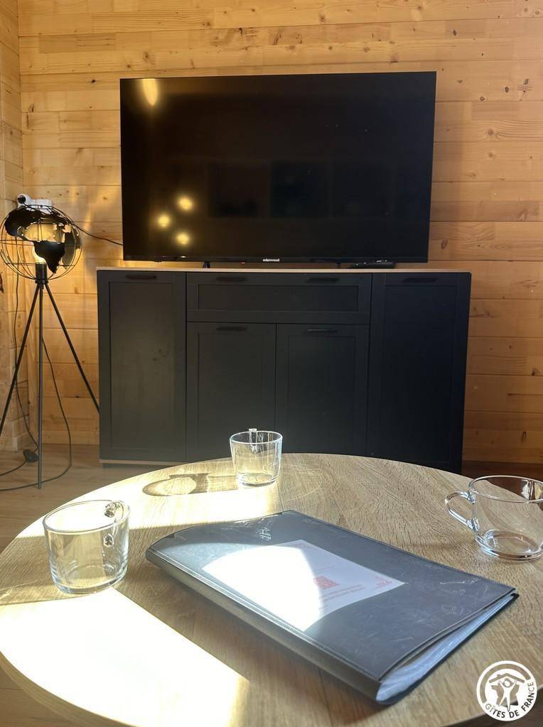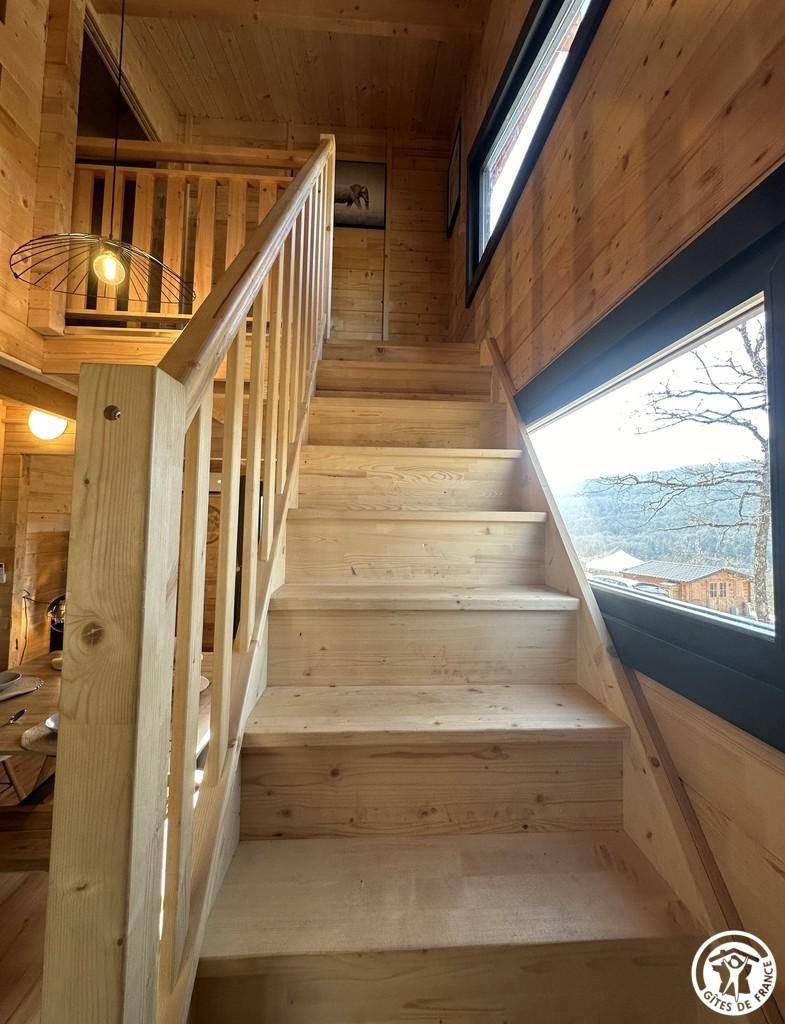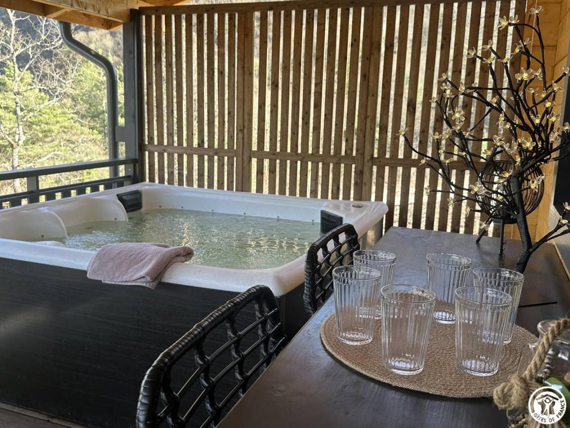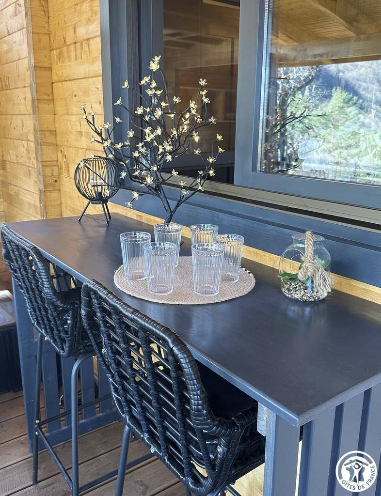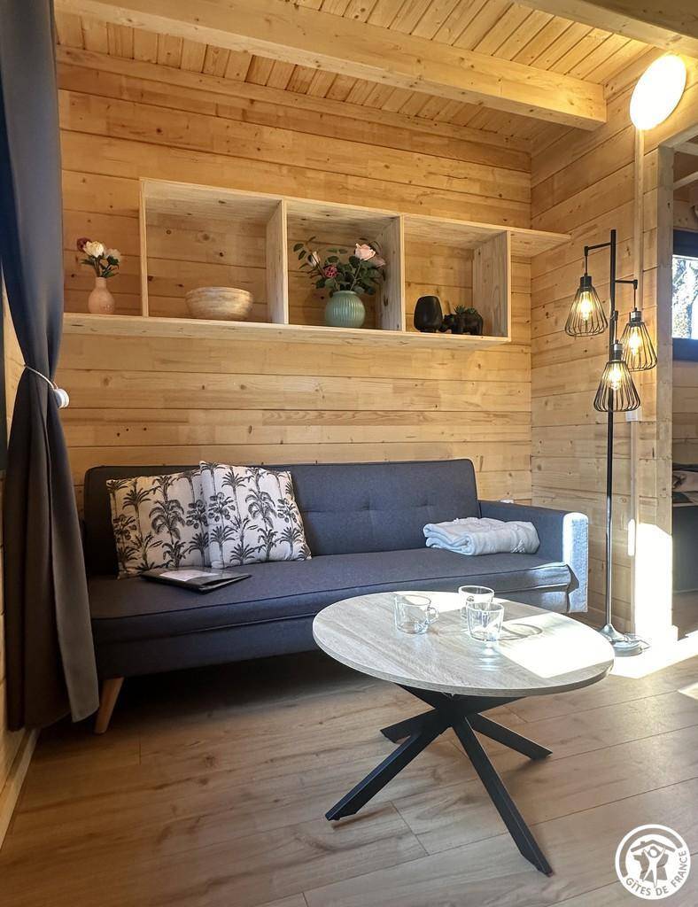 Auf halber Höhe, zentral, zieht diese Lodge die Blicke auf sich, ein 65 m² großes Häuschen auf 2 Ebenen, märchenhaft: Nistkästen, "verdrehte" Fenster, ein ebenerdiger Eingang über einen Gang. Wir öffnen die Tür und das Innere, der Raum, der Komfort, der tiefe Blick auf den Ain, auf eine hölzerne Atmosphäre, machen diese Lodge zu einem einzigartigen Ort. Das 25 m² große Wohnzimmer besteht aus 3 verschiedenen Räumen. Als Verlängerung des Eingangsbereichs endet die Küche mit allem Komfort (2 Cerankochfelder, kleiner Kühlschrank mit Gefrierfach und Mikrowelle) in einer "American Bar", die als Trennung vom Essbereich fungiert. Das Wohnzimmer mit seinen Clubsofas lädt zum Faulenzen ein. Dieser Raum wird durch seine doppelten Erkerfenster auf die 21 m² große Terrasse mit Blick auf die aufgehende Sonne erweitert. Bei schönem Wetter wird die Terrasse bis 14:00 Uhr mit Sonne durchflutet. Es bietet einen der schönsten Panoramablicke auf die Stätte, die sowohl von innen als auch von außen sichtbar