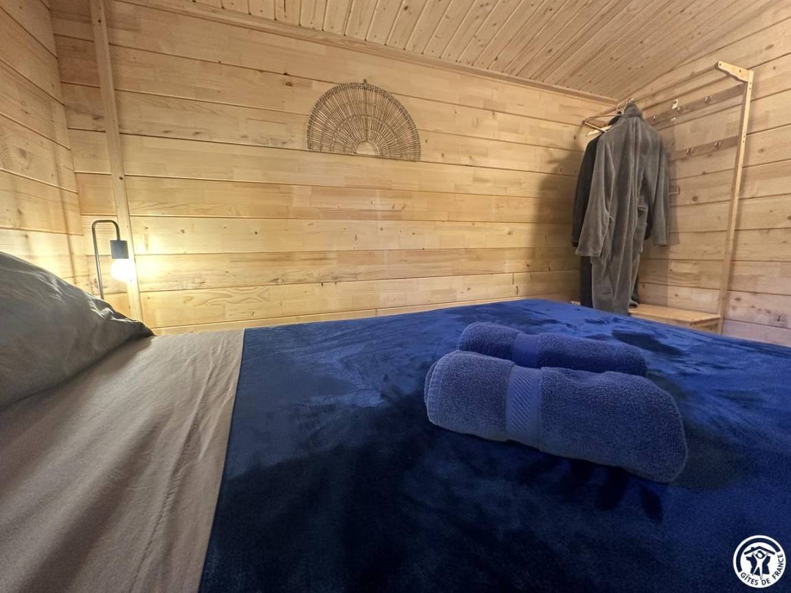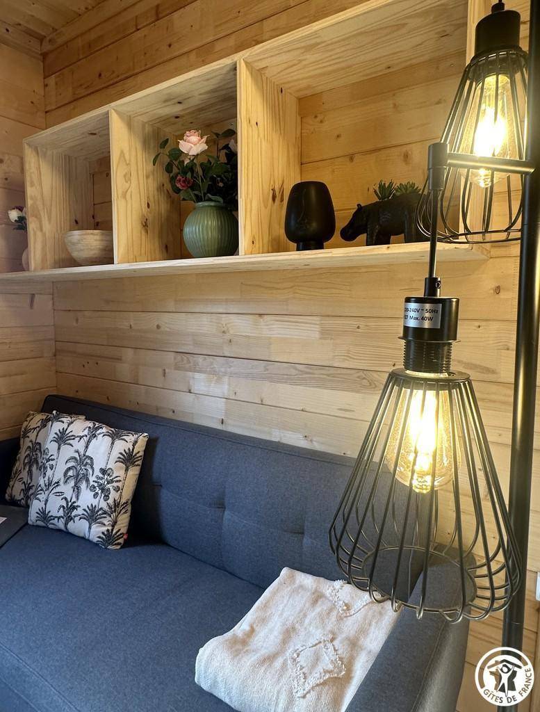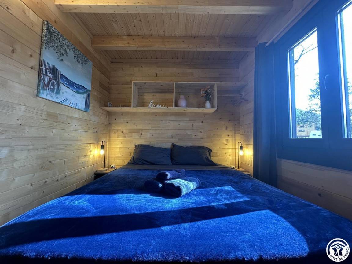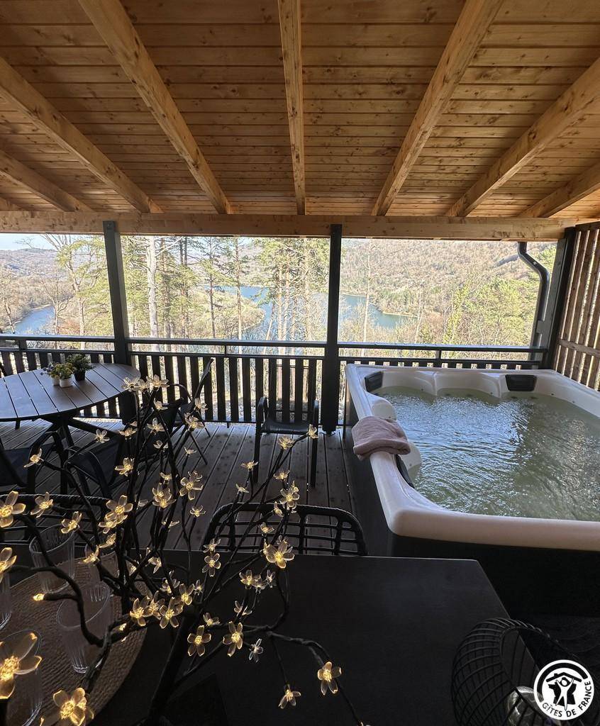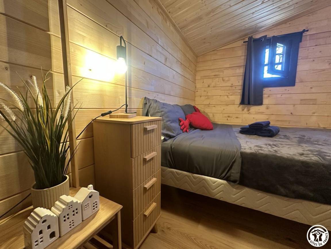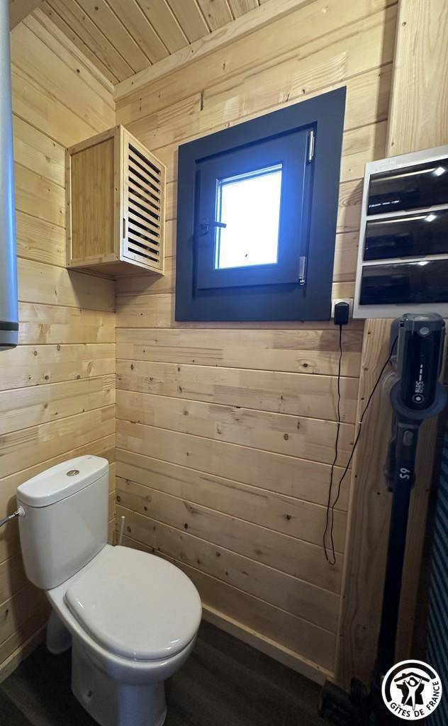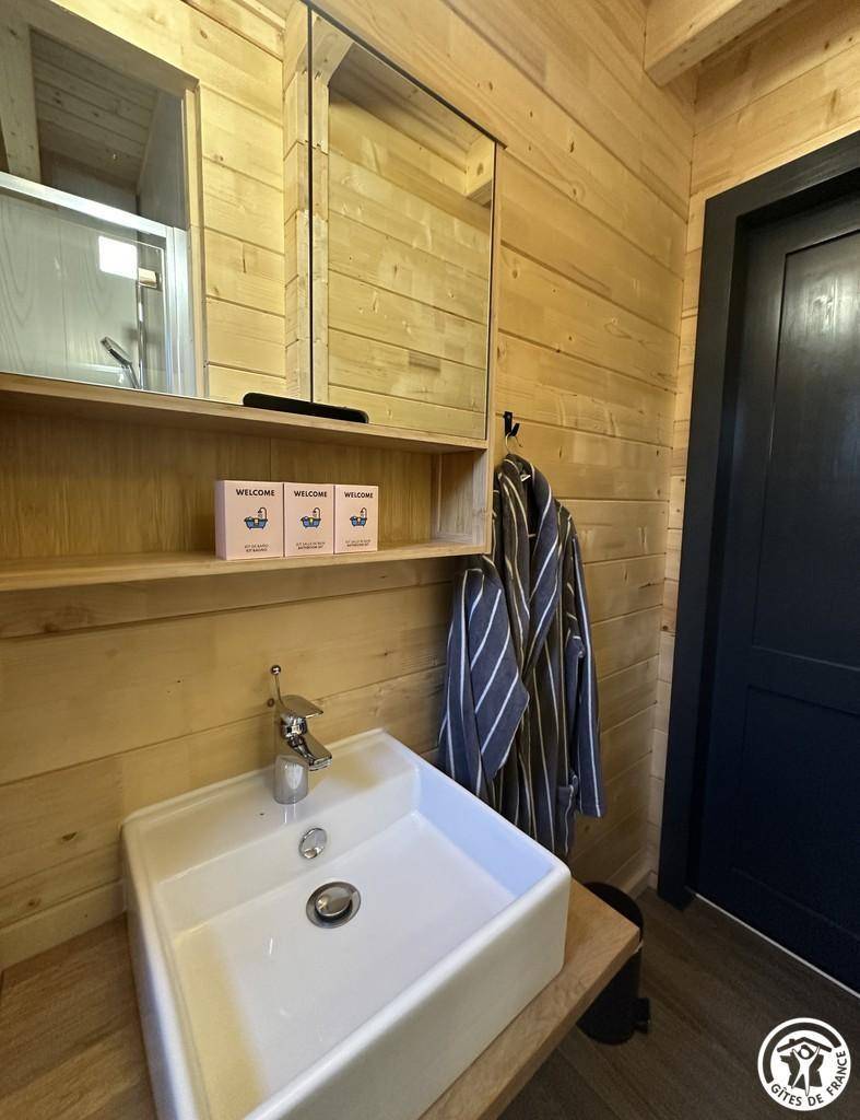 Auf halber Höhe, zentral, zieht diese Lodge die Blicke auf sich, ein 65 m² großes Häuschen auf 2 Ebenen, märchenhaft: Nistkästen, "verdrehte" Fenster, ein ebenerdiger Eingang über einen Gang. Wir öffnen die Tür und das Innere, der Raum, der Komfort, der tiefe Blick auf den Ain, auf eine hölzerne Atmosphäre, machen diese Lodge zu einem einzigartigen Ort. Das 25 m² große Wohnzimmer besteht aus 3 verschiedenen Räumen. Als Verlängerung des Eingangsbereichs endet die Küche mit allem Komfort (2 Cerankochfelder, kleiner Kühlschrank mit Gefrierfach und Mikrowelle) in einer "American Bar", die als Trennung vom Essbereich fungiert. Das Wohnzimmer mit seinen Clubsofas lädt zum Faulenzen ein. Dieser Raum wird durch seine doppelten Erkerfenster auf die 21 m² große Terrasse mit Blick auf die aufgehende Sonne erweitert. Bei schönem Wetter wird die Terrasse bis 14:00 Uhr mit Sonne durchflutet. Es bietet einen der schönsten Panoramablicke auf die Stätte, die sowohl von innen als auch von außen sichtbar