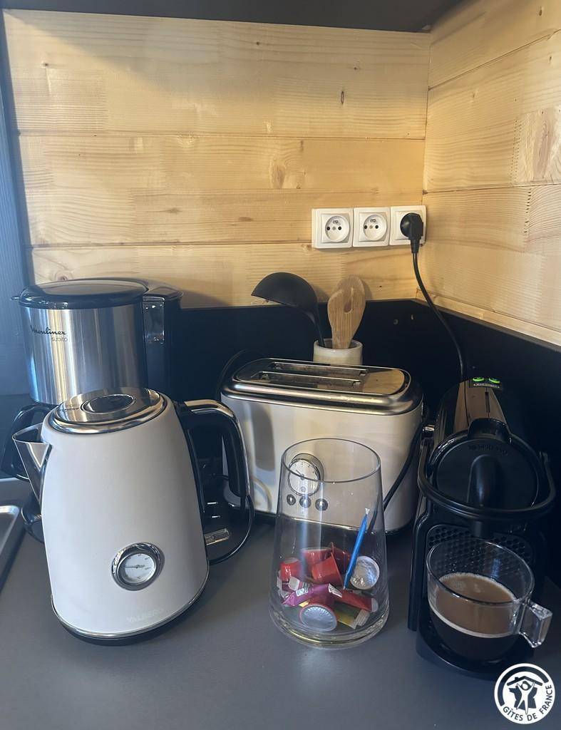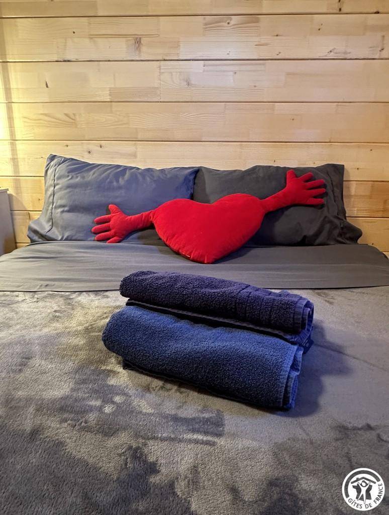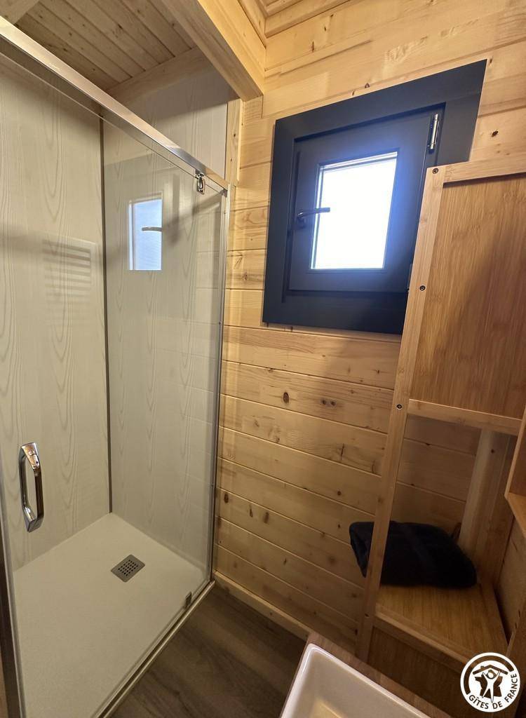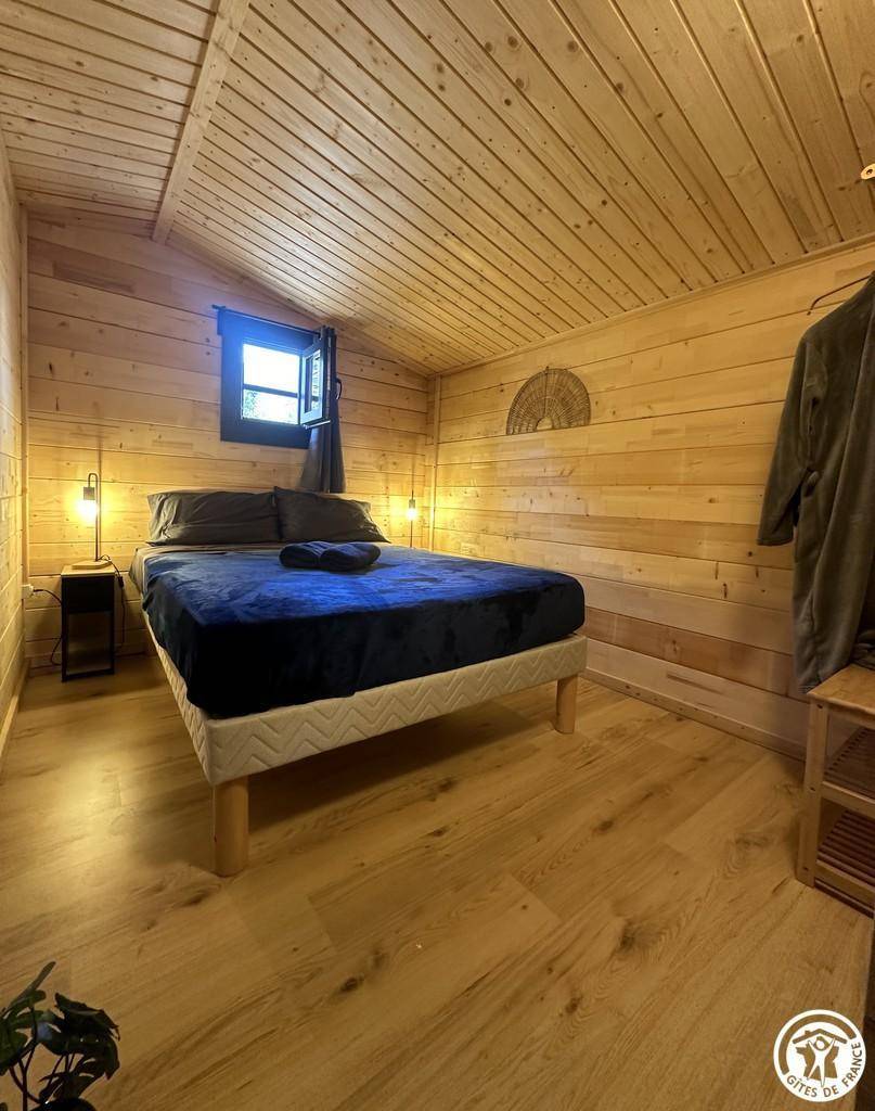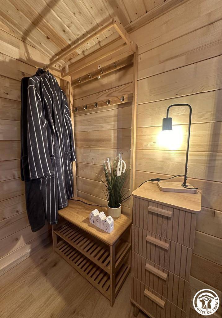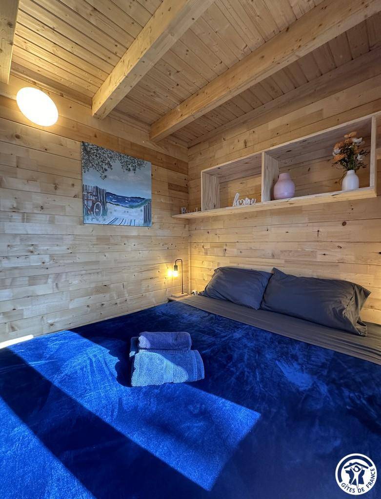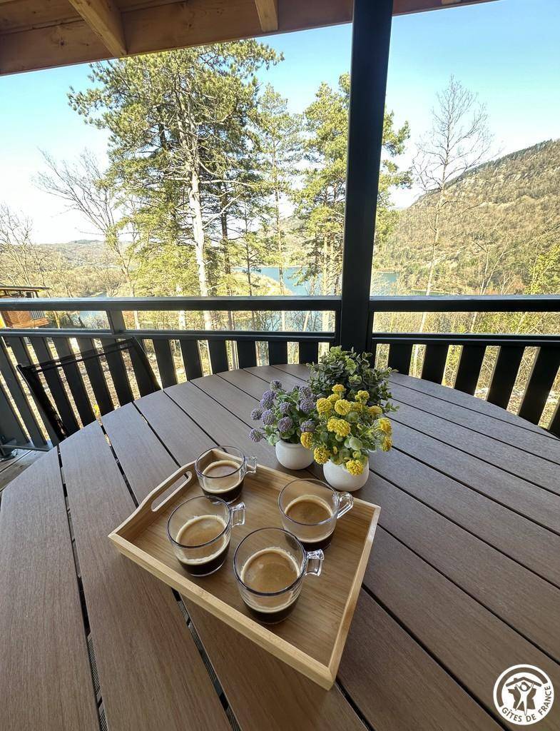 Auf halber Höhe, zentral, zieht diese Lodge die Blicke auf sich, ein 65 m² großes Häuschen auf 2 Ebenen, märchenhaft: Nistkästen, "verdrehte" Fenster, ein ebenerdiger Eingang über einen Gang. Wir öffnen die Tür und das Innere, der Raum, der Komfort, der tiefe Blick auf den Ain, auf eine hölzerne Atmosphäre, machen diese Lodge zu einem einzigartigen Ort. Das 25 m² große Wohnzimmer besteht aus 3 verschiedenen Räumen. Als Verlängerung des Eingangsbereichs endet die Küche mit allem Komfort (2 Cerankochfelder, kleiner Kühlschrank mit Gefrierfach und Mikrowelle) in einer "American Bar", die als Trennung vom Essbereich fungiert. Das Wohnzimmer mit seinen Clubsofas lädt zum Faulenzen ein. Dieser Raum wird durch seine doppelten Erkerfenster auf die 21 m² große Terrasse mit Blick auf die aufgehende Sonne erweitert. Bei schönem Wetter wird die Terrasse bis 14:00 Uhr mit Sonne durchflutet. Es bietet einen der schönsten Panoramablicke auf die Stätte, die sowohl von innen als auch von außen sichtbar