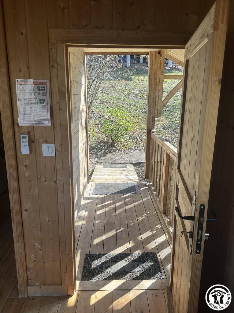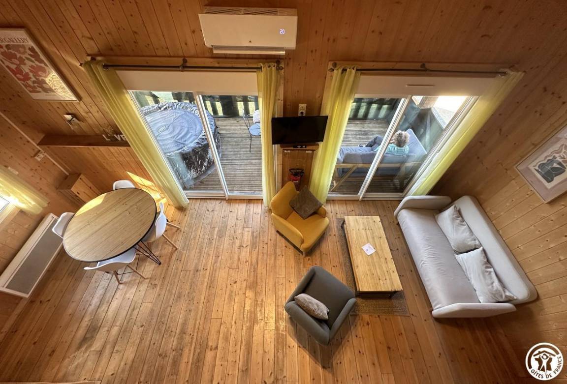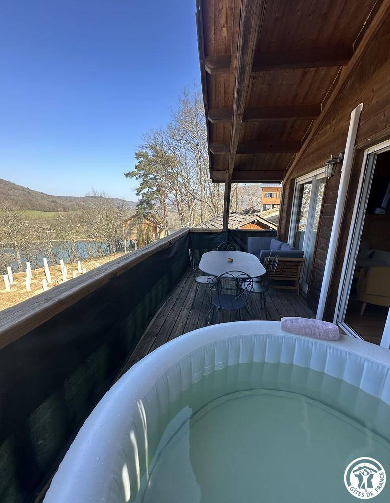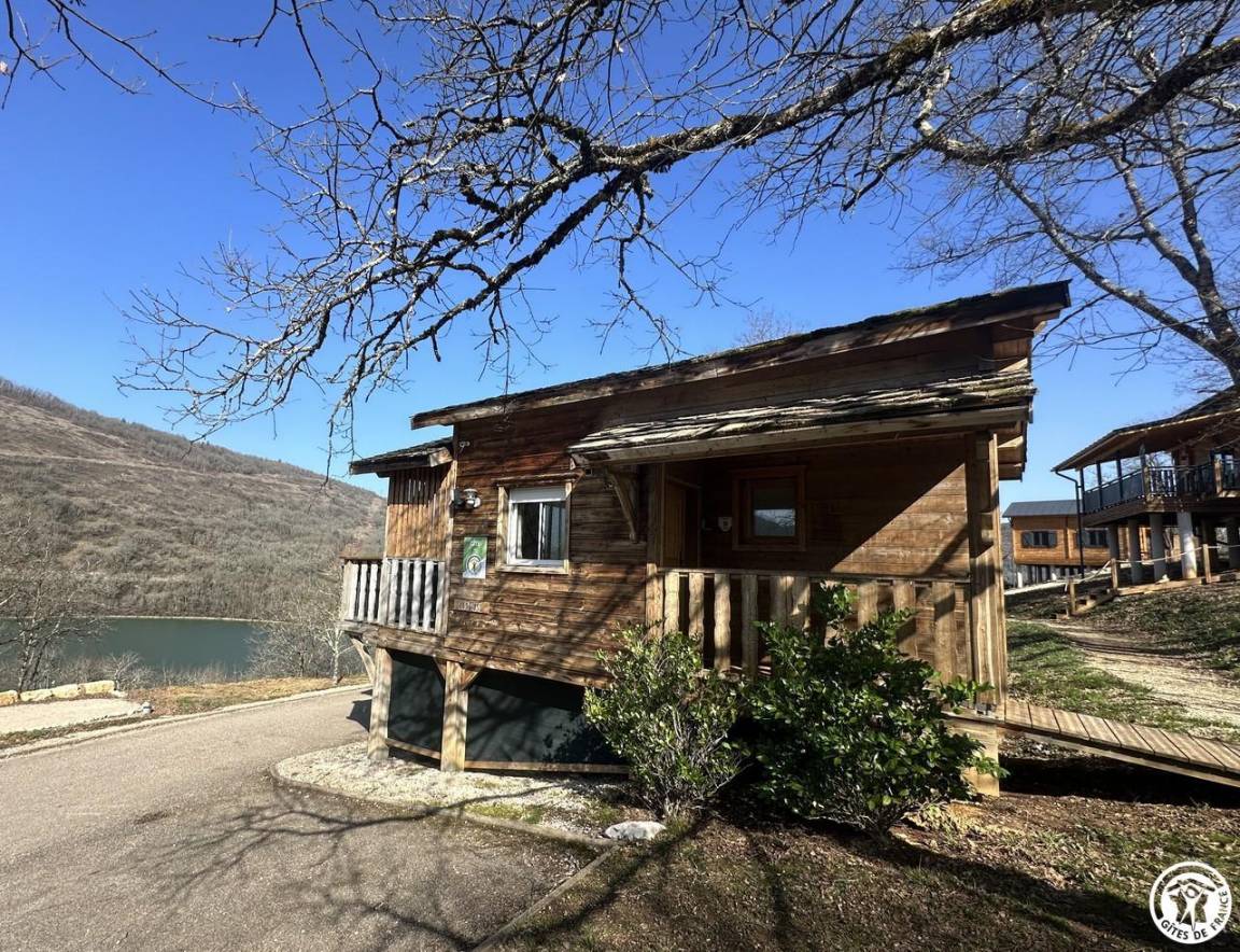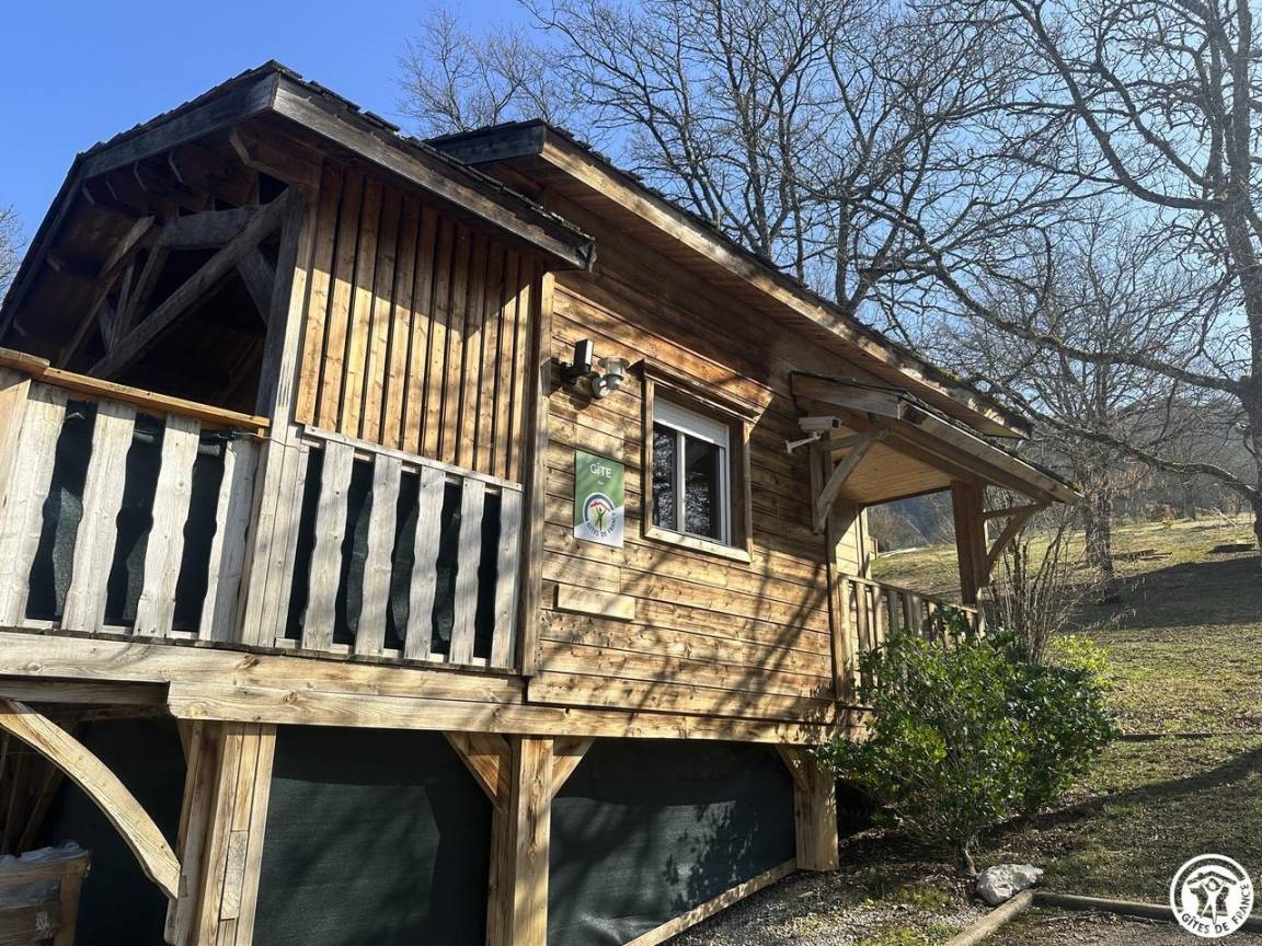 Auf halber Höhe, zentral, zieht diese Lodge die Blicke auf sich, ein 65 m² großes Häuschen auf 2 Ebenen, märchenhaft: Nistkästen, "verdrehte" Fenster, ein ebenerdiger Eingang über einen Gang. Wir öffnen die Tür und das Innere, der Raum, der Komfort, der tiefe Blick auf den Ain, auf eine hölzerne Atmosphäre, machen diese Lodge zu einem einzigartigen Ort. Das 25 m² große Wohnzimmer besteht aus 3 verschiedenen Räumen. Als Verlängerung des Eingangsbereichs endet die Küche mit allem Komfort (2 Cerankochfelder, kleiner Kühlschrank mit Gefrierfach und Mikrowelle) in einer "American Bar", die als Trennung vom Essbereich fungiert. Das Wohnzimmer mit seinen Clubsofas lädt zum Faulenzen ein. Dieser Raum wird durch seine doppelten Erkerfenster auf die 21 m² große Terrasse mit Blick auf die aufgehende Sonne erweitert. Bei schönem Wetter wird die Terrasse bis 14:00 Uhr mit Sonne durchflutet. Es bietet einen der schönsten Panoramablicke auf die Stätte, die sowohl von innen als auch von außen sichtbar