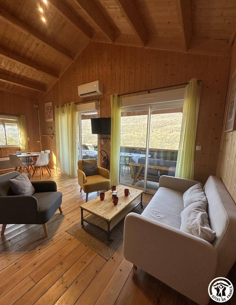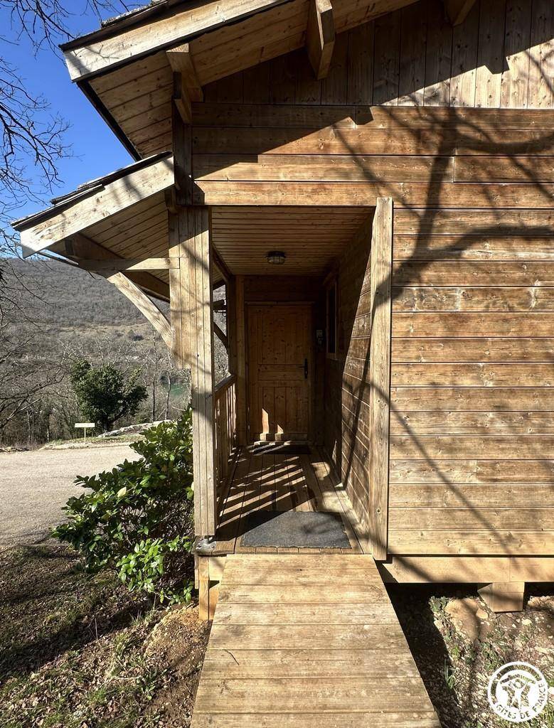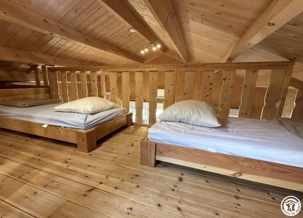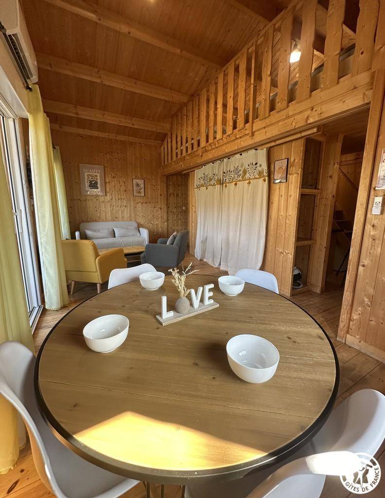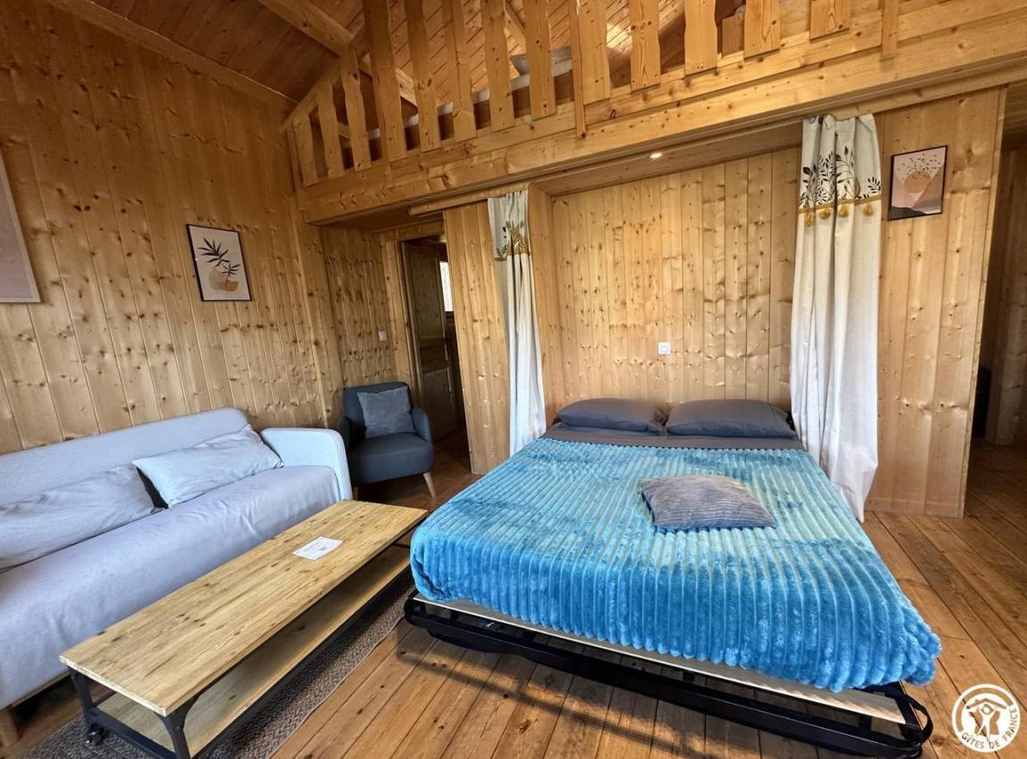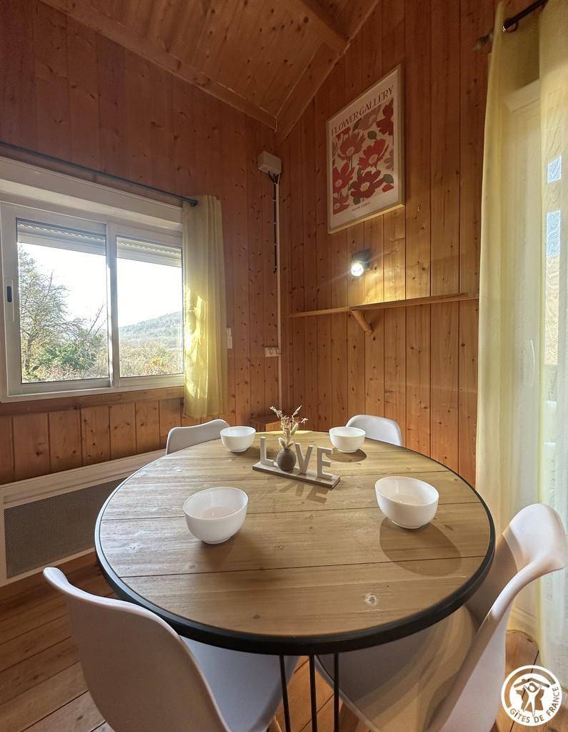 Auf halber Höhe, zentral, zieht diese Lodge die Blicke auf sich, ein 65 m² großes Häuschen auf 2 Ebenen, märchenhaft: Nistkästen, "verdrehte" Fenster, ein ebenerdiger Eingang über einen Gang. Wir öffnen die Tür und das Innere, der Raum, der Komfort, der tiefe Blick auf den Ain, auf eine hölzerne Atmosphäre, machen diese Lodge zu einem einzigartigen Ort. Das 25 m² große Wohnzimmer besteht aus 3 verschiedenen Räumen. Als Verlängerung des Eingangsbereichs endet die Küche mit allem Komfort (2 Cerankochfelder, kleiner Kühlschrank mit Gefrierfach und Mikrowelle) in einer "American Bar", die als Trennung vom Essbereich fungiert. Das Wohnzimmer mit seinen Clubsofas lädt zum Faulenzen ein. Dieser Raum wird durch seine doppelten Erkerfenster auf die 21 m² große Terrasse mit Blick auf die aufgehende Sonne erweitert. Bei schönem Wetter wird die Terrasse bis 14:00 Uhr mit Sonne durchflutet. Es bietet einen der schönsten Panoramablicke auf die Stätte, die sowohl von innen als auch von außen sichtbar