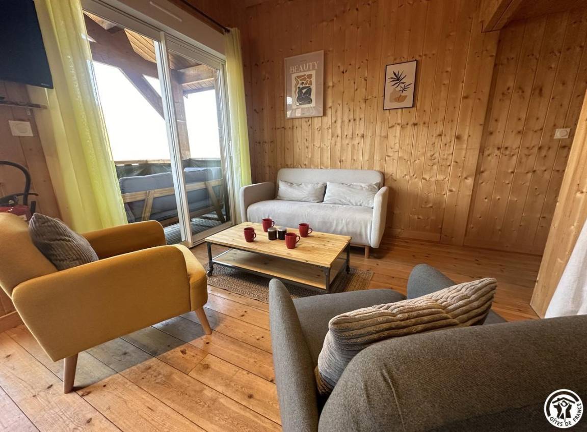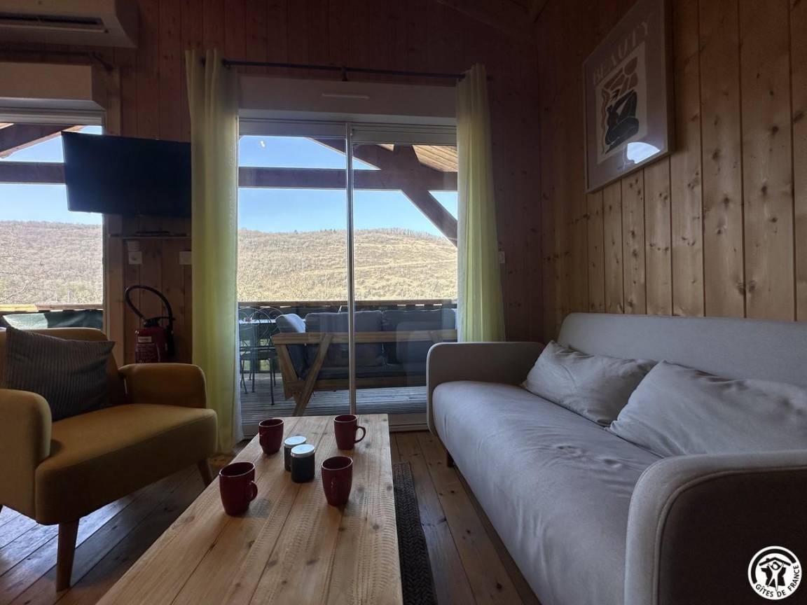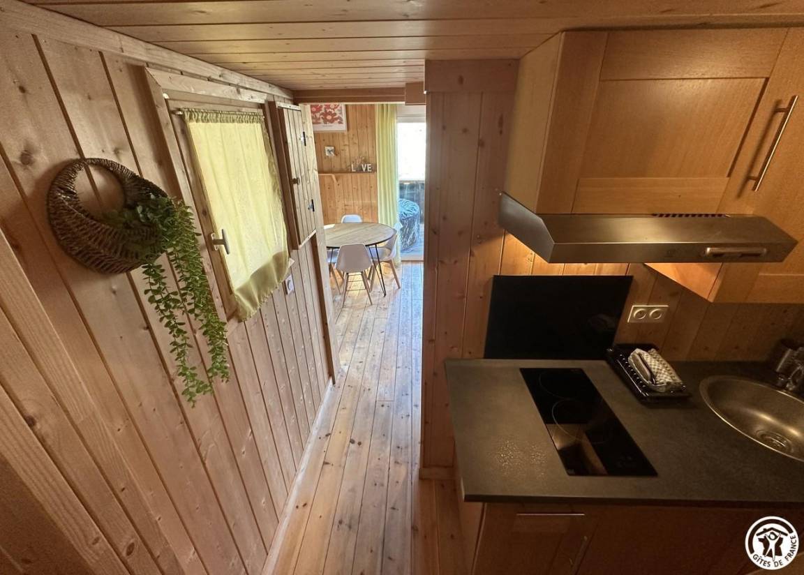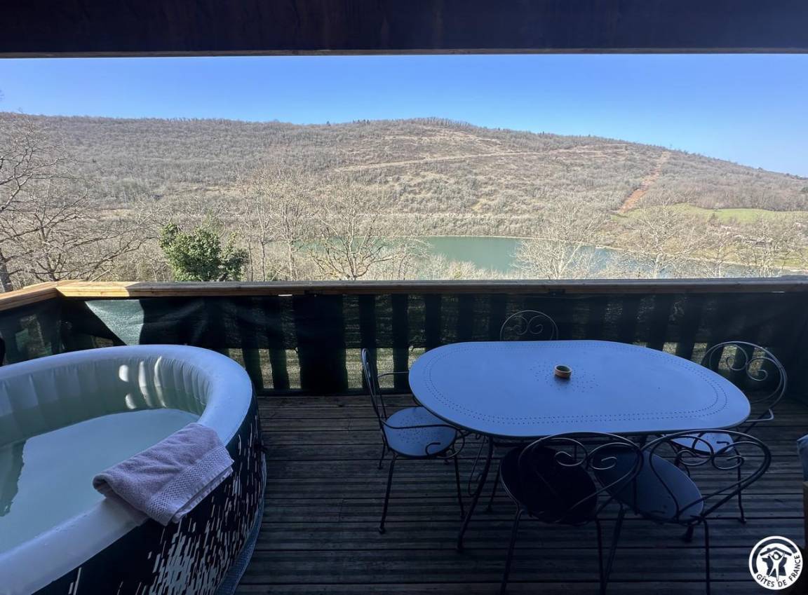 Auf halber Höhe, zentral, zieht diese Lodge die Blicke auf sich, ein 65 m² großes Häuschen auf 2 Ebenen, märchenhaft: Nistkästen, "verdrehte" Fenster, ein ebenerdiger Eingang über einen Gang. Wir öffnen die Tür und das Innere, der Raum, der Komfort, der tiefe Blick auf den Ain, auf eine hölzerne Atmosphäre, machen diese Lodge zu einem einzigartigen Ort. Das 25 m² große Wohnzimmer besteht aus 3 verschiedenen Räumen. Als Verlängerung des Eingangsbereichs endet die Küche mit allem Komfort (2 Cerankochfelder, kleiner Kühlschrank mit Gefrierfach und Mikrowelle) in einer "American Bar", die als Trennung vom Essbereich fungiert. Das Wohnzimmer mit seinen Clubsofas lädt zum Faulenzen ein. Dieser Raum wird durch seine doppelten Erkerfenster auf die 21 m² große Terrasse mit Blick auf die aufgehende Sonne erweitert. Bei schönem Wetter wird die Terrasse bis 14:00 Uhr mit Sonne durchflutet. Es bietet einen der schönsten Panoramablicke auf die Stätte, die sowohl von innen als auch von außen sichtbar