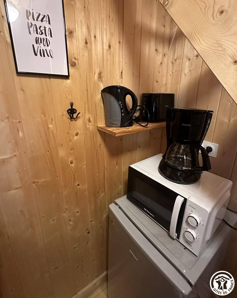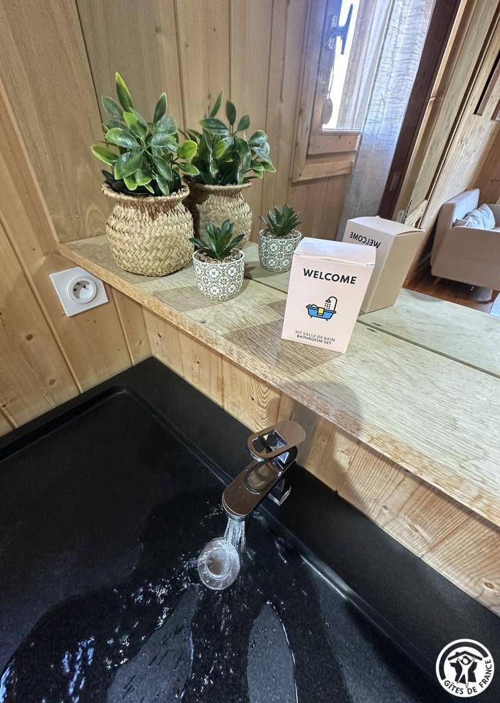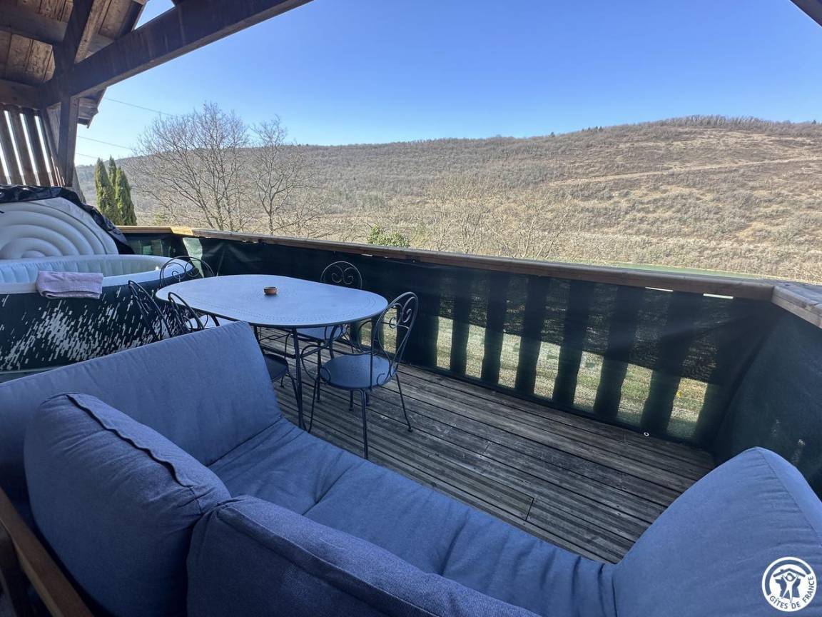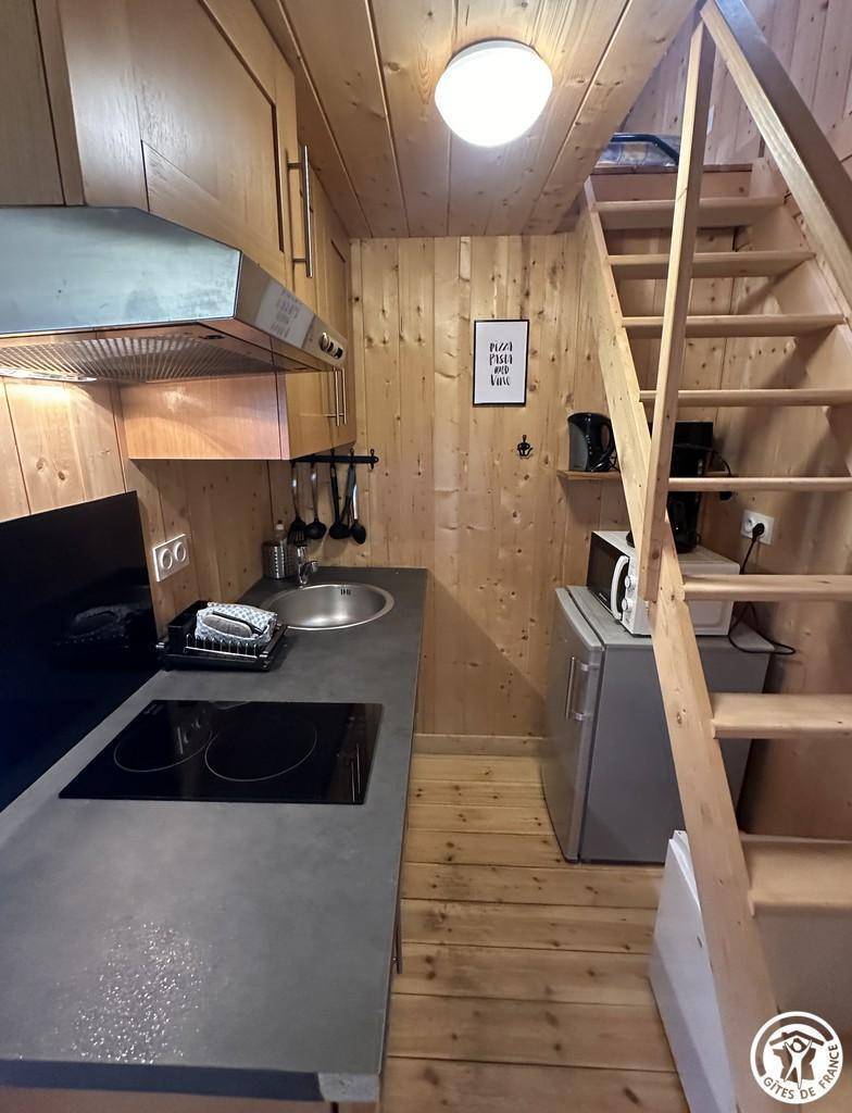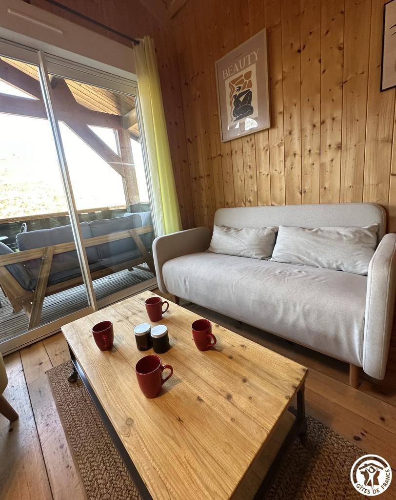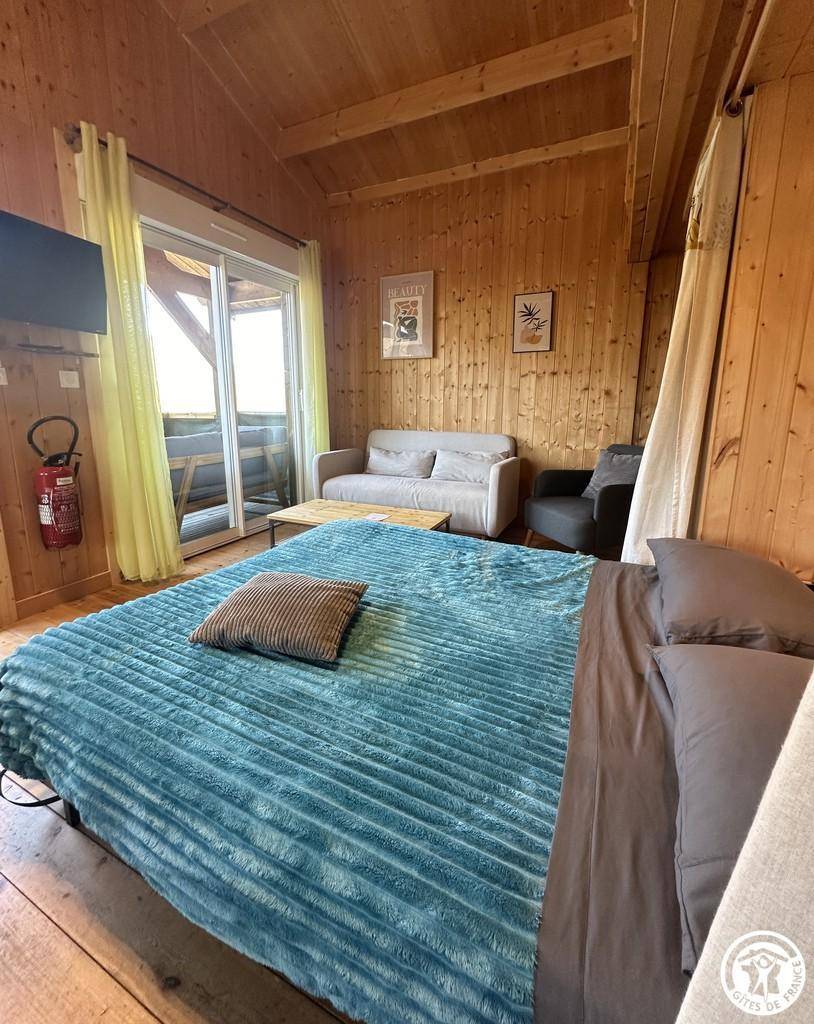 Auf halber Höhe, zentral, zieht diese Lodge die Blicke auf sich, ein 65 m² großes Häuschen auf 2 Ebenen, märchenhaft: Nistkästen, "verdrehte" Fenster, ein ebenerdiger Eingang über einen Gang. Wir öffnen die Tür und das Innere, der Raum, der Komfort, der tiefe Blick auf den Ain, auf eine hölzerne Atmosphäre, machen diese Lodge zu einem einzigartigen Ort. Das 25 m² große Wohnzimmer besteht aus 3 verschiedenen Räumen. Als Verlängerung des Eingangsbereichs endet die Küche mit allem Komfort (2 Cerankochfelder, kleiner Kühlschrank mit Gefrierfach und Mikrowelle) in einer "American Bar", die als Trennung vom Essbereich fungiert. Das Wohnzimmer mit seinen Clubsofas lädt zum Faulenzen ein. Dieser Raum wird durch seine doppelten Erkerfenster auf die 21 m² große Terrasse mit Blick auf die aufgehende Sonne erweitert. Bei schönem Wetter wird die Terrasse bis 14:00 Uhr mit Sonne durchflutet. Es bietet einen der schönsten Panoramablicke auf die Stätte, die sowohl von innen als auch von außen sichtbar