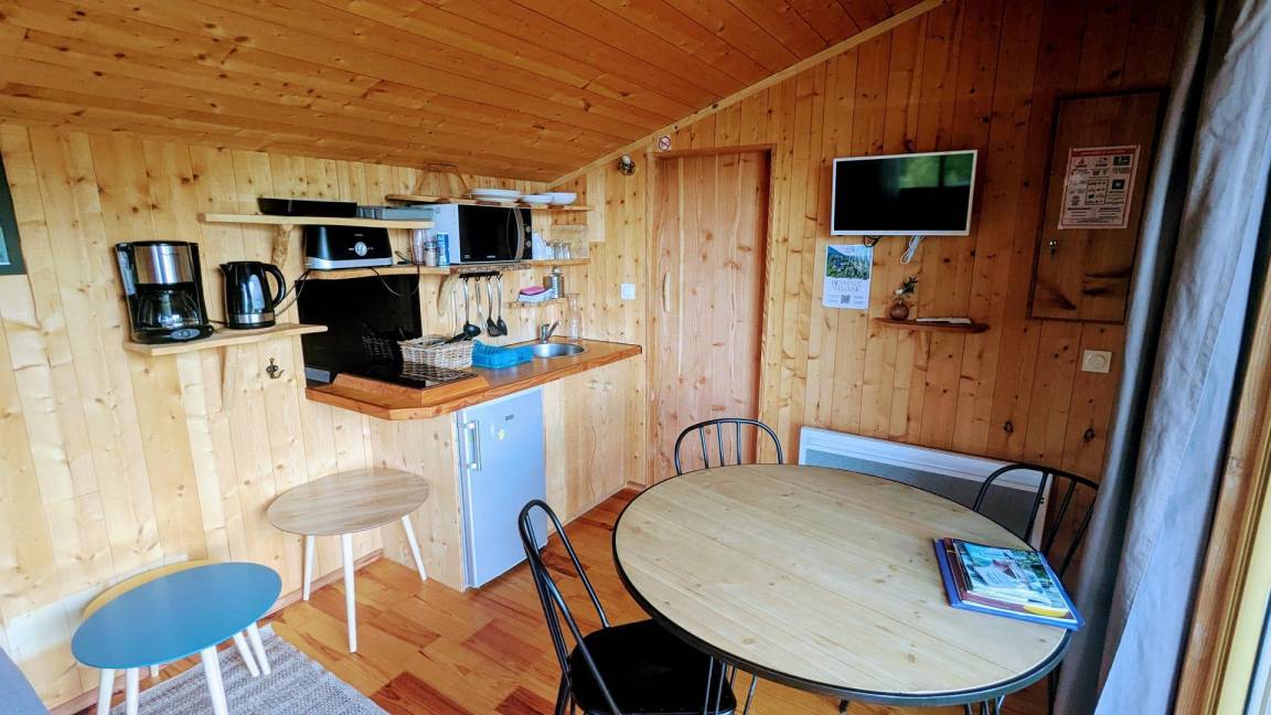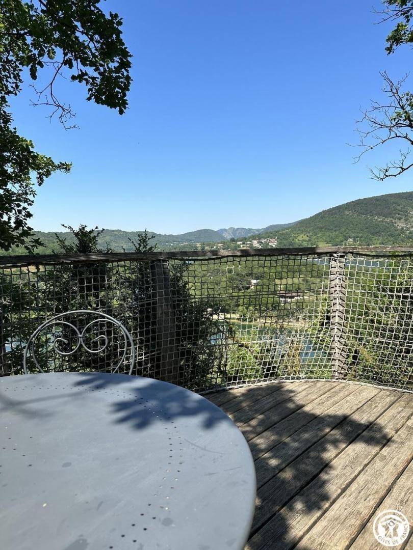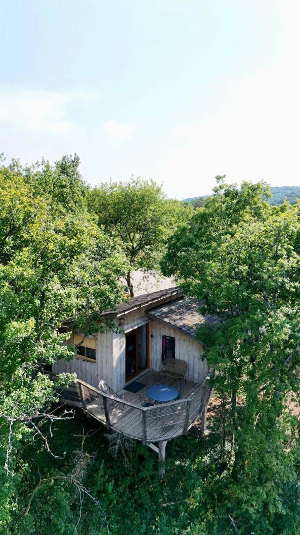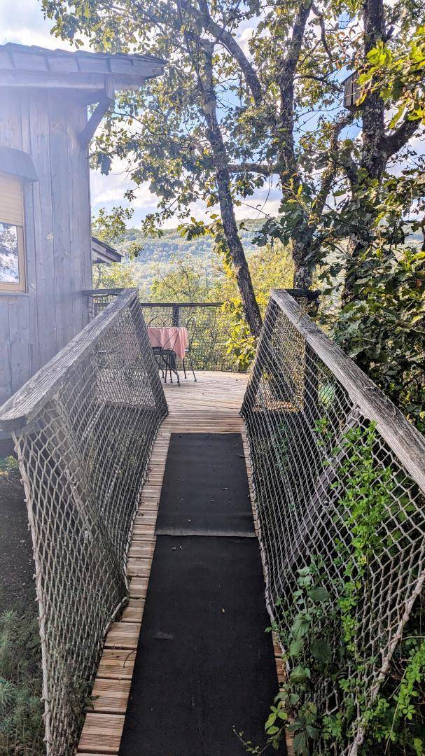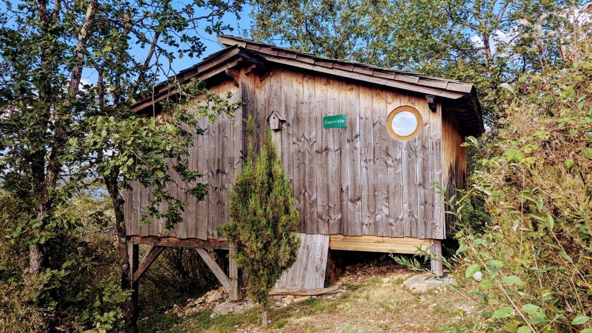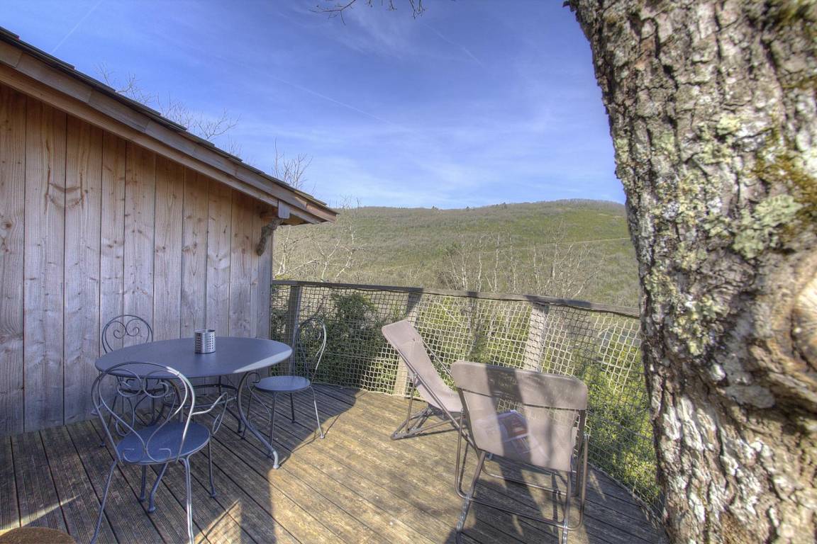 die terrasse, ihre aussicht natürlich und ihre helligkeit, jedes zimmer hat ein fenster. La Sapinière ist Teil eines Naturparks mit insgesamt 7 Hütten und Lodges, die vollständig in diesen Buchsbaumwald integriert sind, eingebettet auf den Höhen von Serrières sur Ain, direkt über dem Fluss Ain. Jede Hütte hat ihre eigene Identität und ist auf Stelzen 2 Meter über dem Boden gebaut, die Zugänge und die Terrasse sind vollständig gesichert. Außergewöhnlicher Ort in den Schluchten des Ain, der Kanufahren, Rudern oder einfach Schwimmen ermöglicht. Hoch auf den Klippen, Möglichkeit zum Wandern, mit GR und PR. Mit etwas Glück, Geduld und morgendlichem Aufstehen können Sie vielleicht die Gämsen beobachten, die manchmal auf den trockenen Rasen grasen.