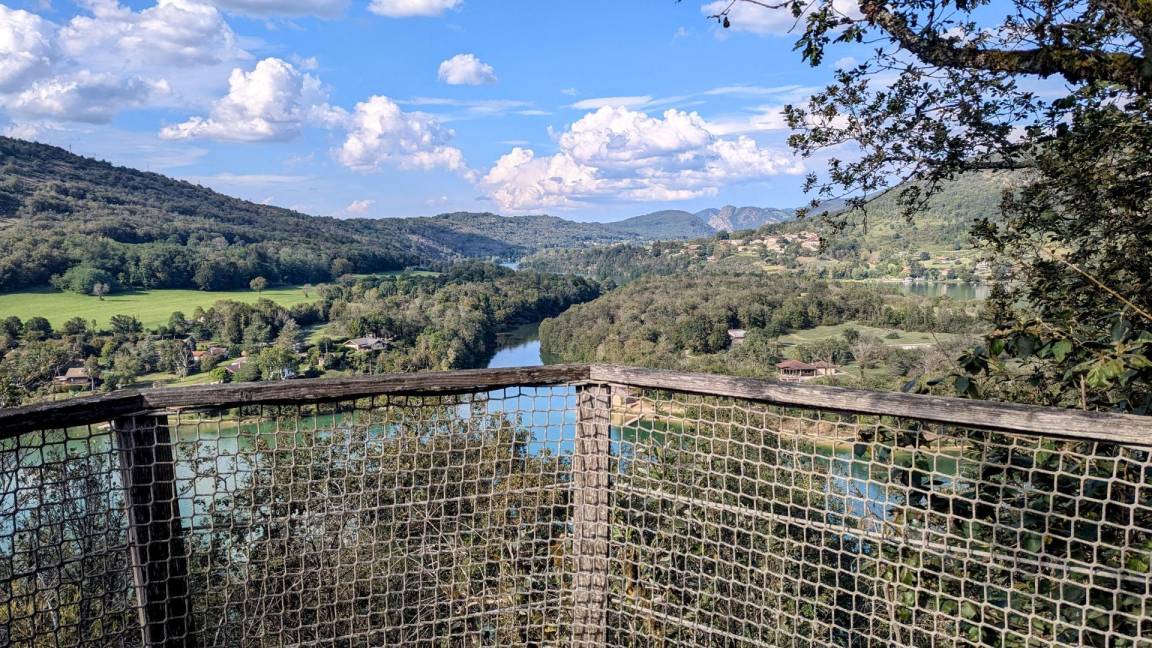 mit Panoramablick auf den Fluss Ain und die Insel Chambod. Seine abgerundete Terrasse ist mit seinem Essbereich und den Liegestühlen ein echtes Wohnzimmer. Es ist der untergehenden Sonne ausgesetzt und im Sommer ist die Ausstellung von Mittag bis Abend. Ein großer Erker teilt sich das Äußere des Hauptwohnzimmers, bestehend aus einem Essbereich mit roter Bank und einer Küchenzeile (2 Kochplatten