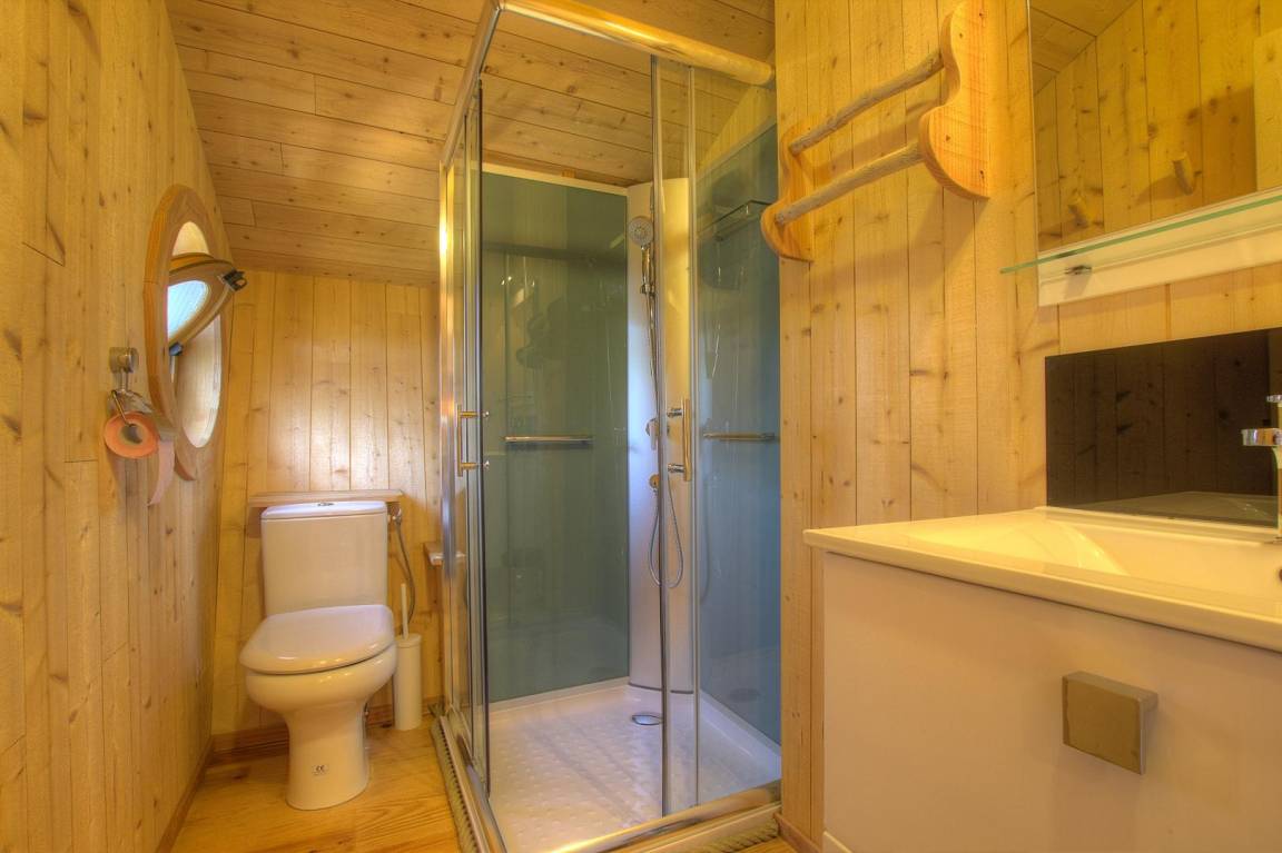 Auf halber Höhe, zwischen Sapinière und Fustière, bietet die 23 m² große Genévrière-Hütte zweifellos eine der schönsten Aussichten auf das Gelände am Fluss Ain. Sobald Sie ankommen, wird das Dekor mit dieser großen, sicheren Holztreppe festgelegt, die Sie erklimmen müssen, um auf die 15 m² große Terrasse zu gelangen. Ihre Fläche ist fast so groß wie die Kabine! Die rechteckige Terrasse steht stolz in ihrer grünen Umgebung und taucht auf die Rivière d'Ain ein. Die Terrasse ist der aufgehenden Sonne ausgesetzt und badet bis 14:00 Uhr in der Sonne. Getrennt durch ein Erkerfenster, das Innere der Kabine ist charmant mit seinen drei Räumen: auf dem rechte Seite , auf der Eingabe, ein Essbereich mit Küchenzeile (2 Ceranfelder, 1 Kühlschrank, 1 Mikrowelle) und seinem „Garten" Tisch Anis. Am Boden 1 sichtbar Schlafraum mit Etagenbetten (90 cm) mit Schutznetzen, auf der linken Seite bei der Eingabe 1 „unsichtbar" Schlafplatz für 2 Personen , die ermöglicht, das Bett einmal in dem Rahmen gefalte