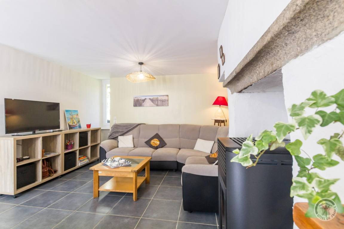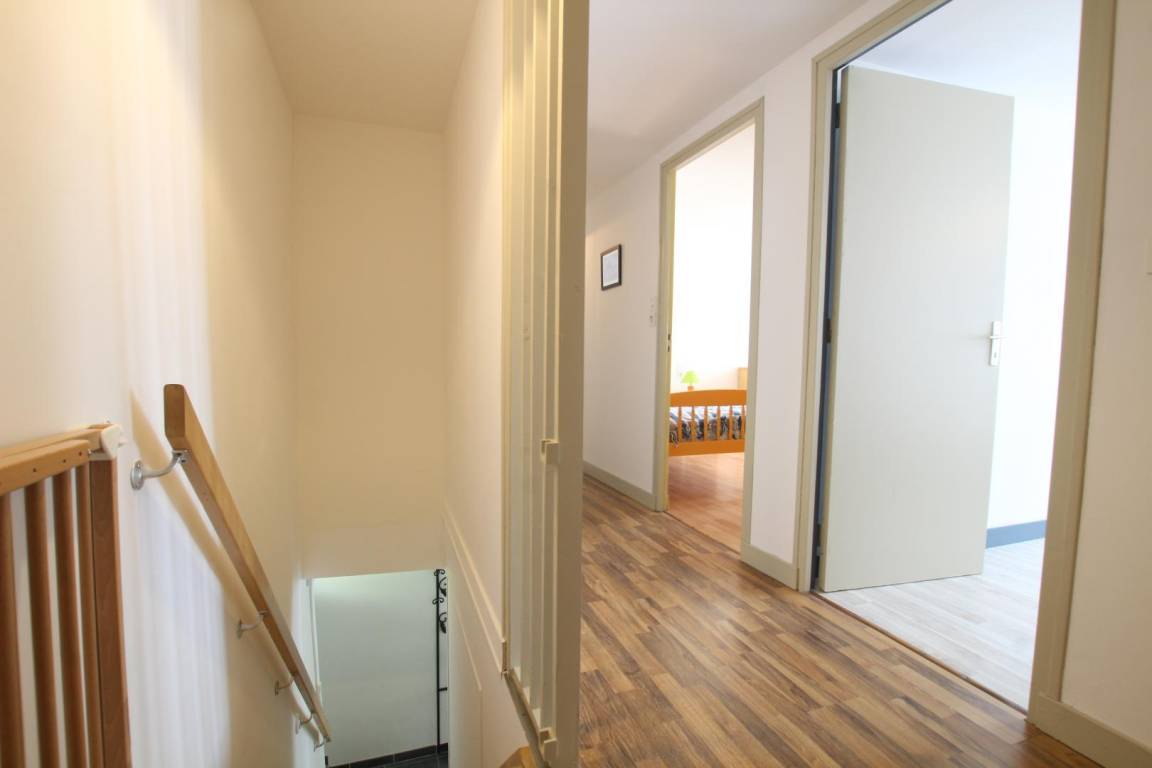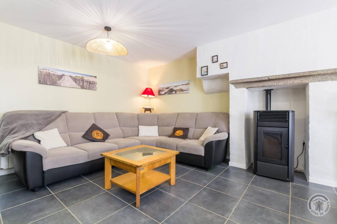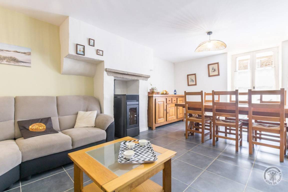 Doppelhaushälfte. Wohnzimmer mit Pelletofen (TV). Offene Küche (Induktionskochfeld, Dunstabzugshaube, Backofen, Geschirrspüler, Mikrowelle, amerikanischer Kühlschrank mit Gefrierfach). Eine Stufe führt zum separaten WC (mit Waschmaschine) und zum Gartenzugang. Obergeschoss: Schlafzimmer 1 (Doppelbett 140x190 cm). Schlafzimmer 2 (zwei Etagenbetten 90x190 cm + ein Einzelbett 90x190 cm). Schlafzimmer 3 (Doppelbett 140x190 cm). Badezimmer (Doppelwaschbecken). Separates WC. Babyausstattung auf Anfrage. Elektrische Heizung inklusive. Alle Nebenkosten außer Pellets inklusive. Bettwäsche inklusive (inkl. Geschirrtücher). Handtücher werden nicht gestellt. Reinigungsservice gegen Aufpreis. Privater, umzäunter Garten. Terrasse. Gartenmöbel. Sonnenliegen. Grill. Unterstand. Parkplatz. 4 Fahrräder (2 für Erwachsene und 2 mittelgroße).
