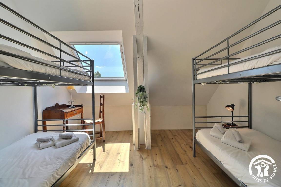 ein Schlafzimmer mit vier 90x200-Etagenbetten,