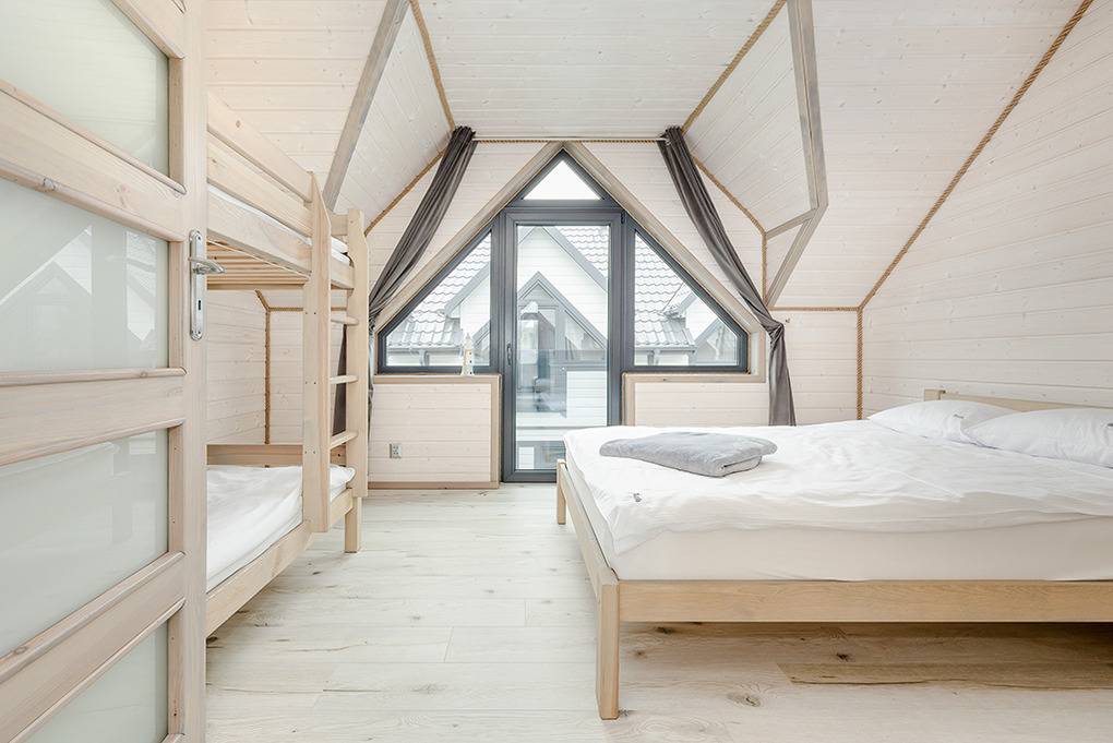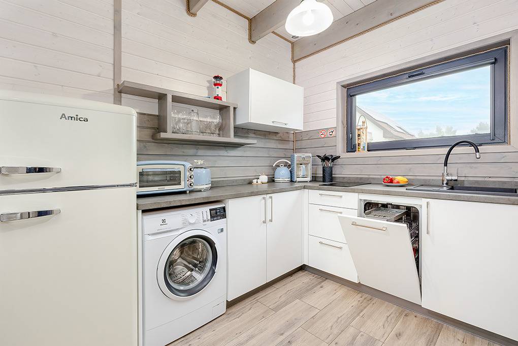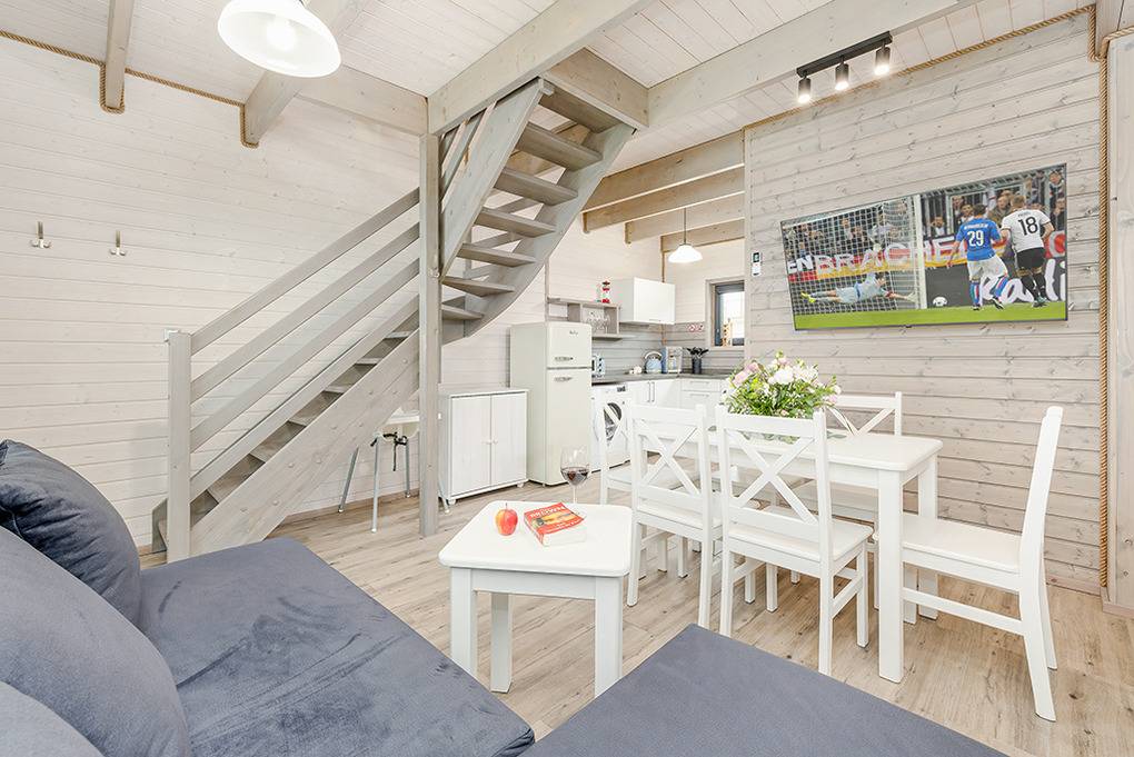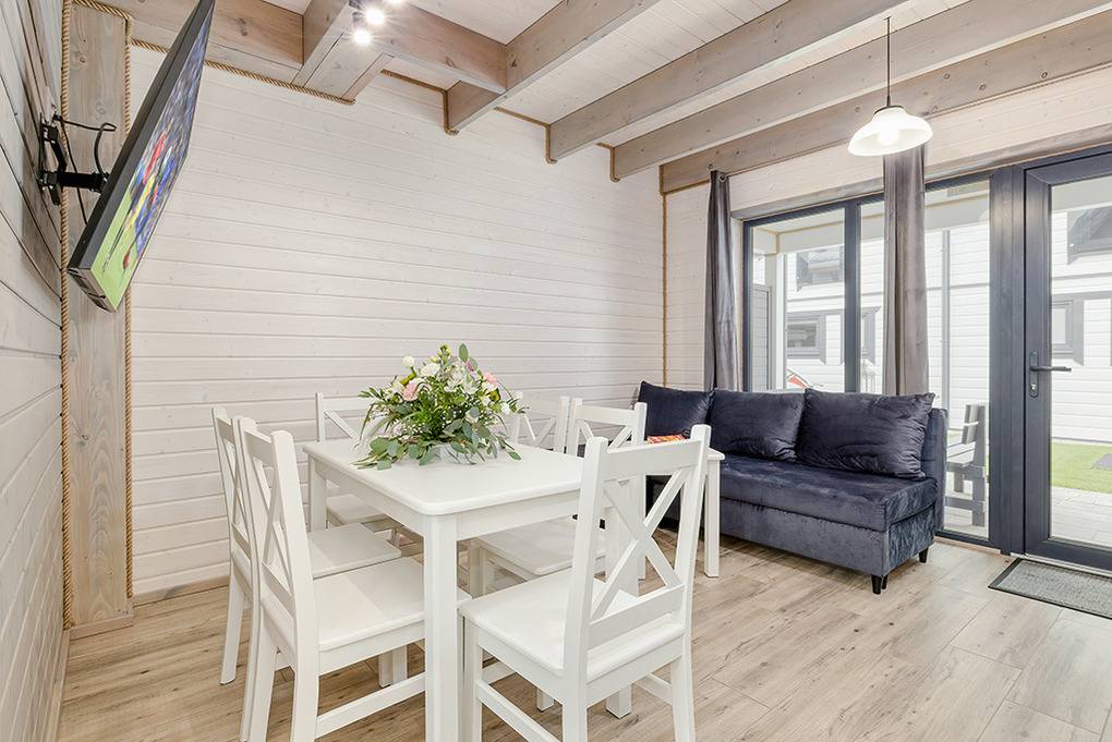 PL 51.10 Ferienhaus 2-9 Pers.: Stilvolles 3-Zimmer-Reihenhaus mit ca. 59 qm Wohnfläche über 2 Etagen. Schöner Wohn-/Essraum mit weißer Holzbalkendecke, bodentiefem Fenster, Klimaanlage mit Heizfunktion, Sofa (Ausziehcouch 2 Pers.), SMART Sat-TV (dt. Programme), Esstisch, Küchenzeile (2 Platten Ceranfeld, Mikrowelle, Spülmaschine, Waschmaschine). Bad: Du, Wb, WC. Vom Wohnraum Holztreppe ins Dachgeschoss: 4-Bettzimmer mit franz. Doppelbett, Etagenbett. 4-Bettzimmer mit franz. Doppelbett, Etagenbett. Bad: Wb, WC. Überdachte Terrasse mit Sitzmöbeln und Grill.