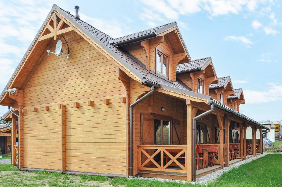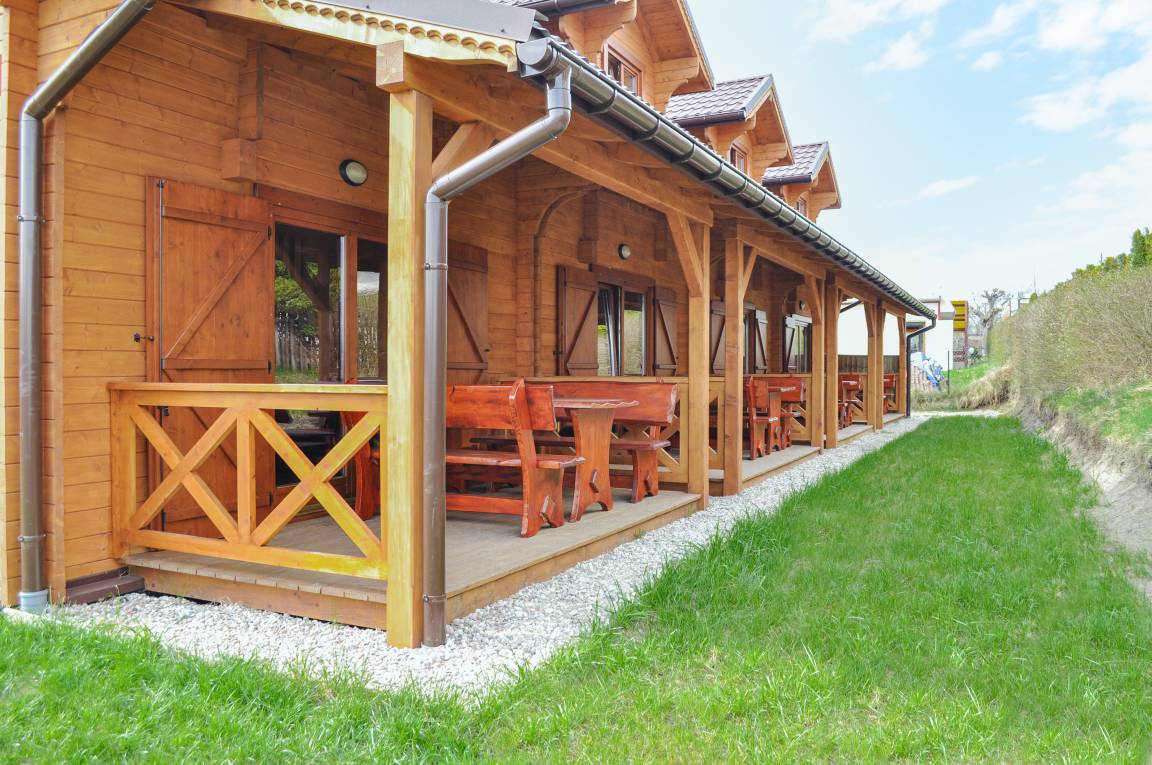 Haus: Kleine, gepflegte Ferienhausanlage mit 4 Wohneinheiten. Rustikale Reihenhäuser mit Holzbalkendecke. Kostenloser Internetzugang über WLAN. Heizung über E-Radiatoren (2 Radiatoren/ Reihenhaus). Warmwasser über E-Boiler (60 l). Überdachte Terrasse. 1 PKW-Stellplatz/Ferienhaus.