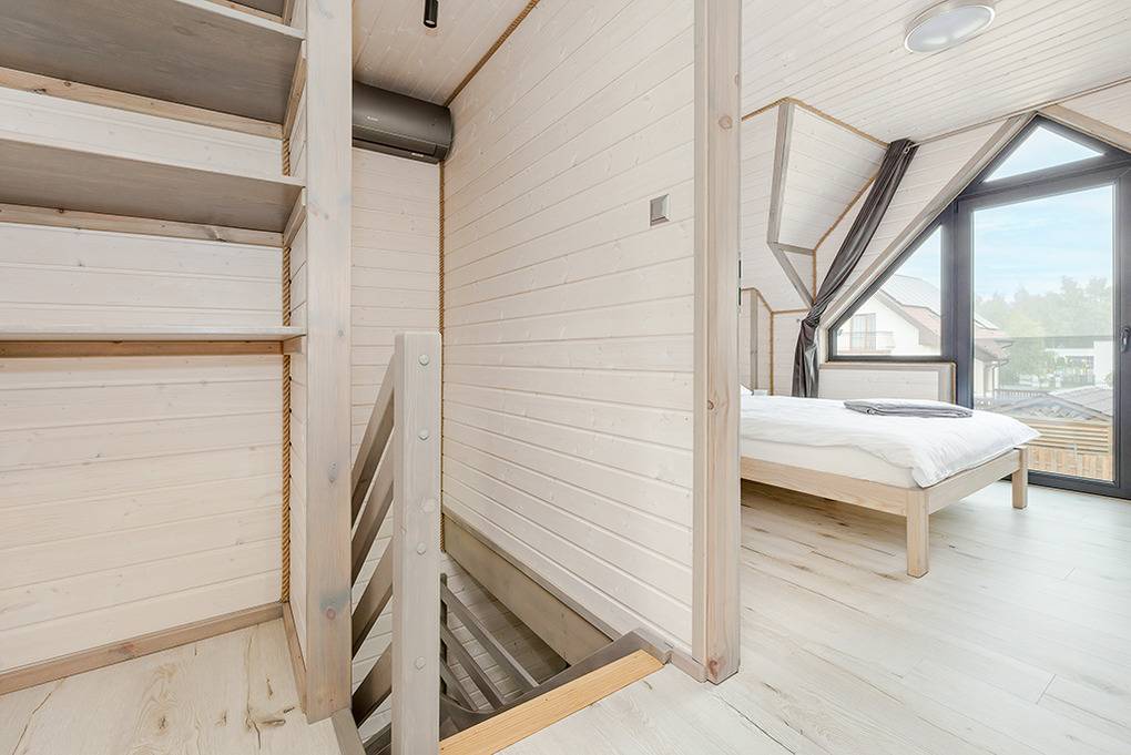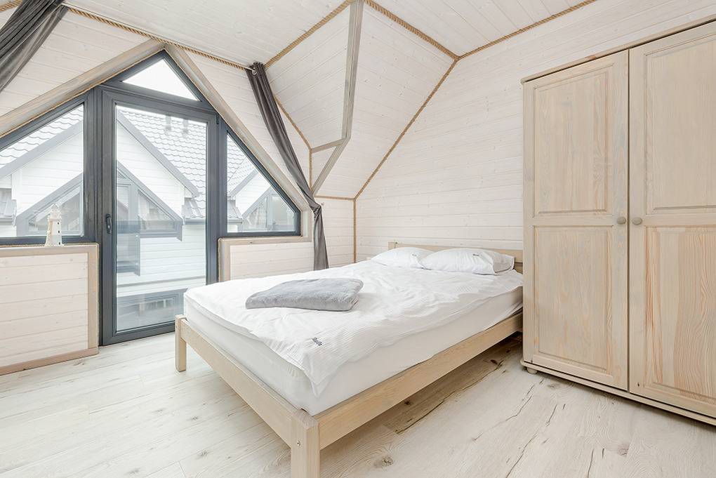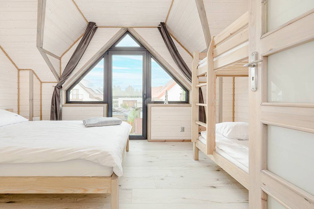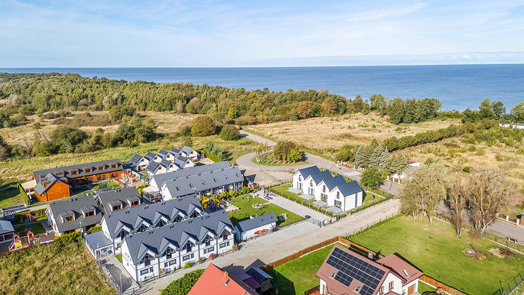 PL 51.10 Ferienhaus 2-9 Pers.: Stilvolles 3-Zimmer-Reihenhaus mit ca. 59 qm Wohnfläche über 2 Etagen. Schöner Wohn-/Essraum mit weißer Holzbalkendecke, bodentiefem Fenster, Klimaanlage mit Heizfunktion, Sofa (Ausziehcouch 2 Pers.), SMART Sat-TV (dt. Programme), Esstisch, Küchenzeile (2 Platten Ceranfeld, Mikrowelle, Spülmaschine, Waschmaschine). Bad: Du, Wb, WC. Vom Wohnraum Holztreppe ins Dachgeschoss: 4-Bettzimmer mit franz. Doppelbett, Etagenbett. 4-Bettzimmer mit franz. Doppelbett, Etagenbett. Bad: Wb, WC. Überdachte Terrasse mit Sitzmöbeln und Grill.