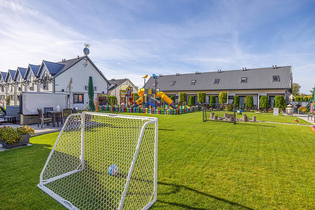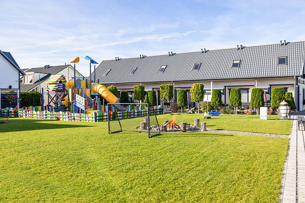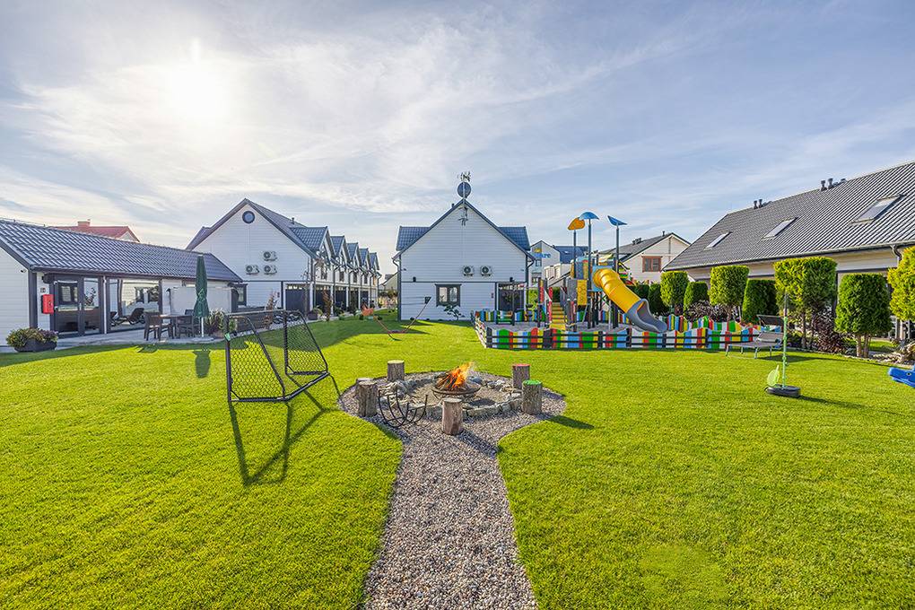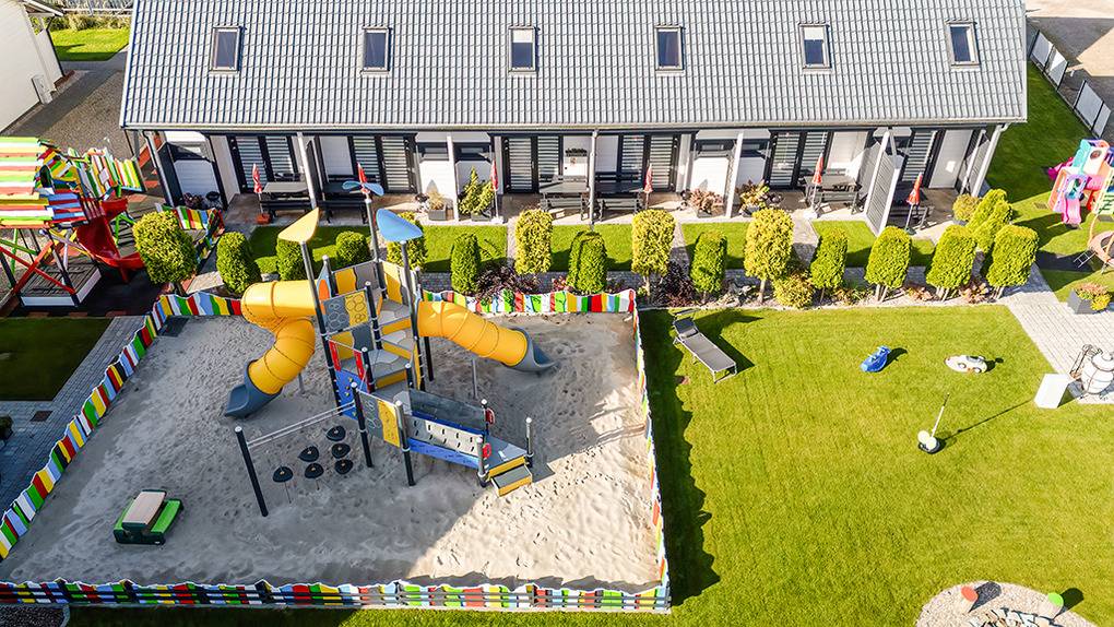 Haus: Gepflegte Ferienhausanlage mit insgesamt 19 schönen Reihenhäusern, 2017 - 2023 erbaut. In der Anlage: Rezeption. Zwei Kinderspielplätze mit Schaukeln, Rutschen, Klettergerüsten, Wippen, Sandkasten. Überdachte Spielecke für Kleinkinder. Tischtennis. Kickertisch, Fahrradverleih. Sauna, Whirlpool (Gebühr). Lagerfeuerstelle.
