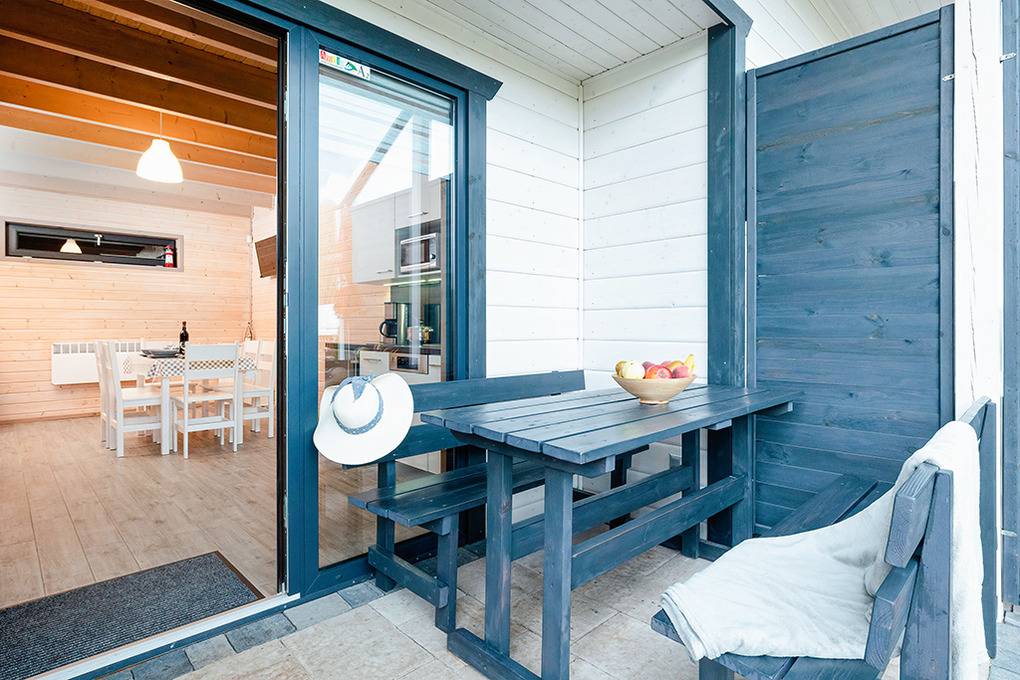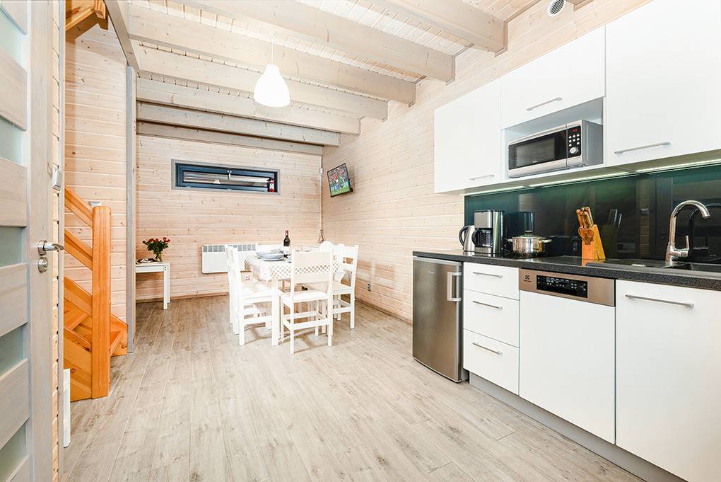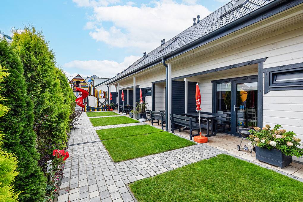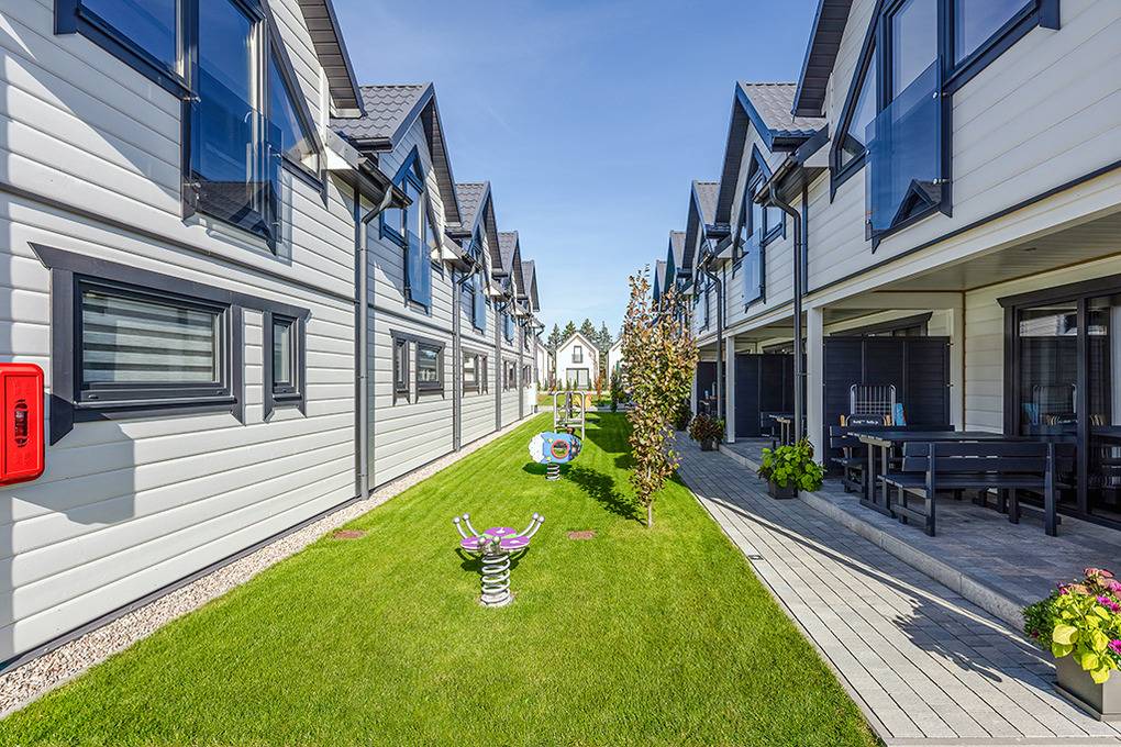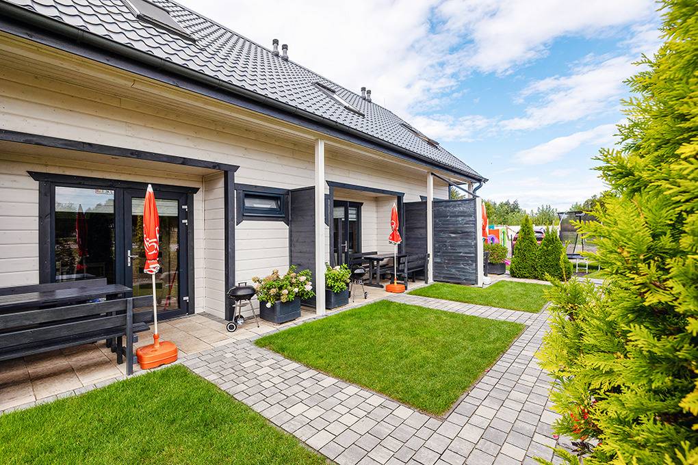 Elegante Reihenhäuser mit geschmackvoller Einrichtung. Kostenloses Internet über WLan. Waschmaschine. E-Heizung, Warmwasser über E-Boiler (100 l). Überdachte Terrasse mit Sitzmöbeln, Grill, davor kleine Rasenfläche. 1 Parkplatz/Ferienhaus inklusiv, zweiter Parkplatz (Gebühr).