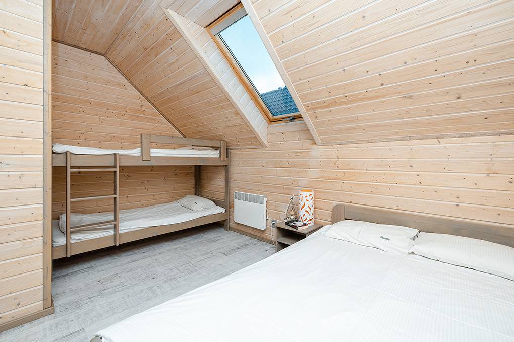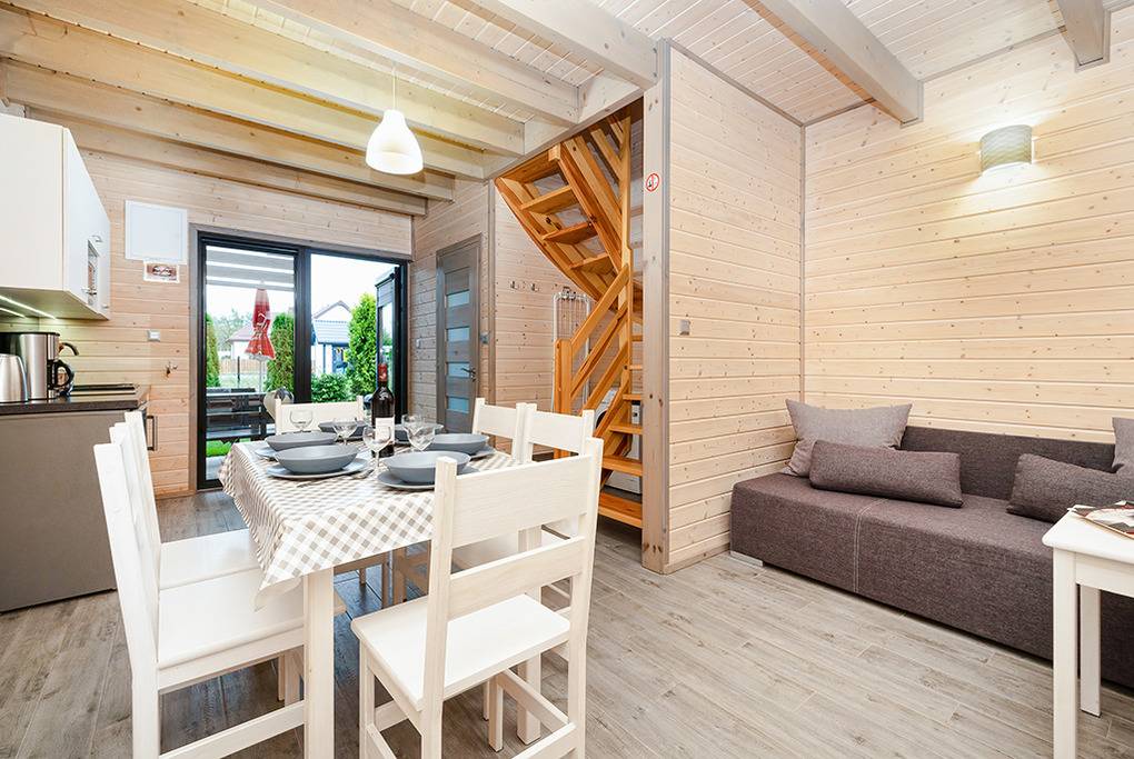 PL 51.8 Ferienhaus 2-9 Pers.: Stilvolles 3-Zimmer-Reihenhaus mit ca. 55 qm Wohnfläche über 2 Etagen. Schöner Wohn-/Essraum mit weißer Holzbalkendecke, bodentiefem Fenster, Klimaanlage mit Heizfunktion, Sofa (Ausziehcouch 2 Pers.), Sat-TV (dt. Programme), Esstisch, Küchenzeile (2 Platten Ceranfeld, Mikrowelle, Spülmaschine, Waschmaschine). Bad: Du, Wb, WC. Vom Wohnraum Holztreppe ins Dachgeschoss: 3-Bettzimmer mit franz. Doppelbett, Einzelbett. 4-Bettzimmer mit franz. Doppelbett, Etagenbett.