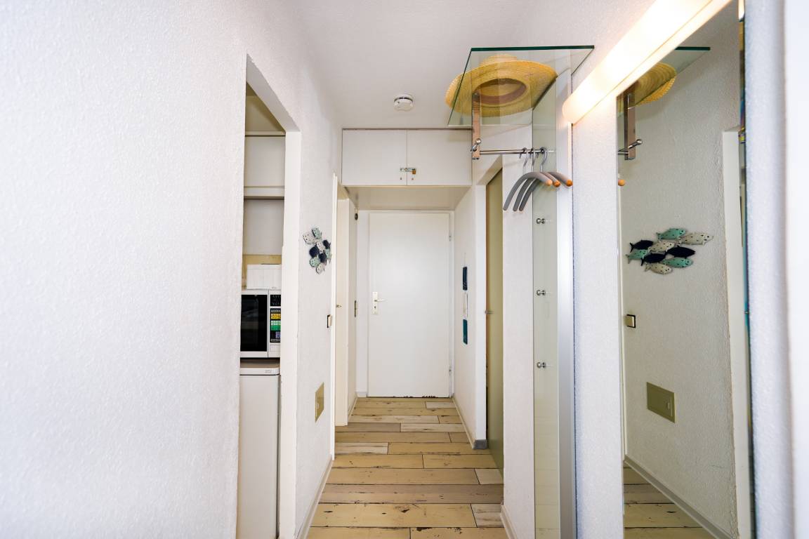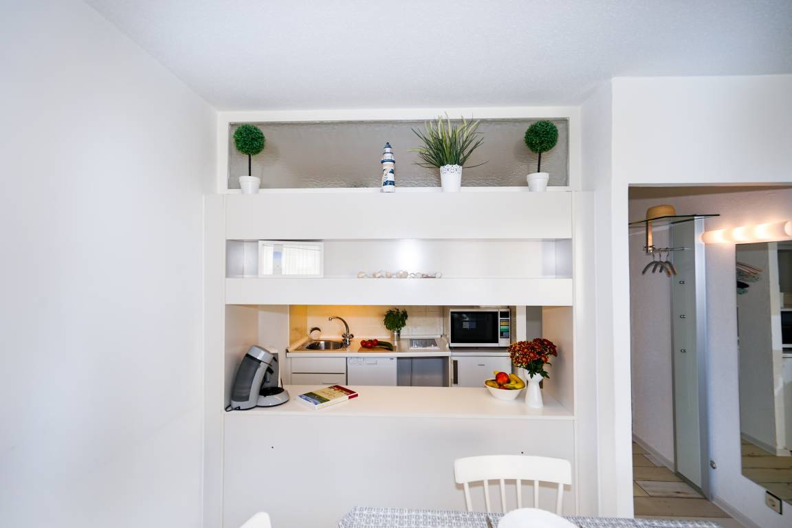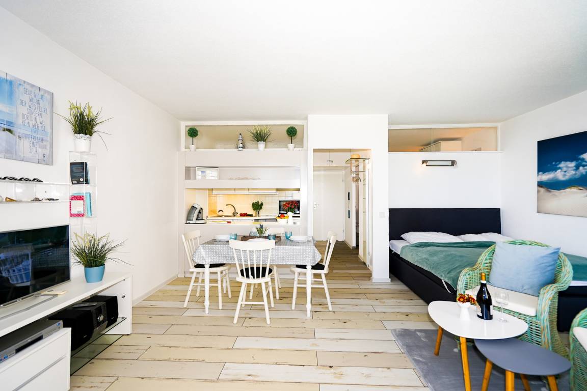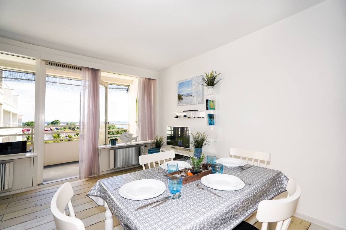 Die ruhige und 40 Quadratmeter große Ferienwohnung bietet Platz für 2 bis 4 Urlaubsgäste. Über einen Fahrstuhl kann die in der 4. Etage gelegene Wohnung bequem erreicht werden. In dem hellen und gemütlich eingerichteten Wohnzimmer ist eine moderne Küche integriert. Diese enthält neben allen Kochutensilien auch eine komfortable Spülmaschine. Eine Essecke, eine bequeme Schlafcouch sowie ein großer Flachbildfernseher befinden sich ebenfalls im Wohnraum. Das Schlafzimmer ist mit zwei Einzelbetten eingerichtet. Das Badezimmer verfügt über eine Dusche. Von dem mit wetterfesten Möbeln ausgestatteten Balkon eröffnet sich eine Aussicht auf das Meer in Richtung der Ortschaft Pelzerhaken. Bis zum Ostseestrand sind es nur 3 Gehminuten. Haustiere sind in der Wohnung herzlich willkommen. Die nähere Umgebung bietet reichlich Auslauf für die Vierbeiner und daher beste Bedingungen für einen Urlaub mit Hund. Für das Auto steht ein Außenstellplatz bereit. Da Rauchen in der Ferienwohnung nicht erwünscht ist, wird gebeten, Zigaretten nur auf dem Balkon mit Traumblick auf die Ostsee zu rauchen. LAGE Die im Ferienpark Sierksdorf liegende Wohnung befindet sich direkt am Strand. Auf dem Weg bis zum 100 Meter entfernten Ostseestrand muss keine störende Straße überquert werden. Der Urlaub mit Hund wird ebenfalls zu einem Erlebnis am nahegelegenen Hundestrand. Dort dürfen sich die Vierbeiner ohne Leinenzwang austoben. Um die benötigten Utensilien für ein morgendliches Frühstück auf der Terrasse zu besorgen, genügt ein kurzer Spaziergang zum Kiosk des Ferienparks. Weitere Einkaufsmöglichkeiten und Supermärkte liegen etwa 3 Kilometer entfernt. Für einen abwechslungsreichen Urlaub an der Ostsee sorgen die zahlreichen Attraktionen in der Umgebung. Ein Sportflugplatz mit Rundflugangebot, Schwimmbäder, Restaurants mit einem vielfältigen Angebot an fangfrischem Fisch sind nur einige Möglichkeiten, den Ostseeurlaub erlebnisreich zu gestalten. Nahegelegene Sport- und Freizeitmöglichkeiten bereichern die Ferientage auf vielfältige Weise. Ob Bowling, Tennis, Wandern, Segeln oder Rundflüge über die Lübecker-Bucht, der erlebnisreichen Gestaltung des Ostseeurlaubs sind kaum Grenzen gesetzt. Zu den größten Attraktionen gehört der Hansapark, ein familienorientierter Freizeitpark, der weit über die Grenzen der Region bekannt ist und nur wenige Gehminuten entfernt liegt. Zahlreiche Restaurants für den Hunger zwischendurch wie auch mit einem Angebot an regionalen Gerichten befinden sich an der nahegelegenen Strandpromenade [&] in der näheren Umgebung. Sierksdorf ist auch ein idealer Startpunkt um die Lübecker Bucht zu entdecken. So lassen sich beispielsweise viele Badeorte bequem von Sierksdorf aus erreichen.