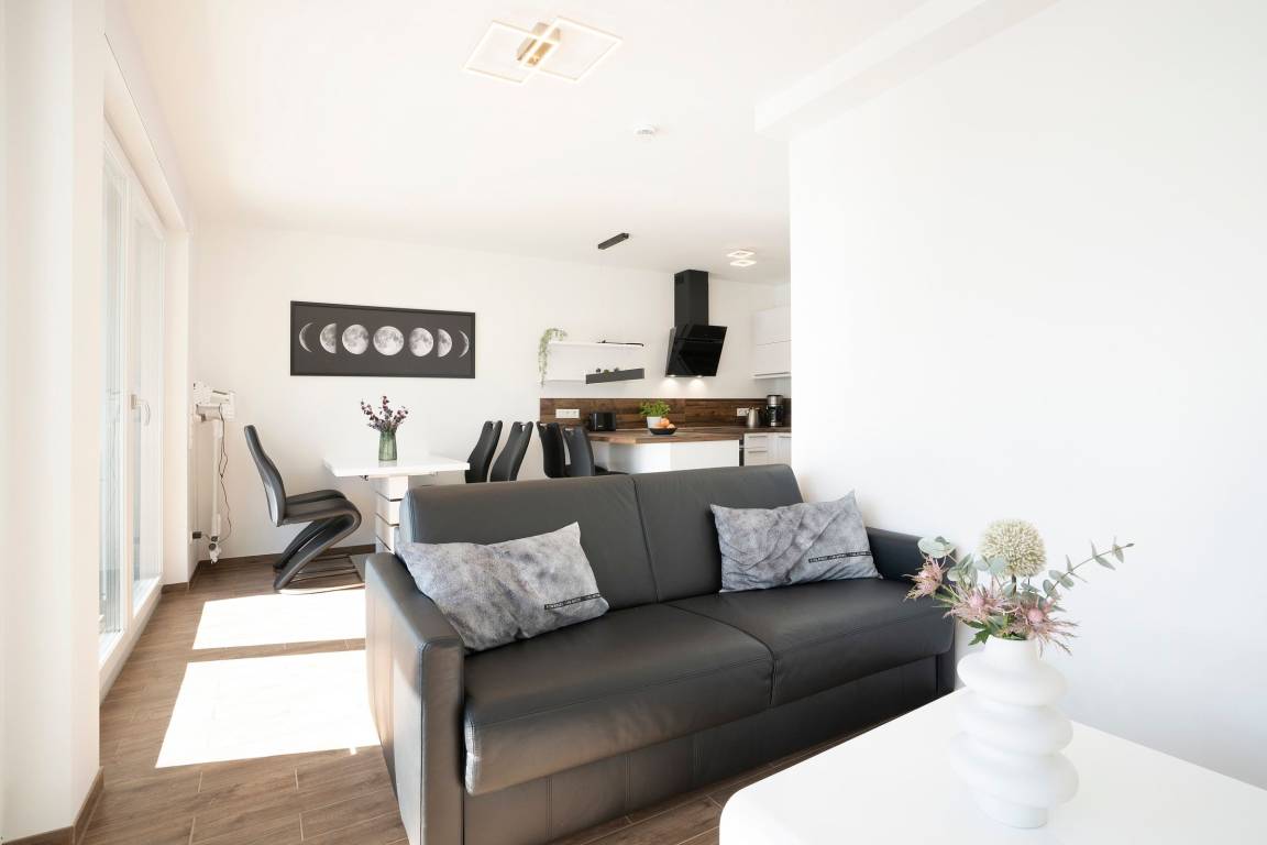 Der stilvoll eingerichtete Wohnbereich mit bequemen Sofa (Schlafmöglichkeit für 2 Personen, 140x200 cm) und Flachbildfernseher grenzt offen an den Essbereich mit ausreichend Platz für alle Gäste. Von hier aus gelangen Sie auf den möblierten Balkon mit Süd-Ost-Ausrichtung. In der vollausgestatteten Küche können Sie köstliche Urlaubsmahlzeiten zubereiten. Das separate Schlafzimmer ist mit einem Boxspring-Doppelbett (180x200 cm), TV und einem Kleiderschrank ausgestattet. Für Verdunkelung sorgen elektrische Außenrollläden. Genießen Sie den Komfort einer bodengleichen Dusche im modernen Badezimmer.