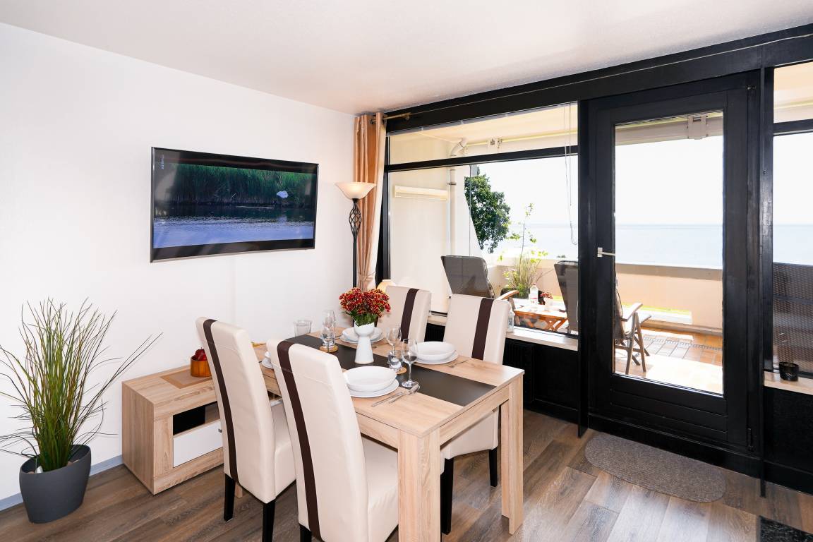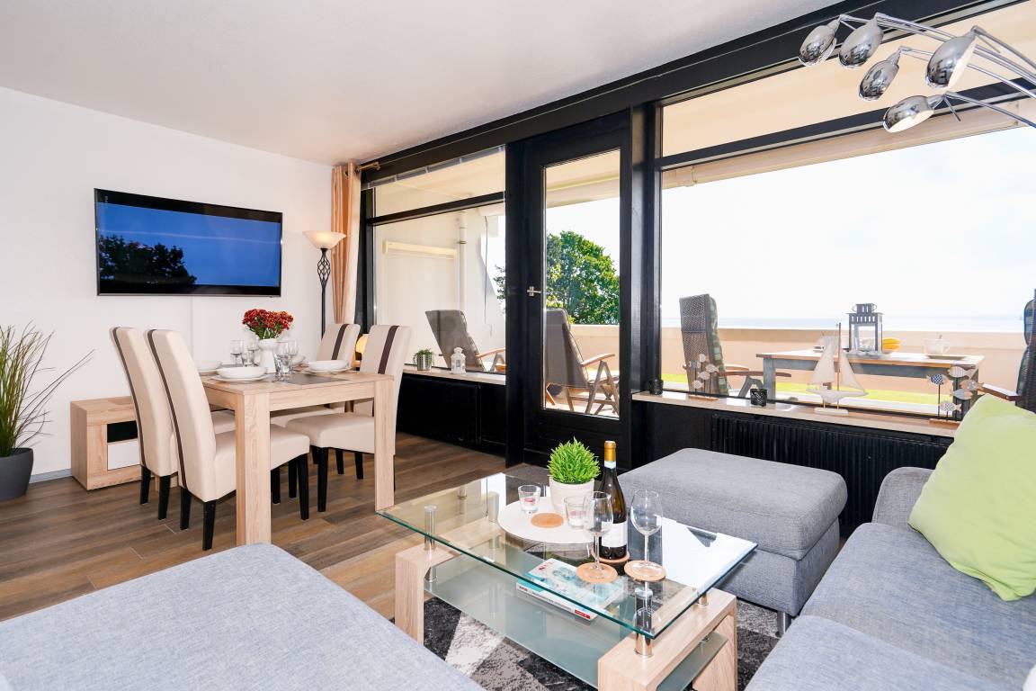 Die 50 Quadratmeter große Wohnung ist ebenerdig vom Parkplatz aus ganz einfach zu erreichen. Der Traumblick auf die Ostsee kann von dem etwa 16 Quadratmeter großen Balkon aus genossen werden. Das gemütlich eingerichtete Wohnzimmer verfügt über einen Essbereich sowie über eine Sitzgruppe. Die offene Küche wird durch eine kleine Bar vom Wohnraum abgeteilt und enthält alle Geräte und Utensilien für die Zubereitung der eigenen Mahlzeiten. Ein großer Flachbildfernseher und ein Radio gehören zur weiteren Ausstattung der Wohnung. Ein modernes Bad mit Dusche, Schlafzimmer mit Einzelbetten sowie zweitem Schlafzimmer mit Einzelbett und Diele sorgen ebenfalls für Wohnkomfort während des Ostseeurlaubs. Haustiere sind in der Wohnung leider nicht willkommen. Für das Auto steht ein Außenstellplatz bereit. Da Rauchen in der Ferienwohnung nicht erwünscht ist, wird gebeten, Zigaretten nur auf dem Balkon mit Traumblick auf die Ostsee zu rauchen. LAGE Die im Ferienpark Sierksdorf liegende Wohnung befindet sich direkt am Strand. Auf dem Weg bis zum 30 Meter entfernten Ostseestrand muss keine störende Straße überquert werden. Der Urlaub mit Hund wird ebenfalls zu einem Erlebnis am nahegelegenen Hundestrand. Dort dürfen sich die Vierbeiner ohne Leinenzwang austoben. Um die benötigten Utensilien für ein morgendliches Frühstück auf dem Balkon zu besorgen, genügt ein kurzer Spaziergang zum Kiosk des Ferienparks. Weitere Einkaufsmöglichkeiten und Supermärkte liegen etwa 3 Kilometer entfernt. Für einen abwechslungsreichen Urlaub an der Ostsee sorgen die zahlreichen Attraktionen in der Umgebung. Ein Sportflugplatz mit Rundflugangebot, Schwimmbäder, Restaurants mit einem vielfältigen Angebot an fangfrischem Fisch sind nur einige Möglichkeiten, den Ostseeurlaub erlebnisreich zu gestalten. Nahegelegene Sport- und Freizeitmöglichkeiten bereichern die Ferientage auf vielfältige Weise. Ob Bowling, Tennis, Wandern, Segeln oder Rundflüge über die Lübecker-Bucht, der erlebnisreichen Gestaltung des Ostseeurlaubs sind kaum Grenzen gesetzt. Zu den größten Attraktionen gehört der Hansapark, ein familienorientierter Freizeitpark, der weit über die Grenzen der Region bekannt ist und nur wenige Gehminuten entfernt liegt. Zahlreiche Restaurants für den Hunger zwischendurch wie auch mit einem Angebot an regionalen Gerichten befinden sich an der nahegelegenen Strandpromenade [&] in der näheren Umgebung. Sierksdorf ist auch ein idealer Startpunkt um die Lübecker Bucht zu entdecken. So lassen sich beispielsweise viele Badeorte bequem von Sierksdorf aus erreichen.